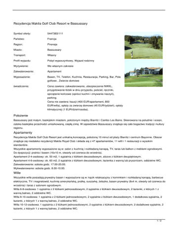 Rezydencja Makila Golf Club Resort w Bassussary Symbol oferty: 5447383/111 Państwo: Francja Region: Pireneje Miasto: Bassussary Transport: Własny Profil wyjazdu: Pobyt wypoczynkowy, Wyjazd rodzinny Wyżywienie: We własnym zakresie Zakwaterowanie: Apartament Wyposażenie: Basen, TV, Telefon, Kuchnia, Restauracja, Parking, Bar, Pole świadczenia: Cena zawiera: zakwaterowanie, ubezpieczenie NWKL, golfowe , Zwierze domowe przygotowanie łóżek w dniu przyjazdu, pościel, ręczniki, sprzątanie końcowe (oprócz kuchni i zmywania naczyń), parking. Cena nie zawiera: kaucji (400 EUR/apartament, 800 EUR/willa), opłaty za zwierzę domowe (45 EUR/tydzień), opłaty klimatycznej (1 EUR/dzień/osoba). Położenie Bassussary jest małym, baskijskim miastem, położonym między Biarritz i Cambo Les Bains. Skierowana na południe i ocean, zatoka baskijska przechodzi umiarkowaną, ciepłą zimę. W sąsiedztwie Bassussary znajduje się całe bogactwo tradycji i kultury regionu. Apartamenty Rezydencja Makila Golf Club Resort jest unikalną koncepcją, położoną 10 minut od plaży Biarritz i centrum Bayonne. Obszar znajduje się niedaleko rezydencji Makila Royal Club i składa się z 47 apartamentów, 11 willi i 1 restauracji o wysokim standardzie. Wszystkie apartamenty wyposażone są w: salon z kuchnią i rozkładaną kanapą, TV, taras lub balkon z meblami ogrodowymi. Do dyspozycji: pralnia i basen (16x10 m, otwarty od czerwca do września). Apartament 2-4-osobowy: ok. 50 m2, 1 sypialnia z łóżkiem dwuosobowym, alcove z łóżkiem dwupiętrowym. Apartament 4-6-osobowy: ok. 60 m2, 2 sypialnie z łóżkiem dwuosobowym, łazienka z wanną lub prysznicem, oddzielne WC. Zakwaterowanie: sobota godz. 17.00-20.00. Wykwaterowanie: sobota godz. 8.00-10.00. Wille Wszystkie wille posiadają prywatny basen i wyposażone są w: kącik relaksacyjny z kominkiem i rozkładaną kanapą, barbecue elektryczne, TV i magnetowid, kuchnię amerykańską, pralkę, suszarkę, żelazko, basen prywatny (8x4 m, otwarty od czerwca do września) i taras z salonem ogrodowym. Willa 6-8-osobowa: 1 sypialnia z 2 łóżkami jednoosobowymi, 2 sypialnie z łóżkiem dwuosobowym, 2 łazienki, z których 1 z wanną balneo, 2 oddzielne WC. Willa 8-10-osobowa: 1 sypialnia z 2 łóżkami jednoosobowymi, 2 sypialnie z łóżkiem dwuosobowym, 1 dodatkowa sypialnia, 2 łazienki, z których 1 z wanną balneo, 2 oddzielne WC. Willa 10-12-osobowa: 1 sypialnia z 2 łóżkami jednoosobowymi, 2 sypialnie z łóżkiem dwuosobowym, 2 dodatkowe sypialnie, 2 łazienki, z których 1 z wanną balneo, 2 oddzielne WC. 1/2 Zakwaterowanie: sobota godz. 17.00-20.00. Wykwaterowanie: sobota godz. 8.00-10.00. TERMINY: od: 2017-11-04 do: 2017-11-11 (8 dni), miejsca: zamów cena od: 633 PLN = 145 EUR od: 2017-11-04 do: 2017-11-18 (15 dni), miejsca: zamów cena od: 1266 PLN = 290 EUR od: 2017-11-11 do: 2017-11-18 (8 dni), miejsca: zamów cena od: 633 PLN = 145 EUR od: 2017-11-11 do: 2017-11-25 (15 dni), miejsca: zamów cena od: 1266 PLN = 290 EUR od: 2017-11-18 do: 2017-11-25 (8 dni), miejsca: zamów cena od: 633 PLN = 145 EUR od: 2017-11-18 do: 2017-12-02 (15 dni), miejsca: zamów cena od: 1266 PLN = 290 EUR od: 2017-11-25 do: 2017-12-02 (8 dni), miejsca: zamów cena od: 633 PLN = 145 EUR od: 2017-11-25 do: 2017-12-09 (15 dni), miejsca: zamów cena od: 1266 PLN = 290 EUR od: 2017-12-02 do: 2017-12-09 (8 dni), miejsca: zamów cena od: 633 PLN = 145 EUR od: 2017-12-02 do: 2017-12-18 (17 dni), miejsca: zamów cena od: 1266 PLN = 290 EUR od: 2017-12-09 do: 2017-12-18 (10 dni), miejsca: zamów cena od: 633 PLN = 145 EUR CENNIK: Długość pobytu: 15 dni 8 dni 17 dni 10 dni Grupa cenowa: B B B B 2730 1365 1386 693 2394 1197 2240 1120 1106 553 7 14 7 2.4 % 2.4 % 2.4 % Pobyt w obiekcie (do wyboru) Villa 8-10-osobowa standardowo dla osób: 10 minimalnie: 8 2730 1365 apartament 4-6-osobowy standardowo dla osób: 6 minimalnie: 4 1386 693 Villa 6-8-osobowa standardowo dla osób: 8 minimalnie: 6 2394 1197 Villa 10-12-osobowa standardowo dla osób: 12 minimalnie: 10 2240 1120 (*) apartament 2-4-osobowy standardowo dla osób: 4 minimalnie: 2 1106 553 Ubezpieczenie (do wyboru) (*) ubezpieczenie NWKLSKI Ubezpieczenie (opcjonalne) 14 ubezpieczenie od kosztów rezygnacji 2.4 % Waluta: EUR Aktualne ceny z systemu S.A.R.T. (-) - cena usługi, podatku kalkulowana przy osobie lub gratis (*) - kwota wliczona w cenę standardową 2/2