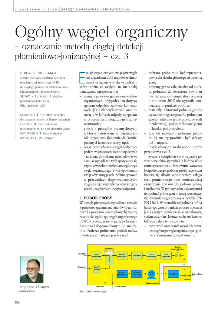 laboratorium 11-12/2009 |sprzęt i a pa r at u r a l a b o r ato r yj n a Ogólny węgiel organiczny – oznaczanie metodą ciągłej detekcji płomieniowo-jonizacyjnej – cz. 3 Streszczenie Artykuł opisuje podstawy działania detektora płomieniowo-jonizacyjnego (FID) do ciągłego pomiaru w zastosowaniach laboratoryjnych i przemysłowych. Słowa kluczowe detektor płomieniowo-jonizacyjny, FID, analizator LZO Summary The article describes the operation basics of Flame Ionization Detector (FID) for continuous measurement in lab and industrial usage. Key words flame ionization detector, FID, LZO analyzer E misja organicznych związków węgla jest zjawiskiem dość rozpowszechnionym i występuje w wielu wypadkach, które można ze względu na metodykę oznaczania zgrupować na: – emisję z procesów spalania materiałów organicznych; przypadek ten dotyczy spalarni odpadów zarówno komunalnych, jak i niebezpiecznych oraz instalacji, w których odpady są spalane w procesie technologicznym (np. cementownie); – emisję z procesów przemysłowych, w których stosowane są rozpuszczalniki organiczne (lakiernie, drukarnie, przemysł farmaceutyczny itp.); – organiczne połączenia węgla będące odpadem w procesach technologicznych – rafinerie, powlekanie materiałów żywicami; w wypadkach tych spotykamy się często z wysokimi stężeniami ogólnego węgla organicznego i występowaniem związków mogących polimeryzować w przewodach doprowadzających; do grupy tej należy zaliczyć również gazy przed urządzeniami oczyszczającymi. Pobór próby W dwóch pierwszych wypadkach (emisja z procesów spalania materiałów organicznych i z procesów przemysłowych) analizę zawartości ogólnego węgla organicznego (OWO) prowadzi się w gazie pobranym z emitera i doprowadzonym do analizatora. Podczas pobierania próbek należy przestrzegać następujących zasad: mgr Leszek Szapert p rezes LAT Sp. z o.o. 56 Rys. 1. Układ rozcieńczający – pobrana próba musi być reprezentatywna dla składu głównego strumienia gazu, – pobrany gaz na całej drodze od punktu pobrania do detektora powinien być ogrzany do temperatury wyższej o minimum 20°C niż wynosiła temperatura w punkcie poboru, – materiały, z którymi pobrany gaz się styka, nie mogą reagować z pobranym gazem, zalecane jest stosowanie stali nierdzewnej, politetrafluoroetylenu i fluorku polipropylenu, – czas od momentu pobrania próby do jej analizy powinien być krótszy niż 1 minuta. Przykładowy zestaw do poboru próby przedstawia rys. 2. Sytuacja komplikuje się w wypadku gazów o wysokim stężeniu lub bardzo silnie zanieczyszczonych. Stosowanie wówczas bezpośredniego poboru próby zazwyczaj kończy się silnym zabrudzeniem całego toru pomiarowego oraz koniecznością czyszczenia zestawu do poboru próby, i analizatora. W tym wypadku najkorzystniej jest pobrać próbę gazu metodą rozcieńczania dynamicznego opisaną w normie PNEN 13649. W metodzie tej pobrana próba badanego gazu w punkcie poboru mieszana jest z czystym powietrzem w określonym, stałym stosunku i kierowana do analizatora. Główne zalety tej metody to: – możliwość oznaczania wysokich zawartości ogólnego węgla organicznego zgodnie z wymogami normatywnymi, s p r z ę t i a pa r at u r a l a b o r ato r yj n a |laboratorium 11-12/2009 pary wodnej nie większa niż 5 g/kg gazów odlotowych), oznaczanych jako m3/h. Stężenie OWO w gazach odlotowych jest wyrażone w miligramach substancji na metr sześcienny gazów odlotowych odniesiony do warunków umownych, oznaczanych jako mg/m3: Rys. 2. Układ poboru próbek do oznaczania całkowitego węgla organicznego 1 – Sonda – wejście gazu badanego, 2 – Doprowadzenie gazu kontrolnego i zerowego, 3 – Wyjście gazu do analizatora, 4 – Ogrzewany filtr cząstek, 5 – Płaszcz grzejny, 6 – Pompa grzana do poboru próbek – możliwość transportu gazu do analizatora z dużych odległości, – zapobieganie silnemu zabrudzeniu toru poboru wszędzie tam, gdzie ma się do czynienia z gazami zawierającymi cząstki mogące osadzać się na przewodach doprowadzających. Metoda ta może być stosowana w pomiarach ochrony środowiska, bowiem dopuszcza ją norma PN-EN 13526. Schemat toru gazowego układu spełniającego wymagania normy PN-EN 13649 przedstawia rys. 1. Przepływ gazu w układzie wymuszany jest pompą „P”, która pracuje ze stałą wydajnością 100 dm3/godz. Wartość ta jest kontrolowana układem pomiaru przepływu 2 i w razie potrzeby korygowana układem elektronicznym. Zasysane przez wejście powietrze jest filtrowane z cząstek pyłu, a następnie osuszane w osuszaczu. Osuszone powietrze przechodzi przez układ pomiaru przepływu 1, który steruje zaworem proporcjonalnym tak, aby ilość przepływającego czystego powietrza wynosiła 95 dm3/godz. Następnie powietrze oczyszcza się poprzez: – dopalacz katalityczny – powietrze przechodzi przez złoże katalizatora platynowego ogrzane powyżej 300°C, – filtr żelowy – warstwa żelu krzemionkowego, – filtr węglowy – warstwa węgla aktywnego. Tak oczyszczone powietrze nie zawiera żadnych zanieczyszczeń, jest również całkowicie pozbawione pary wodnej. Powietrze to jest transportowane przewodem elastycznym do sondy osadzonej w punkcie poboru badanego gazu. W wykonanej ze stali nierdzewnej sondzie umieszczony jest mieszalnik, do którego doprowadzane są czyste powietrze i badany gaz. Uzyskana mieszanina jest transportowana przewodem teflonowym do rozcieńczalnika, gdzie zasysana jest pompą pokrytą teflonem. Za pompą umieszczony jest wykonany z teflonu zbiornik buforowy. Mieszanina opuszcza zbiornik poprzez układ pomiaru przepływu 2 i pod ciśnieniem atmosferycznym kierowana jest do analizatora. W opisanym układzie stopień rozcieńczenia jest stały i wynosi 20, ale budowane są również układy o innych stopniach rozcieńczenia lub z możliwością regulacji. Jeżeli pomiary wykonywane są dla po