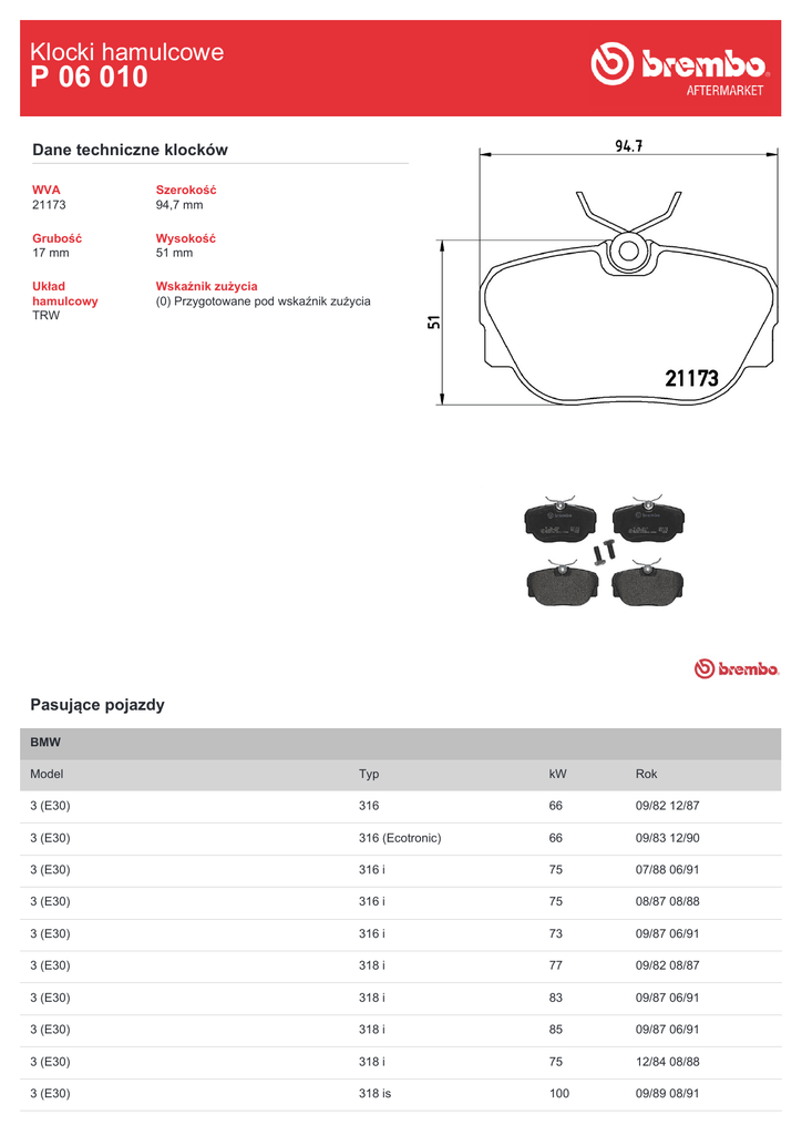 Klocki hamulcowe P 06 010 Dane techniczne klocków WVA 21173 Szerokość 94,7 mm Grubość 17 mm Wysokość 51 mm Układ hamulcowy TRW Wskaźnik zużycia (0) Przygotowane pod wskaźnik zużycia Pasujące pojazdy BMW Model Typ kW Rok 3 (E30) 316 66 09/82 12/87 3 (E30) 316 (Ecotronic) 66 09/83 12/90 3 (E30) 316 i 75 07/88 06/91 3 (E30) 316 i 75 08/87 08/88 3 (E30) 316 i 73 09/87 06/91 3 (E30) 318 i 77 09/82 08/87 3 (E30) 318 i 83 09/87 06/91 3 (E30) 318 i 85 09/87 06/91 3 (E30) 318 i 75 12/84 08/88 3 (E30) 318 is 100 09/89 08/91 3 (E30) 320 i 92 09/82 12/85 3 (E30) 320 i 110 12/85 06/90 3 (E30) 320 i 95 12/85 06/91 3 (E30) 320 is 141 05/88 12/90 3 (E30) 323 i 102 09/82 08/83 3 (E30) 323 i 110 09/83 08/86 3 (E30) 324 d 63 09/85 08/91 3 (E30) 324 td 85 09/87 08/91 3 (E30) 325 e 2.7 95 01/85 08/87 3 (E30) 325 e 2.7 90 10/83 12/88 3 (E30) 325 i 126 09/83 11/89 3 (E30) 325 i 125 12/86 06/91 3 (E30) 325 i X 126 03/86 12/87 3 (E30) 325 i X 125 12/86 08/91 3 Convertible (E30) 318 i 103 06/88 02/92 3 Convertible (E30) 318 i 83 09/90 10/93 3 Convertible (E30) 320 i 93 04/86 10/93 3 Convertible (E30) 320 i 95 04/86 10/93 3 Convertible (E30) 325 i 125 09/87 10/93 3 Convertible (E30) 325 i 126 12/85 12/87 3 Touring (E30) 316 i 73 09/91 06/94 3 Touring (E30) 316 i 75 09/91 06/94 3 Touring (E30) 318 i 83 04/89 06/94 3 Touring (E30) 318 i 85 09/87 06/91 3 Touring (E30) 320 i 95 01/88 12/91 3 Touring (E30) 324 td 85 01/88 06/93 3 Touring (E30) 325 i 125 07/87 03/93 3 Touring (E30) 325 i X 125 06/88 10/93 Z1 2.5 125 06/88 06/91 Numery OE Pasujące kody OE BMW 34111154377 BMW 34111154442 BMW 34111154443 BMW 34111155998 BMW 34111155999 BMW 34111156898 BMW 34111156899 BMW 34111157747 BMW 34111157748 BMW 34111161057 BMW 34111161347 BMW 34111161349 BMW 34111162481 BMW 34119058982 BMW 34119058989