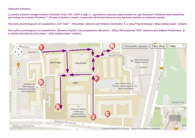 Szanowni Państwo! Z powodu budowy nowego budynku Wydziału Fizyki UW, CeNT II etap 2, i ogrodzenia znacznej części posesji na rogu Banacha i Pasteura nieco utrudniony jest dostęp do budynku Pasteura 7. Proszę korzystać z mapki i z oznaczeń na terenie Kampusu aby sprawnie dotrzeć na wybraną imprezę. Dla osób przychodzących od przystanków „Och-Teatr” i „Wawelska” zalecane jest Wejście Zachodnie, I, w ulicę Pogorzelskiego i dalej według mapki i znaków. Dla osób przychodzących od przestanków „Banacha-Szpital” oraz przystanków „Banacha” i „Bitwy Warszawskiej 1920” zalecane jest Wejście Południowe, w uliczką wewnętrzną, bez nazwy, i dalej według mapki i znaków. CeNT II etap 1 CYKLOTRON CeNT I J,