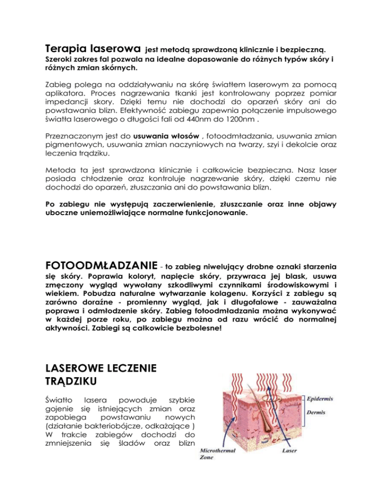 Terapia laserowa jest metodą sprawdzoną klinicznie i bezpieczną. Szeroki zakres fal pozwala na idealne dopasowanie do różnych typów skóry i różnych zmian skórnych. Zabieg polega na oddziaływaniu na skórę światłem laserowym za pomocą aplikatora. Proces nagrzewania tkanki jest kontrolowany poprzez pomiar impedancji skory. Dzięki temu nie dochodzi do oparzeń skóry ani do powstawania blizn. Efektywność zabiegu zapewnia połączenie impulsowego światła laserowego o długości fali od 440nm do 1200nm . Przeznaczonym jest do usuwania włosów , fotoodmładzania, usuwania zmian pigmentowych, usuwania zmian naczyniowych na twarzy, szyi i dekolcie oraz leczenia trądziku. Metoda ta jest sprawdzona klinicznie i całkowicie bezpieczna. Nasz laser posiada chłodzenie oraz kontroluje nagrzewanie skóry, dzięki czemu nie dochodzi do oparzeń, złuszczania ani do powstawania blizn. Po zabiegu nie występują zaczerwienienie, złuszczanie oraz inne objawy uboczne uniemożliwiające normalne funkcjonowanie. FOTOODMŁADZANIE - to zabieg niwelujący drobne oznaki starzenia się skóry. Poprawia koloryt, napięcie skóry, przywraca jej blask, usuwa zmęczony wygląd wywołany szkodliwymi czynnikami środowiskowymi i wiekiem. Pobudza naturalne wytwarzanie kolagenu. Korzyści z zabiegu są zarówno doraźne - promienny wygląd, jak i długofalowe - zauważalna poprawa i odmłodzenie skóry. Zabieg fotoodmładzania można wykonywać w każdej porze roku, po zabiegu można od razu wrócić do normalnej aktywności. Zabiegi są całkowicie bezbolesne! LASEROWE LECZENIE TRĄDZIKU Światło lasera powoduje szybkie gojenie się istniejących zmian oraz zapobiega powstawaniu nowych (działanie bakteriobójcze, odkażające ) W trakcie zabiegów dochodzi do zmniejszenia się śladów oraz blizn potrądzikowych. Precyzyjnie dobrana wiązka światła wnika w głąb skóry i działając na gruczoły łojowe ogranicza produkcję sebum. Terapię laserową można stosować samodzielnie, a także w trakcie leczenia farmakologicznego (należy poinformować lekarza o przyjmowanych lekach). Laseroterapia może być też nieoceniona w pielęgnacji cery łojotokowej i zapobieganiu powstawania trądziku. DEPILACJA LASEROWA - trwałe usuwanie owłosienia Zabieg ten jest wykonywany jednym z najnowocześniejszych na rynku laserów IPL. Najczęściej zabieg epilacji stosuje się: • • • • • • • • dla pozbycia się włosów pojawiających się na skórze w przebiegu zaburzeń endokrynologicznych, w celach kosmetycznych (wszystkie części ciała), dla pozbycia się objawów wrastania włosów po innych metodach depilacji, u pacjentów z wrażliwą skórą, u których pojawiają się zaczerwienienia na skórze po innych metodach depilacji, u mężczyzn w wypadku nadwrażliwości skóry po goleniu, u mężczyzn na skórze karku, plecach i na uszach usuwa także jasne, rude i siwe włosy. światło absorbowane jest tu przez mieszki włosowe. Dochodzi do ich zniszczenia . Usunięcie włosów jest praktycznie permanentne. W związku z cyklem wzrostu włosa zabiegi należy powtórzyć kilkakrotnie. ( w czasie zabiegu są niszczone cebulki tych włosów , które znajdują się w fazie wzrostu Systemy IPL używają specjalnej, kontrolowanej przez komputer cewki tubowej do wygenerowania wysokoenergetycznej fali światła szerokiego spektrum. Takie światło zostaje przefiltrowane by wypuścić fale tylko określonej długości, w pewnym wąskim zakresie. Długość fali jest dostosowana do rodzaju zabiegu. Stworzony by leczyć pajączki naczyniowe, znamiona związane z systemem naczyniowym, naczyniowe zmiany tworzące rumień.. Emituje silne światło absorbowane przez hemoglobinę wewnątrz komórek krwi. Likwiduje przebarwienia związane z wiekiem, piegi, oraz inne typy przebarwień i hiperpigmentacji. Wysyła światło absorbowane przez barwnik w komórkach skóry w wyniku czego dochodzi do zniszczenia komórek z jego nadmierną ilością, a tym samym do znikania przebarwień. Usuwanie owłosienia czyli depilacja