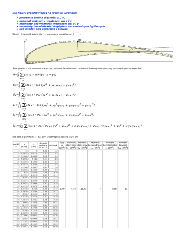 Dla figury przedstwionej na rysunku wyznacz: połoŜenie środka cięŜkości zc , yc moment statyczny względem osi z i y momenty bezwładności wzgledem osi z i y momenty bezwładności względem osi centralnych i głównych kąt między osią centralną i główną Dane: ( rysunek przekroju , numeracja punktów co ) Pole powierzchni, moment statyczny, moment bezwładności i moment dewiacji obliczamy wg podanych poniżej wyrażeń n 1 A= 2 Σ(zk+1 - zk)·(yk+1 + yk) k=1 n Sz= 1 6 Σ(zk+1 - zk)·(yk2 + ykyk+1 + yk+12) k=1 n Sy= 1 6 Σ(yk+1 - yk)·(zk2 + zkzk+1 + zk+12) k=1 n Iz = 1 12 Σ(zk+1 - zk)·(yk3 + yk2yk+1 + ykyk+12 + yk+13) k=1 n Iy = 1 12 Σ(yk+1 - yk)·(zk3 + zk2zk+1 + zkzk+12 + zk+13) k=1 n 1 Izy= 24 Σ(zk+1 - zk)·[zk(3 yk2 + yk+12 + 2 ykyk+1) + zk+1(3 yk+12 + yk2 + 2 ykyk+1)] k=1 Dla pola o punktach 1 - 82, gdy współrzędne podane są w cm punkt k x [cm] długość odcinka y [cm] odcinek /k, k+1/ 1 10 0 0.02 1-2 2 9.9825 0.0115 0.07 2-3 3 9.9268 0.0468 0.12 3-4 4 9.8255 0.106 0.17 4-5 5 9.6693 0.1822 0.23 5-6 6 9.4573 0.2624 0.27 6-7 7 9.1966 0.3387 0.31 7-8 8 8.8928 0.4088 0.35 8-9 9 8.55 0.4706 0.38 9-10 10 8.1729 0.5219 0.41 10-11 11 7.766 0.5612 0.43 11-12 12 7.3344 0.5872 0.45 12-13 13 6.8832 0.5994 0.47 13-14 14 6.4176 0.5976 0.48 14-15 15 5.9428 0.582 0.48 15-16 16 5.4639 0.5534 0.48 16-17 17 4.986 0.5129 0.47 17-18 18 4.5139 0.4618 0.47 18-19 19 4.0519 0.4021 0.45 19-20 20 3.6044 0.3358 0.44 20-21 21 3.175 0.2652 0.41 21-22 22 2.7673 0.1928 0.39 22-23 23 2.384 0.1213 0.36 23-24 24 2.0278 0.0535 0.33 24-25 25 1.7006 -0.0075 0.3 25-26 26 1.402 -0.0563 0.28 26-27 27 1.1282 -0.0925 0.25 27-28 28 0.8787 -0.1202 0.22 28-29 29 0.6561 -0.1404 0.19 29-30 Moment Moment Moment Pole Moment Moment statyczny statyczny bezwładności bezwładności dewiacji A 3 3 I z [cm 4] I y [cm4] I zy [cm4] [cm2] Sz [cm ] Sy [cm ] 6.49 4.44 22.47 4 108 17 30 0.4627 -0.1532 0.16 31 0.3006 -0.1584 0.13 30-31 31-32 32 0.1718 -0.155 0.09 32-33 33 0.0789 -0.1427 0.06 33-34 34 0.0264 -0.112 0.06 34-35 35 0.0044 -0.0561 0.07 35-36 36 0.0005 0.0178 0 36-37 37 0.0005 0.0178 0.09 37-38 38 0.0155 0.1033 0.1 38-39 39 0.0495 0.1969 0.11 39-40 40 0.1028 0.2954 0.12 40-41 41 0.1755 0.3961 0.14 41-42 42 0.2694 0.4966 0.15 42-43 43 0.3855 0.5968 0.17 43-44 44 0.5223 0.6965 0.18 44-45 45 0.6789 0.794 0.2 45-46 46 0.8545 0.8879 0.21 46-47 47 1.0482 0.977 0.23 47-48 48 1.2591 1.0598 0.24 48-49 49 1.4863 1.1355 0.25 49-50 50 1.7286 1.2026 0.26 50-51 51 1.9846 1.2594 0.27 51-52 52 2.2541 1.3037 0.28 52-53 53 2.537 1.3346 0.3 53-54 54 2.8347 1.3505 0.31 54-55 55 3.1488 1.3526 0.33 55-56 56 3.4777 1.3447 0.34 56-57 57 3.8193 1.3271 0.35 57-58 58 4.1721 1.3011 0.36 58-59 59 4.534 1.2683 0.37 59-60 60 4.9025 1.2303 0.37 60-61 61 5.2744 1.1881 0.37 61-62 62 5.6465 1.1425 0.37 62-63 63 6.0158 1.0935 0.37 63-64 64 6.3798 1.0412 0.36 64-65 65 6.736 0.9859 0.35 65-66 66 7.0823 0.9277 0.34 66-67 67 7.4166 0.8671 0.33 67-68 68 7.7369 0.8044 0.31 68-69 69 8.0412 0.7402 0.29 69-70 70 8.3277 0.6749 0.28 70-71 71 8.5947 0.6089 0.25 71-72 72 8.8406 0.5427 0.23 72-73 73 9.0641 0.4768 0.21 73-74 74 9.2639 0.4116 0.19 74-75 75 9.4389 0.3476 0.16 75-76 76 9.5884 0.2853 0.14 76-77 77 9.7111 0.225 0.11 77-78 78 9.8075 0.1646 0.1 78-79 79 9.8825 0.1037 0.08 79-80 80 9.9417 0.0494 0.06 80-81 81 9.9838 0.0126 0.02 81-82 82 10 0 0 82-1 pole przekroju A=6.49 cm2 moment statyczny Sz =4.44 cm3 moment statyczny Sy=22.47 cm3 środek ciężkości Sz A 4.44 yc = 6.49 środek ciężkości Sy zc = A 22.47 zc = 6.49 yc = yc=0.68 cm zc=3.46 cm moment bezwładności Iz =3.77 cm4 moment bezwładności Iy=108.24 cm4 moment odśrodowy Izy=16.88 cm4 moment bezwładności Izc= Iz - yc2A Izc= 3.77 - 0.6826.49 Izc=0.73 cm4 moment bezwładności Iyc= Iy - zc2A Iyc= 108.24 - 3.4626.49 moment odśrodowy Izcyc= Izy - zcycA Izcyc= 16.88 - 3.460.686.49 Iyc=30.44 cm4 Izcyc=1.51 cm4 kat miedzy osią główna centralną ( Ozcgycg) a osią centralną ( Ozcyc) 2Izcyc Izc - Iyc 21.51 2α = arc tg 0.73 - 30.44 tg 2α = α=-2.9o Główne centralne momenty bezwładności wynoszą: J1= Jzc + J2 yc Jzcg= J1= 2 2 + 2 0.7316 + 30.4412 + 2 J2= Jzc + J2yc Jycg= J2= Jzc - Jyc + 2 0.7316 - 30.4412 2 + (1.5084) = 30.5176 cm 4 2 Jzc - Jyc - 2 0.7316 + 30.4412 2 Jzcyc 2 2 + Jzcyc 2 0.7316 - 30.4412 2 + (1.5084) = 0.6552 cm4 2 Niezmienniki momentów bezwładności przekroju: I1= J1 + J2 = Jxc + Jyc I 1=30.518 cm4 + 0.655 cm 4 = 0.732 cm4 + 30.441 cm4 I 1= 31.173 cm4 = 31.173 cm4 I2= J1 · J2 = Jxc · Jyc - Jxcyc2 I2=30.518 cm4 · 0.655 cm4 = 0.732 cm4 · 30.441 cm4 - (1.51 cm4)2 I 2= 19.995 cm8 = 19.995 cm8