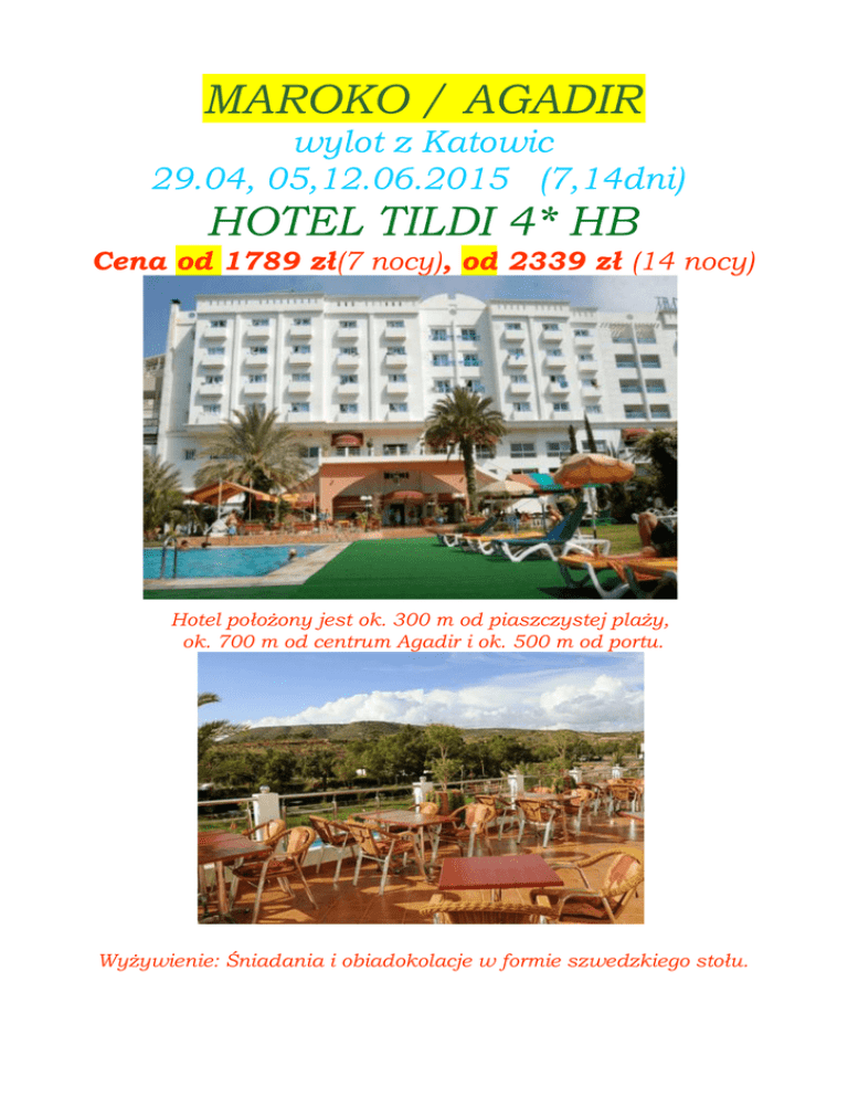 MAROKO / AGADIR wylot z Katowic 29.04, 05,12.06.2015 (7,14dni) HOTEL TILDI 4* HB Cena od 1789 zł(7 nocy), od 2339 zł (14 nocy) Hotel położony jest ok. 300 m od piaszczystej plaży, ok. 700 m od centrum Agadir i ok. 500 m od portu. Wyżywienie: Śniadania i obiadokolacje w formie szwedzkiego stołu. Sport, relaks, rozrywka Bezpłatnie: basen, leżaki i parasole, aerobic, siłownia tenis stołowy, minigolf, szachy, bule, animacje Odpłatnie: fitness center, spa, jacuzzi, sauna, hamman, masaże - sporty wodne na plaży Cena zawiera (PLN): bilet lotniczy, zakwaterowanie w hotelu (doba hotelowa zaczyna się w dniu przyjazdu od godz. 14:00, kończy o godz. 12:00), transfer lotnisko - hotel lotnisko; opiekę polskojęzycznego rezydenta; wyżywienie wg opisu, podatek VAT, obowiązkowe ubezpieczenie (KL I NW, BAGAżU, ubezpieczenia od chorób przewlekłych Europaische Reiseversicherung AG Europejskie), opłaty lotniskowe i paliwowe.