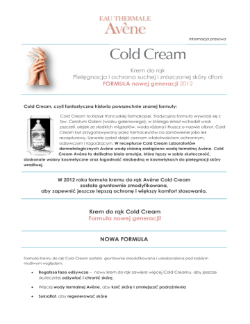 Informacja prasowa Krem do rąk Pielęgnacja i ochrona suchej i zniszczonej skóry dłoni FORMUŁA nowej generacji 2012 Cold Cream, czyli fantastyczna historia powszechnie znanej formuły: Cold Cream to klasyk francuskiej farmakopei. Tradycyjna formuła wywodzi się z tzw. Ceratum Galeni (wosku galenowego), w którego skład wchodził wosk pszczeli, olejek ze słodkich migdałów, woda różana i tłuszcz o nazwie olbrot. Cold Cream był przygotowywany przez farmaceutów na zamówienie jako lek recepturowy. Uznanie zyskał dzięki cennym właściwościom ochronnym, odżywczym i łagodzącym. W recepturze Cold Cream Laboratoriów dermatologicznych Avène wodę różaną zastąpiono wodą termalną Avène. Cold Cream Avène to delikatna biała emulsja, która łączy w sobie skuteczność, doskonałe walory kosmetyczne oraz łagodność niezbędną w kosmetykach do pielęgnacji skóry wrażliwej. W 2012 roku formuła kremu do rąk Avène Cold Cream została gruntownie zmodyfikowana, aby zapewnić jeszcze lepszą ochronę i większy komfort stosowania. Krem do rąk Cold Cream Formuła nowej generacji! NOWA FORMUŁA Formuła Kremu do rąk Cold Cream została gruntownie zmodyfikowana i udoskonalona pod każdym możliwym względem: Bogatsza faza odżywcza – nowy krem do rąk zawiera więcej Cold Creamu, aby jeszcze skuteczniej odżywiać i chronić skórę, Więcej wody termalnej Avène, aby koić skórę i zmniejszać podrażnienia Sukralfat, aby regenerować skórę Informacja prasowa Nowa konsystencja Emulsja z ciekłymi kryształami, które pełnią funkcję mikrozbiorników zawierających fazę wodną (złożoną z wody i gliceryny). Nowa formuła zapewnia stopniowe uwalnianie fazy wodnej, co umożliwia długotrwałe nawilżenie skóry, Krem jest lekki i aksamitny w dotyku. Nie pozostawia lepkiej warstwy na skórze. Łatwo się rozprowadza i szybko się wchłania. Doskonałe walory kosmetyczne Szybko się wchłania Krem jest „suchy” w dotyku, nie pozostawia lepkiej warstwy na skórze Po jego zastosowaniu skóra rąk jest gładka i aksamitna Skóra rąk jest lepiej chroniona i odżywiona Nowatorska formuła zapewnia długotrwałe nawilżenie Krem nie pozostawia białych śladów na skórze Bardzo dobra tolerancja, nie zawiera parabenów. Krem do rąk Cold Cream odżywia, odbudowuje barierę hydrolipidową, chroni skórę i przywraca jej poczucie komfortu. Regularne stosowanie Kremu do rąk Cold Cream koi i chroni nawet najbardziej przesuszoną i zniszczoną skórę rąk. Pojemność: 50 ml, Cena około: 24 pln Data wprowadzenia produktu: wrzesień 2012 Dystybutor: Pierre Fabre Dermocosmetique Polska Sp. z o.o. Ul. Belwederska 20/22 00-762 Warszawa Agencja PR: Platinium Cast Emilia Poszwa [email protected], Telefon: 604 240 408