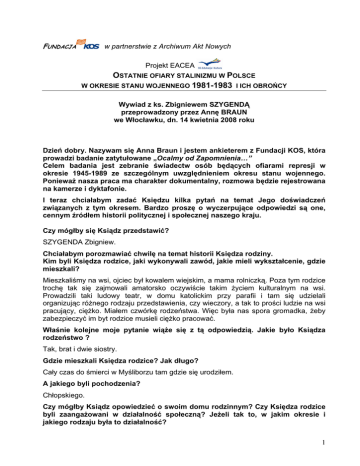 FUNDACJA w partnerstwie z Archiwum Akt Nowych Projekt EACEA OSTATNIE OFIARY STALINIZMU W POLSCE W OKRESIE STANU WOJENNEGO 1981-1983 I ICH OBROŃCY Wywiad z ks. Zbigniewem SZYGENDĄ przeprowadzony przez Annę BRAUN we Włocławku, dn. 14 kwietnia 2008 roku Dzień dobry. Nazywam się Anna Braun i jestem ankieterem z Fundacji KOS, która prowadzi badanie zatytułowane „Ocalmy od Zapomnienia…” Celem badania jest zebranie świadectw osób będących ofiarami represji w okresie 1945-1989 ze szczególnym uwzględnieniem okresu stanu wojennego. Ponieważ nasza praca ma charakter dokumentalny, rozmowa będzie rejestrowana na kamerze i dyktafonie. I teraz chciałabym zadać Księdzu kilka pytań na temat Jego doświadczeń związanych z tym okresem. Bardzo proszę o wyczerpujące odpowiedzi są one, cennym źródłem historii politycznej i społecznej naszego kraju. Czy mógłby się Ksiądz przedstawić? SZYGENDA Zbigniew. Chciałabym porozmawiać chwilę na temat historii Księdza rodziny. Kim byli Księdza rodzice, jaki wykonywali zawód, jakie mieli wykształcenie, gdzie mieszkali? Mieszkaliśmy na wsi, ojciec był kowalem wiejskim, a mama rolniczką. Poza tym rodzice trochę tak się zajmowali amatorsko oczywiście takim życiem kulturalnym na wsi. Prowadzili taki ludowy teatr, w domu katolickim przy parafii i tam się udzielali organizując różnego rodzaju przedstawienia, czy wieczory, a tak to prości ludzie na wsi pracujący, ciężko. Miałem czwórkę rodzeństwa. Więc była nas spora gromadka, żeby zabezpieczyć im byt rodzice musieli ciężko pracować. Właśnie kolejne moje pytanie wiąże się z tą odpowiedzią. Jakie było Ksiądza rodzeństwo ? Tak, brat i dwie siostry. Gdzie mieszkali Księdza rodzice? Jak długo? Cały czas do śmierci w Myśliborzu tam gdzie się urodziłem. A jakiego byli pochodzenia? Chłopskiego. Czy mógłby Ksiądz opowiedzieć o swoim domu rodzinnym? Czy Księdza rodzice byli zaangażowani w działalność społeczną? Jeżeli tak to, w jakim okresie i jakiego rodzaju była to działalność? 1 Poza tym zaangażowaniem w życie religijne i kulturalne także ojciec szczególnie był zaangażowany w życie polityczne, bo 1939 roku był żołnierzem i na froncie; z frontu uciekł, i potem się ukrywał nawet jakiś czas. Również miał swoją działalność w szeregach Armii Krajowej. Po wojnie prowadząc kuźnię był naciskany przez reżim stalinowski do współpracy typu: no w kuźni wszyscy się wymieniają poglądy i informacje. Chciano z niego zrobić donosiciela, to się nie udało. Bo nawet przez jakiś czas był ostro przesłuchiwany na posterunku milicji. W sąsiednim posterunku w Wolinie. W każdym razie ustawiony był do reżimu negatywnie od początku i to nam też tłumaczył. Nawet był problem pamiętam w dzieciństwie, czy ja mogę jako harcerz założyć chustę harcerską czerwoną. Ojciec mówi: „Absolutnie nie.” Więc tego typu były nastroje w rodzinie. Czy Księdza rodzice byli zaangażowani w jakąś działalność opozycyjną? Formalnie nie - tylko tyle ile trzeba było na wsi i bronili wsi przed kołchozami, kolektywizacją. Kolejne moje pytanie. Rozumiem, że Księdza rodzice nie byli nigdy w PZPR? Nie nigdy. Jakie wartości w Księdza rodzinie były szczególnie ważne? Przede wszystkim katolickie i patriotyzm. To podstawa zawsze naszego wychowania była i całe środowisko tamtejsze tak ujmowało sprawy wartości. Porozmawiajmy teraz na temat Księdza działalności społecznej i opozycyjnej. Do jakich należał Ksiądz organizacji społecznych, młodzieżowych lub kościelnych? Tylko do harcerzy, i na tym koniec było, bo potem byłem już w seminarium niższym to nie było tam organizacji żadnych. Natomiast potem przyszło wyższe seminarium, wiec nie byłem w żadnych organizacjach, poza harcerzami. Jaka była Księdza rola, funkcja w harcerstwie? No, normalny członek, zwyczajny szeregowy. Jakie było Księdza miejsce pracy duszpasterskiej przed stanem wojennym i zajmowane w tym czasie stanowisko? Byłem księdzem, stan wojenny mnie zastał jako wikariusza w katedrze we Włocławku. Kiedy i gdzie zaangażował się ksiądz w działalność opozycyjną? Już od samej matury, dlatego że w dniu matury już były próby szantażu mnie przez SB, byłem wezwany w czasie pisania matury na rozmowę z przedstawicielem Służby Bezpieczeństwa, który namawiał mnie do współpracy, bo wiedział, że idę do seminarium. Tej współpracy oczywiście odmówiłem, i zgłosiłem to księdzu rektorowi. Potem jeszcze byłem nagabywany w wakacje jedne i drugie, przyjeżdżali do wsi „panowie smutni”, ale poprosiłem jeszcze kogoś z rodziny, kto umiał się z nimi w sposób brutalny obejść. I definitywnie już zrezygnowali z nagabywania mnie w czasie seminarium. Jaka była to działalność? Co konkretnie Ksiądz robił wtedy? Po prostu, unikanie tego typu kontaktów, a po seminarium to już przewijało się to moje nastawienie takie za prawdą, która ukrywana, za wartościami, które były, 2 postponowane. To wyrażało się w tematyce kazań i w tematyce katechez, jakie prowadziłem wśród młodzieży. I na parafiach, na których pracowałem. Jakie doświadczenia skłoniły Księdza do podjęcia działalności opozycyjnej? Widziałem tę nieprawość, brak niepodległości. W domu mi tłumaczono, o np. jak daleko jest zakłamany nasz rząd i propaganda skoro nie możemy się dowiedzieć o Katyniu, o którym mi ojciec opowiadał. Potem w szkole, gdy dopytywaliśmy o te rzeczy zostaliśmy zbywani, więc wiedzieliśmy, że ten system cały czas bazuje na kłamstwie i staraliśmy się przede wszystkim temu kłamstwu dać przeciwwagę. A ponieważ nie można było tego robić w publikatorach, bo były wtedy ocenzurowane i to byli ludzie reżimu i wtedy uznałem, że kościół jest jedną, jednym z takich miejsc, [gdzie] te prawdy dla przeciwwagi kłamstwom trzeba głosić. I tu głównym celem to była walka z kłamstw