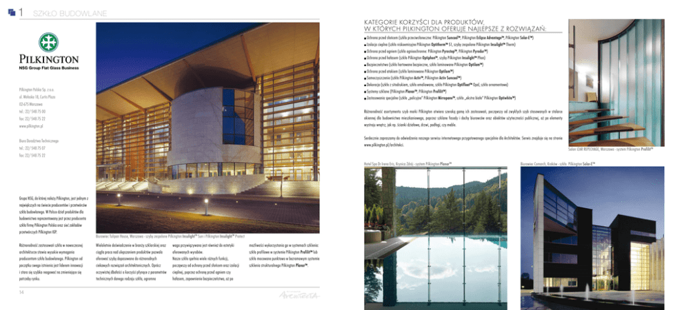 1 szkło budowl ane Kategorie korzyści dla produktów, w których Pilkington oferuje najlepsze z rozwiązań: Ochrona przed słońcem (szkło przeciwsłoneczne: Pilkington Suncool™, Pilkington Eclipse Advantage™, Pilkington Solar-E™) Izolacja cieplna (szkło niskoemisyjne Pilkington Optitherm™ S1, szyby zespolone Pilkington Insulight™ Therm) Ochrona przed ogniem (szkło ognioochronne: Pilkington Pyrostop™, Pilkington Pyrodur™) Ochrona przed hałasem (szkło Pilkington Optiphon™, szyby Pilkington Insulight™ Phon) Bezpieczeństwo (szkło hartowane bezpieczne, szkło laminowane Pilkington Optilam™) Ochrona przed atakiem (szkło laminowane Pilkington Optilam™) Samoczyszczenie (szkło Pilkington Activ™, Pilkington Activ Suncool™) Dekoracja (szkło z sitodrukiem, szkło emaliowane, szkło Pilkington Optifloat™ Opal, szkło ornamentowe) Systemy szklane (Pilkington Planar™, Pilkington Profilit™) Zastosowania specjalne (szkło „policyjne” Pilkington Mirropane™, szkło „ekstra białe” Pilkington Optiwhite™) Pilkington Polska Sp. z o.o. ul. Wołoska 18, Curtis Plaza 02-675 Warszawa Różnorodność asortymentu szyb marki Pilkington otwiera szeroką gamę ich zastosowań, począwszy od zwykłych szyb stosowanych w stolarce okiennej dla budownictwa mieszkaniowego, poprzez szklane fasady i dachy biurowców oraz obiektów użyteczności publicznej, aż po elementy wystroju wnętrz, jak np. ścianki działowe, drzwi, podłogi, czy meble. tel.: 22/ 548 75 00 fax: 22/ 548 75 22 www.pilkington.pl Serdecznie zapraszamy do odwiedzenia naszego serwisu internetowego przygotowanego specjalnie dla Architektów. Serwis znajduje się na stronie www.pilkington.pl/architekci. Biuro Doradztwa Technicznego tel.: 22/ 548 75 07 Salon IZAR REPECHAGE, Warszawa - system Pilkington ProfilitTM fax: 22/ 548 75 22 Hotel Spa Dr Irena Eris, Krynica Zdrój - system Pilkington PlanarTM Grupa NSG, do której należy Pilkington, jest jednym z największych na świecie producentów i przetwórców szkła budowlanego. W Polsce dział produktów dla budownictwa reprezentowany jest przez producenta szkła firmę Pilkington Polska oraz sieć zakładów przetwórczych Pilkington IGP. Różnorodność zastosowań szkła w nowoczesnej architekturze stawia wysokie wymagania producentom szkła budowlanego. Pilkington od początku swego istnienia jest liderem innowacji i stara się szybko reagować na zmieniające się potrzeby rynku. 14 14 Biurowiec Tulipan House, Warszawa - szyby zespolone Pilkington InsulightTM Sun i Pilkington InsulightTM Protect Wieloletnie doświadczenie w branży szklarskiej oraz ciągła praca nad ulepszaniem produktów pozwala oferować szyby dopasowane do różnorodnych ciekawych rozwiązań architektonicznych. Oprócz oczywistej dbałości o korzyści płynące z parametrów technicznych danego rodzaju szkła, ogromna waga przywiązywana jest również do estetyki oferowanych wyrobów. Nasze szkło spełnia wiele różnych funkcji, począwszy od ochrony przed słońcem oraz izolacji cieplnej, poprzez ochronę przed ogniem czy hałasem, zapewnienie bezpieczeństwa, aż po możliwości wykorzystania go w systemach szklenia: szkło profilowe w systemie Pilkington Profilit™ lub szkło mocowane punktowo w bezramowym systemie szklenia strukturalnego Pilkington Planar™. Biurowiec Comarch, Kraków - szkło Pilkington Solar-E TM