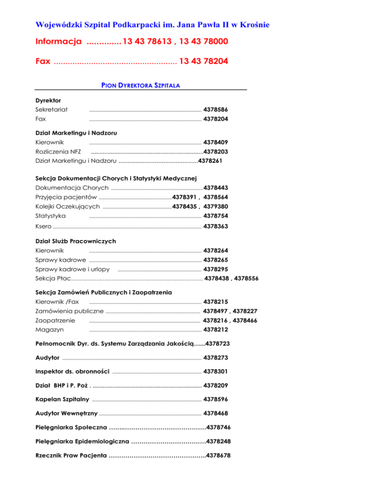 Wojewódzki Szpital Podkarpacki im. Jana Pawła II w Krośnie Informacja .............. 13 43 78613 , 13 43 78000 Fax ..................................................... 13 43 78204 PION DYREKTORA SZPITALA Dyrektor Sekretariat ................................................................................... 4378586 Fax ................................................................................... 4378204 Dział Marketingu i Nadzoru Kierownik Rozliczenia NFZ ................................................................................... 4378409 ....................................................................4378203 Dział Marketingu i Nadzoru ..............................................4378261 Sekcja Dokumentacji Chorych i Statystyki Medycznej Dokumentacja Chorych .................................................................... 4378443 Przyjęcia pacjentów ...................................................... 4378391 , 4378564 Kolejki Oczekujących ................................................... 4378435 , 4379380 Statystyka ................................................................................... 4378754 Ksero .............................................................................................................. 4378363 Dział Służb Pracowniczych Kierownik ................................................................................... 4378264 Sprawy kadrowe ................................................................................... 4378265 Sprawy kadrowe i urlopy .............................................................. 4378295 Sekcja Płac……………………………………………………………………. 4378438 , 4378556 Sekcja Zamówień Publicznych i Zaopatrzenia Kierownik /Fax ................................................................................... 4378215 Zamówienia publiczne ...................................................................... 4378497 , 4378227 Zaopatrzenie .................................................................................. 4378216 , 4378466 Magazyn ................................................................................... 4378212 Pełnomocnik Dyr. ds. Systemu Zarządzania Jakością…...4378723 Audytor ....................................................................................................... 4378273 Inspektor ds. obronności .................................................................. 4378301 Dział BHP i P. Poż . .................................................................. 4378209 Kapelan Szpitalny ................................................................................. 4378596 Audytor Wewnętrzny ............................................................................ 4378468 Pielęgniarka Społeczna ……..…………………………………4378746 Pielęgniarka Epidemiologiczna ………………………………4378248 Rzecznik Praw Pacjenta ………………………………………..4378678 PION EKONOMICZNO-ADMINISTRACYJNY Główny Księgowy ................................................................................. 4378336 Z-ca Głównego Księgowego...……………………………… 4378568 Sekcja Finansowo-Księgowa i Inwentaryzacji…………… 4378372 , 4378263 Gospodarka materiałowa ............................................................... 4378458 Kasa …………………………………………………………….. 4378562 Sekcja Analiz i Rozliczeń Kosztów ................................................. 4378488 Sekcja Transportu Kierownik ................................................................................... 4378202 Stacja diagnostyczna ......................................................................... 4378425 Dyspozytor ................................................................................... 4378571 Dział Techniczny Kierownik ..............................................................................4378319 Sekcja eksploatacyjna Kierownik .................................................................... 4378511 Konserwator elektryk ............................................................. 4378446 Konserwator centrali telefonicznej .....................................4378288 Konserwator gazów medycznych ...................................... 4378236 Łączność .............. ................................................................... 4378229 Kotłownia............................................................................... 4378211 Konserwator (ul. Grodzka..)…………………………………… 4374880 , 4374881 Sekcja Naprawy Aparatury i Sprzętu Medycznego Kierownik ..................................................................... 4378529 Warsztat ..................................................................... 4378527 Sekcja Informatyki ................................................................. 4378368 Dział Administracji i Inwestycji Kierownik …….........................................................................4378208 Sekcja Inwestycji Kierownik............. .................................................................... 4378242 Sekcja Administracyjno – Gospodarcza Kierownik ……........................................................................4378221 Zgłaszanie awarii .................................................................... 4378220 Portiernia .................................................................... 4378200 Placowi .................................................................................4378388 Pralnia Kierownik .....................................................................4378224 PION OPIEKI ZDROWOTNEJ Pielęgniarka Naczelna i Epidemiologiczna ......................... 4378248 , 4378680 Dział Żywienia i Higieny Szpitalnej Kierownik ...........................................................................