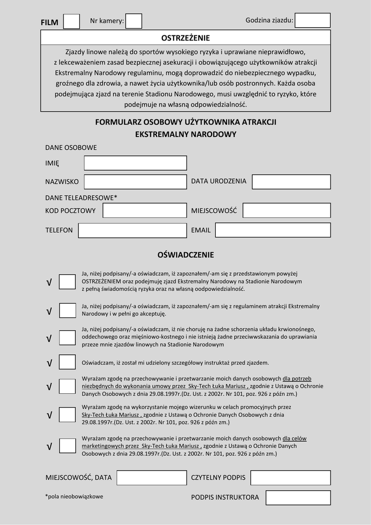 FILM Godzina zjazdu: Nr kamery: OSTRZEŻENIE Sky-Tech Łuka Mariusz , zgodnie z Ustawą o Ochronie Danych Osobowych z dnia 29.08.1997r.(Dz. Ust. z 2002r. Zjazdy linowe należą do sportów wysokiego ryzyka i uprawiane nieprawidłowo, Nr 101, poz. 926 z późn zm.) z lekceważeniem zasad bezpiecznej asekuracji i obowiązującego użytkowników atrakcji Ekstremalny Narodowy regulaminu, mogą doprowadzić do niebezpiecznego wypadku, groźnego dla zdrowia, a nawet życia użytkownika/lub osób postronnych. Każda osoba podejmująca zjazd na terenie Stadionu Narodowego, musi uwzględnić to ryzyko, które podejmuje na własną odpowiedzialność. FORMULARZ OSOBOWY UŻYTKOWNIKA ATRAKCJI EKSTREMALNY NARODOWY DANE OSOBOWE IMIĘ DATA URODZENIA NAZWISKO DANE TELEADRESOWE* KOD POCZTOWY MIEJSCOWOŚĆ TELEFON EMAIL OŚWIADCZENIE √ Ja, niżej podpisany/-a oświadczam, iż zapoznałem/-am się z przedstawionym powyżej OSTRZEŻENIEM oraz podejmuję zjazd Ekstremalny Narodowy na Stadionie Narodowym z pełną świadomością ryzyka oraz na własną oodpowiedzialność. √ Ja, niżej podpisany/-a oświadczam, iż zapoznałem/-am się z regulaminem atrakcji Ekstremalny Narodowy i w pełni go akceptuję. √ Ja, niżej podpisany/-a oświadczam, iż nie choruję na żadne schorzenia układu krwionośnego, oddechowego oraz mięśniowo-kostnego i nie istnieją żadne przeciwwskazania do uprawiania przeze mnie zjazdów linowych na Stadionie Narodowym √ Oświadczam, iż został mi udzielony szczegółowy instruktaż przed zjazdem. √ Wyrażam zgodę na przechowywanie i przetwarzanie moich danych osobowych dla potrzeb niezbędnych do wykonania umowy przez Sky-Tech Łuka Mariusz , zgodnie z Ustawą o Ochronie Danych Osobowych z dnia 29.08.1997r.(Dz. Ust. z 2002r. Nr 101, poz. 926 z późn zm.) √ Wyrażam zgodę na wykorzystanie mojego wizerunku w celach promocyjnych przez Sky-Tech Łuka Mariusz , zgodnie z Ustawą o Ochronie Danych Osobowych z dnia 29.08.1997r.(Dz. Ust. z 2002r. Nr 101, poz. 926 z późn zm.) √ Wyrażam zgodę na przechowywanie i przetwarzanie moich danych osobowych dla celów marketingowych przez Sky-Tech Łuka Mariusz , zgodnie z Ustawą o Ochronie Danych Osobowych z dnia 29.08.1997r.(Dz. Ust. z 2002r. Nr 101, poz. 926 z późn zm.) MIEJSCOWOŚĆ, DATA CZYTELNY PODPIS *pola nieobowiązkowe PODPIS INSTRUKTORA