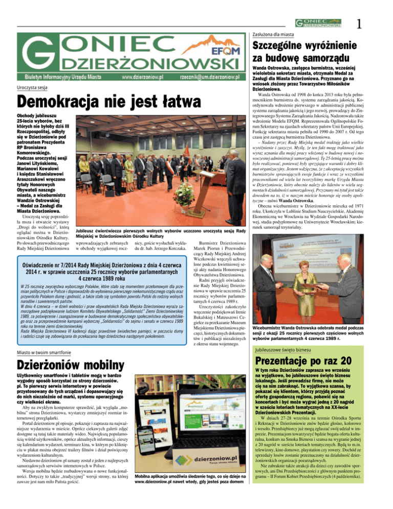 Zasłużona dla miasta 1 Szczególne wyróżnienie za budowę samorządu Uroczysta sesja Demokracja nie jest łatwa Obchody jubileuszu 25-lecia wyborów, bez których nie byłoby dziś III Rzeczpospolitej, odbyły się w Dzierżoniowie pod patronatem Prezydenta RP Bronisława Komorowskiego. Podczas uroczystej sesji Janowi Lityńskiemu, Marianowi Kowalowi i księdzu Stanisławowi Araszczukowi wręczono tytuły Honorowych Obywateli naszego miasta, a wiceburmistrz Wandzie Ostrowskiej – Medal za Zasługi dla Miasta Dzierżoniowa. Uroczystą sesję poprzedziła msza i otwarcie wystawy „Drogi do wolności”, którą oglądać można w Dzierżoniowskim Ośrodku Kultury. Po słowach przewodniczącego Rady Miejskiej Dzierżoniowa Jubileusz ćwierćwiecza pierwszych wolnych wyborów uczczono uroczystą sesją Rady Miejskiej w Dzierżoniowskim Ośrodku Kultury wprowadzających zebranych nicy, goście wysłuchali wykłaBurmistrz Dzierżoniowa w obchody wyjątkowej rocz- du dr. hab. Jerzego Korczaka. Marek Piorun i Przewodniczący Rady Miejskiej Andrzej Wiczkowski wręczyli uchwalone podczas kwietniowej seOświadczenie nr 7/2014 Rady Miejskiej Dzierżoniowa z dnia 4 czerwca sji akty nadania Honorowego 2014 r. w sprawie uczczenia 25 rocznicy wyborów parlamentarnych Obywatelstwa Dzierżoniowa. 4 czerwca 1989 roku Radni przyjęli oświadczenie Rady Miejskiej DzierżoW 25 rocznicę zwycięstwa wyborczego Polaków, które stało się momentem przełomowym dla przeniowa w sprawie uczczenia 25 mian politycznych w Polsce i doprowadziło do wyłonienia pierwszego niekomunistycznego rządu oraz rocznicy wyborów parlamenprzywróciło Polakom dumę i godność, a także stało się symbolem powrotu Polski do rodziny wolnych tarnych 4 czerwca 1989 r. narodów i suwerennych państw. W dniu 4 czerwca – w dzień wolności i praw obywatelskich Rada Miejska Dzierżoniowa wyraża saUroczystości zakończyło morządowe podziękowanie ludziom Komitetu Obywatelskiego „Solidarność” Ziemi Dzierżoniowskiej wręczenie podziękowań Irenie 1989, za poświęcenie i zaangażowanie w budowanie demokratycznego społeczeństwa obywatelskieBukalskiej i Mateuszowi Cego oraz za przeprowadzenie kampanii wyborczej „Solidarności” do sejmu i senatu w czerwcu 1989 giełce za przekazanie Muzeum roku na terenie ziemi dzierżoniowskiej. Miejskiemu Dzierżoniowa pieRada Miejska Dzierżoniowa VI kadencji dając prawdziwe świadectwo pamięci, w poczuciu dumy częci, historycznych dokumeni radości czuje się zobowiązana do przekazania tego dziedzictwa następnym pokoleniom. tów i publikacji niezależnych z okresu stanu wojennego. Wanda Ostrowska od 1998 do końca 2013 roku była pełnomocnikiem burmistrza ds. systemu zarządzania jakością. Koordynowała wdrożenie pierwszego w administracji publicznej systemu zarządzania jakością i jego rozwój, prowadzący do Zintegrowanego Systemu Zarządzania Jakością. Nadzorowała także wdrożenie Modelu EFQM. Reprezentowała Ogólnopolskie Forum Sekretarzy na zjazdach sekretarzy państw Unii Europejskiej. Funkcję sekretarza miasta pełniła od 1990 do 2007 r. Od tego czasu jest zastępcą burmistrza Dzierżoniowa. – Nadany przez Radę Miejską medal traktuję jako wielkie wyróżnienie i zaszczyt. Myślę, że ten fakt mogę traktować jako wyraz uznania dla mojej pracy włożonej w budowę nowej i nowoczesnej administracji samorządowej. Tę 25-letnią pracę można było realizować, ponieważ były sprzyjające warunki i dobry klimat organizacyjny. Jestem wdzięczna, że z akceptacją wszystkich burmistrzów sprawujących swoje funkcje i wraz ze wszystkimi pracownikami od wielu lat tworzyliśmy markę Urzędu Miasta w Dzierżoniowie, który obecnie należy do liderów w wielu segmentach działalności samorządowej. Przyznany mi tytuł jest także dowodem na to, iż w naszym mieście honoruje się osoby apolityczne – mówi Wanda Ostrowska. Obecna wiceburmistrz w Dzierżoniowie mieszka od 1971 roku. Ukończyła w Lublinie Studium Nauczycielskie, Akademię Ekonomiczną we Wrocławiu na Wydziale Gospodarki Narodowej, studia podyplomowe na Uniwersytecie Wrocławskim; kierunek samorząd terytorialny. Wiceburmistrz Wanda Ostrowska odebrała medal podczas sesji z okazji 25 rocznicy pierwszych częściowo wolnych wyborów parlamentarnych 4 czerwca 1989 r. Jubileuszowe święto biznesu Miasto w twoim smartfonie Prezentacje po raz 20 Dzierżoniów mobilny W tym roku Dzierżoniów zaprasza we wrześniu na wyjątkowe, bo jubileuszowe święto biznesu lokalnego. Jeśli prowadzisz firmę, nie może cię na nim zabraknąć. To wyjątkowa szansa, by pokazać się klientom, którzy przyjdą poznać ofertę gospodarczą regionu, pobawić się na koncertach i być może wygrać jedną z 20 nagród w sześciu loteriach tematycznych na XX-lecie Dzierżoniowskich Prezentacji. Użytkownicy smartfonów i tabletów mogą w bardzo wygodny sposób korzystać ze strony dzierzoniów. pl. To pierwszy serwis internetowy w powiecie przystosowany do tych urządzeń i dopasowujący się do nich niezależnie od marki, systemu operacyjnego czy wielkości ekranu. Aby na zwykłym komputerze sprawdzić, jak wygląda „mobilna” strona Dzierżoniowa, wystarczy zmniejszyć rozmiar internetowej przeglądarki. Portal dzierzoniow.pl opisuje, pokazuje i zaprasza na najważniejsze wydarzenia w mieście. Oprócz ciekawych galerii zdjęć dostępne są tutaj także materiały wideo. Największą popularnością wśród użytkowników, oprócz aktualnych informacji, cieszy się kalendarium wydarzeń, terminarz kina, w którym po kliknięciu w plakat można obejrzeć trailery filmów i dział poświęcony wydarzeniom kulturalnym. Niedawno dzierżoniow.pl uznany został z jeden z najlepszych samorządowych serwisów internetowych w Polsce. Wersja mobilna będzie rozbudowywana o nowe funkcjonalności. Dotyczy to także „tradycyjnej” wersji strony, na której zawsze jest nam miło Państa gościć. Wanda Ostrowsk