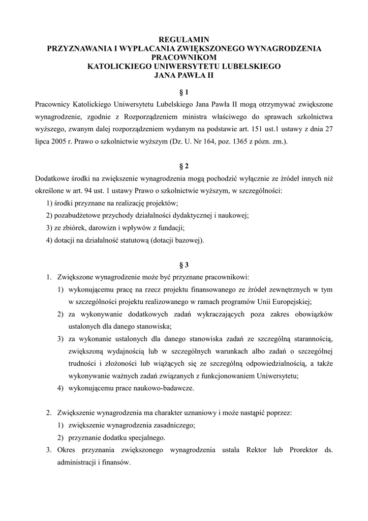 REGULAMIN PRZYZNAWANIA I WYPŁACANIA ZWIĘKSZONEGO WYNAGRODZENIA PRACOWNIKOM KATOLICKIEGO UNIWERSYTETU LUBELSKIEGO JANA PAWŁA II §1 Pracownicy Katolickiego Uniwersytetu Lubelskiego Jana Pawła II mogą otrzymywać zwiększone wynagrodzenie, zgodnie z Rozporządzeniem ministra właściwego do sprawach szkolnictwa wyższego, zwanym dalej rozporządzeniem wydanym na podstawie art. 151 ust.1 ustawy z dnia 27 lipca 2005 r. Prawo o szkolnictwie wyższym (Dz. U. Nr 164, poz. 1365 z pózn. zm.). §2 Dodatkowe środki na zwiększenie wynagrodzenia mogą pochodzić wyłącznie ze źródeł innych niż określone w art. 94 ust. 1 ustawy Prawo o szkolnictwie wyższym, w szczególności: 1) środki przyznane na realizację projektów; 2) pozabudżetowe przychody działalności dydaktycznej i naukowej; 3) ze zbiórek, darowizn i wpływów z fundacji; 4) dotacji na działalność statutową (dotacji bazowej). §3 1. Zwiększone wynagrodzenie może być przyznane pracownikowi: 1) wykonującemu pracę na rzecz projektu finansowanego ze źródeł zewnętrznych w tym w szczególności projektu realizowanego w ramach programów Unii Europejskiej; 2) za wykonywanie dodatkowych zadań wykraczających poza zakres obowiązków ustalonych dla danego stanowiska; 3) za wykonanie ustalonych dla danego stanowiska zadań ze szczególną starannością, zwiększoną wydajnością lub w szczególnych warunkach albo zadań o szczególnej trudności i złożoności lub wiążących się ze szczególną odpowiedzialnością, a także wykonywanie ważnych zadań związanych z funkcjonowaniem Uniwersytetu; 4) wykonującemu prace naukowo-badawcze. 2. Zwiększenie wynagrodzenia ma charakter uznaniowy i może nastąpić poprzez: 1) zwiększenie wynagrodzenia zasadniczego; 2) przyznanie dodatku specjalnego. 3. Okres przyznania zwiększonego wynagrodzenia ustala Rektor lub Prorektor ds. administracji i finansów. §4 Szczegółowe zasady zwiększania wynagrodzenia pracownikom, o których mowa w § 3 ust. 1 pkt 1), określa Regulamin zatrudniania i wynagradzania pracowników KUL za pracę świadczoną w ramach realizacji projektów finansowanych lub współfinansowanych z funduszy europejskich. §5 (uchylony) §6 Dodatek specjalny, o którym mowa w § 3 ust 2 pkt 2), dla pracowników, o których mowa w § 3 ust 1 pkt 2) i 3) nie może przekroczyć 40% łącznie wynagrodzenia zasadniczego i dodatku funkcyjnego pracownika. §7 Decyzję o zwiększeniu wynagrodzenia podejmuje Rektor lub Prorektor ds. administracji i finansów, z własnej inicjatywy, bądź na wniosek: 1) kierownika jednostki organizacyjnej, w której zatrudniony jest pracownik, zaopiniowany przez Kwestora KUL i Kierownika Działu Spraw Pracowniczych; 2) kierownika lub koordynatora projektu, na rzecz którego pracownik wykonuje zadania, zaopiniowany przez Kwestora KUL i Kierownika Działu Spraw Pracowniczych, dodatkowo zaopiniowany przez kierownika Działu Koordynacji Projektów Europejskich, w przypadku projektów współfinansowanych ze środków Unii Europejskiej. §8 Regulamin przyznawania i wypłacania zwiększonego wynagrodzenia pracownikom KUL uzgodniony został z zakładowymi organizacjami związkowymi.