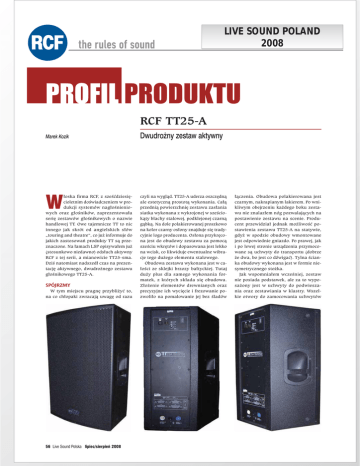 LIVE SOUND POLAND 2008 PROFIL PRODUKTU RCF TT25-A Marek Kozik W łoska firma RCF, z sześćdziesięcioletnim doświadczeniem w produkcji systemów nagłośnieniowych oraz głośników, zaprezentowała serię zestawów głośnikowych o nazwie handlowej TT. Owe tajemnicze TT to nic innego jak skrót od angielskich słów „touring and theatre”, co już informuje do jakich zastosowań produkty TT są przeznaczone. Na łamach LSP opisywałem już (stosunkowo niedawno) odsłuch aktywny RCF z tej serii, a mianowicie TT25-sma. Dziś natomiast nadszedł czas na prezentację aktywnego, dwudrożnego zestawu głośnikowego TT25-A. SPÓJRZMY W tym miejscu pragnę przybliżyć to, na co chłopaki zwracają uwagę od razu 56 Live Sound Polska lipiec/sierpień 2008 Dwudrożny zestaw aktywny czyli na wygląd. TT25-A uderza oszczędną ale estetyczną prostotą wykonania. Całą przednią powierzchnię zestawu zasłania siatka wykonana z wykrojonej w sześciokąty blachy stalowej, podklejonej czarną gąbką. Na dole polakierowanej proszkowo na kolor czarny osłony znajduje się tradycyjnie logo producenta. Osłona przykręcona jest do obudowy zestawu za pomocą sześciu wkrętów i dopasowana jest lekko na wcisk, co likwiduje ewentualne wibracje tego dużego elementu stalowego. Obudowa zestawu wykonana jest w całości ze sklejki brzozy bałtyckiej. Tutaj duży plus dla samego wykonania formatek, z których składa się obudowa. Złożenie elementów drewnianych oraz precyzyjne ich wycięcie i frezowanie pozwoliło na pomalowanie jej bez śladów łączenia. Obudowa polakierowana jest czarnym, nakrapianym lakierem. Po wnikliwym obejrzeniu każdego boku zestawu nie znalazłem nóg pozwalających na postawienie zestawu na scenie. Producent przewidział jednak możliwość postawienia zestawu TT25-A na statywie, gdyż w spodzie obudowy wmontowane jest odpowiednie gniazdo. Po prawej, jak i po lewej stronie urządzenia przymocowane są uchwyty do transportu (dobrze że dwa, bo jest co dźwigać). Tylna ścianka obudowy wykonana jest w formie niesymetrycznego stożka. Jak wspomniałem wcześniej, zestaw nie posiada podstawek, ale za to wyposażony jest w uchwyty do podwieszania oraz zestawiania w klastry. Wszelkie otwory do zamocowania uchwytów LIVE SOUND POLAND 2008 zamaskowane są czarnymi śrubami. Zestaw RCF TT25-A jest konstrukcją, która świetnie nadaje się do transportu, ponieważ jest niewielki rozmiarowo (w stosunku do zaoferowanej mocy) oraz nie posiada żadnych wystających elementów narażonych na utrącenie czy wyłamanie. Płyta tylna stanowi panel sterujący zestawu, jak również pełni rolę chassis elektroniki wewnątrz. W dolnej części płyty tylnej zamontowane jest gniazdo przyłączeniowe sieci prądu przemiennego, w formie trójpolowego gniazda Powercon. Przewód sieciowy do podłączenia zasilania znajduje się oczywiście w zestawie a wspominam o tym, gdyż producent ostrzega w załączonej instrukcji obsługi przed używaniem byle jakiego przewodu. Pobór mocy zasilania może bowiem sięgać nawet 800 W. W dolnej części panelu znajduje się również wyłącznik sieciowy oraz gniazdo Powercon do przesłania napięcia zasilania dla kolejnego zestawu. Górną część płyty tylnej zajmuje blok wejściowo-regulacyjny. W jego skład wchodzi przede wszystkim gniazdo męskie XLR wejścia sygnału oraz XLR żeński, pozwalający przesłać sygnał wejściowy do następnego zestawu. RCF posiada możliwość regulacji poziomu sygnału wejściowego zestawu, do czego służy umieszczony na tylnej płycie potencjometr INPUT SENSITIVITY. Za pomocą pierwszego z dwóch przełączników znajdujących się w bloku regulacyjnym możemy załączyć filtr górnoprzepustowy o nachyleniu 24 dB/okt i częstotliwości 90 Hz. Użycie tego filtru przyda się w konfiguracjach scenicznych z zastosowaniem subwoofera. Drugim przełącznikiem możemy wpływać na charakterystykę zestawu, redukując zakres niskiego środka, w zależności od warunków nagłośnienia. Ostatnimi elementami płyty tylnej są cztery diody świecące, sygnalizujące stan pracy TT25-A. Zielona dioda POWER sygnalizuje podłączenie sieci oraz załączenie wyłącznika sieciowego. Dioda STATUS w zasadzie nie świeci. Jeżeli zaświeci na pomarańczowo, oznacza to, iż wystąpiło uszkodzenie zasilacza lub wzmacniacza i już po naszym graniu. Dioda SIGNAL świeci na zielono, gdy do wejścia doprowadzony jest sygnał. Czwarta i ostatnia dioda sygnalizacyjna to LIMIT. Wzmacniacz zestawu TT25-A wyposażony jest w limiter (ogranicznik) przesterowania wzmacniacza oraz głośników. Jeżeli limiter jest w stanie aktywnym, dioda miga kolorem TT25-A to aktywny, dwudrożny zestaw głośnikowy z obudową typu bass-reflex. Firma RCF wyposażyła TT25-A w neodymowe głośniki własnej konstrukcji – 15-calowy woofer oraz 1,5-calowy tweeter z tubą o rozproszeniu 90 × 40°. Wnętrze obudowy, kryjące całą elektronikę, wytłumione jest w celu uniemożliwienia powstawania fal stających. lipiec/sierpień 2008 Live Sound Polska 57 LIVE SOUND POLAND 2008 PROFIL PRODUKTU pomarańczowym. Podczas pracy zestawu dopuszczalne jest okazjonalne błyskanie diody pomarańczowej, lecz jeżeli dioda błyska często lub świeci ciągle, należy ograniczyć poziom sygnału wejściowego. Dioda LIMIT posiada jeszcze jedną funkcję – sygnalizuje zadziałanie limitera RMS. Jeżeli dioda LIMIT zaczyna błyskać na czerwono, oznacza to ni mniej ni więcej, iż zaczyna właśnie działać limiter RMS. Producent przestrzega przed używaniem zestawu przy aktywnym limiterze RMS, gdyż grozi to uszkodzeniem głównie zastosowanych głośników. To tyle przyrządów manipulacyjnych (jak to zabrzmiało) dostępnych dla użytkownika. Opisy płyty tylnej, gniazd oraz regulatorów są oszczędne, ale wyraźne i przejrzyste. ZAGLĄDAMY DO WNĘTRZA Pierwsze śrubki, które wykręcam (jak mnie to cieszy!) pozwalają na odsłonięcie głośników zestawu. Po zdjęciu o