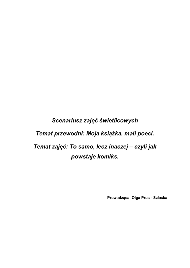 Scenariusz zajęć świetlicowych Temat przewodni: Moja książka, mali poeci. Temat zajęć: To samo, lecz inaczej – czyli jak powstaje komiks. Prowadząca: Olga Prus - Szlaska Temat przewodni: Moja książka, mali poeci. Temat zajęć: To samo, lecz inaczej – czyli jak powstaje komiks. Data realizacji: 11.04.2016r. Cele główne: zaznajomienie uczniów z historią komiksu oraz zasadami jego tworzenia, kształtowanie świadomego odbiorcy różnych tekstów kultury, wdrażanie młodego człowieka do czytania, rozwijanie kreatywności ucznia. Cele szczegółowe: Uczeń: wie, jakie są cechy komiksu, zna pojęcie przekładu semiotycznego, co nazywamy kadrem, plansza komiksowa, potrafi stworzyć komiks, pracuje w zespole, rozwija swoją kreatywność. Metody: podające – wiersz, słowne polecenia, zagadki, aktywne – wizualizacja, praktyczna – stawianie zadań do wykonania, twórcze – ruchu rozwijającego. Formy: zbiorowa, indywidualna. Środki dydaktyczne: plansza z krzyżówką, głównymi cechami komiksu, rozsypanka obrazkowa, klej, flamastry, nożyczki, kredki, patyki drewniane, szablon koła, rysunek przedstawiający komiks. Przebieg zajęć. I część wstępna 1. Przywitanie dzieci, przedstawienie przez nauczyciela celów dzisiejszych zajęć. 2. Wspólne rozwiązanie krzyżówki. Hasło krzyżówki: KOMIKS Pytania do krzyżówki: 1. W ręku operatora? Przemysłowa lub cyfrowa? Najważniejszy sprzęt na planie filmowym? 2. … np. z gumką? Nim szkicujemy, rysujemy? 3. Wyświetlany w kinie? 4. Dzieło poety? Krótki utwór pisany mową? 5. Posiada okładkę, spis treści, jest ciekawą lekturą? 6. Polański lub Wajda? Najważniejsza osoba na planie filmowym? 3. Wyjaśnienie pojęć przez nauczyciela: przekład semiotyczny, kadr, plansza komiksowa. Zapoznanie z historią komiksu. Swobodne wypowiedzi dzieci na temat co to jest komiks. II część główna 4. Wspólne tworzenie tabeli - główne cechy komiksu. cechy językowe pozajęzykowe elementy cechy graficzne świata przedstawionego Uczniowie wspólnie próbują wskazać w komiksie następujących elementów: główne cechy językowe : (zwięzłe wypowiedzi bohaterów, przewaga dialogów), pozajęzykowe elementy dźwiękonaśladowcze - świata trach! bum! przedstawionego: graficzny zapis (wyrazy dźwięków pozasłownych), cechy graficzne: (tekst umieszczony w chmurkach, sceny znajdują się w klatkach). 5. Zabawa ułóż i zgadnij. Dzieci są podzielone na 4 grupy. Ich zadaniem jest ułożyć rozsypankę obrazkową i dopasować opis do obrazka. 6. Mój komiks – zabawa w grupach. Nauczyciel rozdaje dzieciom plansze z komiksem, zadanie dzieci polega na utworzeniu zakończenia historii komiksu. 7. Krótka bajka o Czerwonym Kapturku - zabawa integracyjna z elementem dramy. Uczestnicy dzielą się na cztery grupy. Każdej grupie zostaje przydzielona postać z bajki: Czerwonego Kapturka, Babci, Wilka, Myśliwego. Ustalenie gestów. Prowadzący czyta bajkę, a kiedy w tekście pojawi się któraś z postaci, wówczas odpowiednia grupa przedstawia go umówionymi dźwiękami. Gr. 1 Czerwony Kapturek – la, la, la… Gr. 2 Babcia – oj, oj, oj… Gr. 3 Wilk – auuu… Gr. 4 Myśliwy – pif, paf… CZERWONY KAPTUREK Bajka, nie bajka, skrzata zdumiewajka, o dziewczynce, którą Czerwonym Kapturkiem zwali. Czerwony Kapturek miał Babcię, która mieszkała w lesie, co go dzielny Myśliwy patrolował z uwagi na groźnego Wilka. Pewnego dnia Babcia zachorowała i mama Czerwonego kapturka wysłała Czerwonego Kapturka do Babci, Babci Czerwonego Kapturka, z koszem smakołyków i lekarstw. Czerwony Kapturek idąc do Babci, wcale nie obawiał się straszliwego Wilka, bo wiedział, że pan Myśliwy strzeże lasu i w razie potrzeby uratuje Czerwonego Kapturka przed Wilkiem. Gdy Czerwony Kapturek spotkał po drodze Wilka, ten nie okazał się wcale groźny, zapytał bowiem Czerwonego Kapturka tylko o drogę do Babci. Życzliwy Czerwony Kapturek dokładnie wytłumaczył Wilkowi, gdzie mieszka jego ukochana Babcia, ciesząc się, że nie musiał wzywać Myśliwego. Gdy Czerwony Kapturek sam dotarł do chatki Babci, okazało się, ze wpadł w pułapkę Wilka. Wilk bowiem połknął Babcię, razem z Kapturkiem i rannym kapciem. Tymczasem dzielny Myśliwy , będąc w pobliżu życzliwej mu Babci, Babci Czerwonego Kapturka, postanowił ją odwiedzić. Po wejściu do chatki Babci, Myśliwy szybko zorientował się w niecnych czynach Wilka. Widząc, jak Wilka duma rozpiera. Myśliwy wyjął zza cholewy kordelas i do Wilka strzela. Wilk pada. Babcia z Kapturkiem uratowane czułe dziękują Myśliwemu. A morał bajki jest taki: Nie ufaj w lesie nieznajomemu. 8. W starym kinie – eksperyment. Dzieci dostają szablon do odrysowania 2 kół, zadaniem dzieci polega na namalowaniu na jednej stronie koła oczu, nosa i włosów, a na drugiej stronie tylko ust. Dzieci starają się namalować usta w odpowiednim miejscu po drugiej stronie. W następnej kolejności miedzy dwa koła, po środku przyklejamy patyczek tak aby jeden jej koniec wystawał poza sylwetkę. Dzieci wkładają patyczek po między swoje dłonie i pocierając nim starają się, aby obrazek obracał się w prawą i w lewą stronę. W naszym doświadczeniu szybko kręcimy słomką w związku z czym oba obrazki nakładają się na siebie i powstaje jeden obraz. Tak właśnie powstaje film. III. Część końcowa. 9. Porządkowanie stanowisk przy piosence relaksacyjnej podsumowanie zajęć. Załączniki 1. 1. 2. 3. 4. 5. 6. Załącznik 2. ZWIĘZŁE WYPOWIEDZI BOHATERÓW PRZEWAGA DIALOGÓW WYRAZY DŹWIĘKONAŚLADOWCZE, NP. BUM, TRACH GRAFICZNY ZAPIS DŹWIĘKÓW POZASŁOWNYCH TEKST UMIESZCZONY W CHMURKACH SCENY ZNAJDUJĄ SIĘ W KLATKACH Załącznik 3. Tom i Jerry Mieszkają w tym samym domu, Kto się lubi, ten się czubi, Większy zawsze goni mniejszego. Smerfy Wszyscy są bardzo podobni, lecz różni, Mają jednego wroga, Wśród nich jest tylko jedna kobieta. Kaczor Donald Posiada kupere