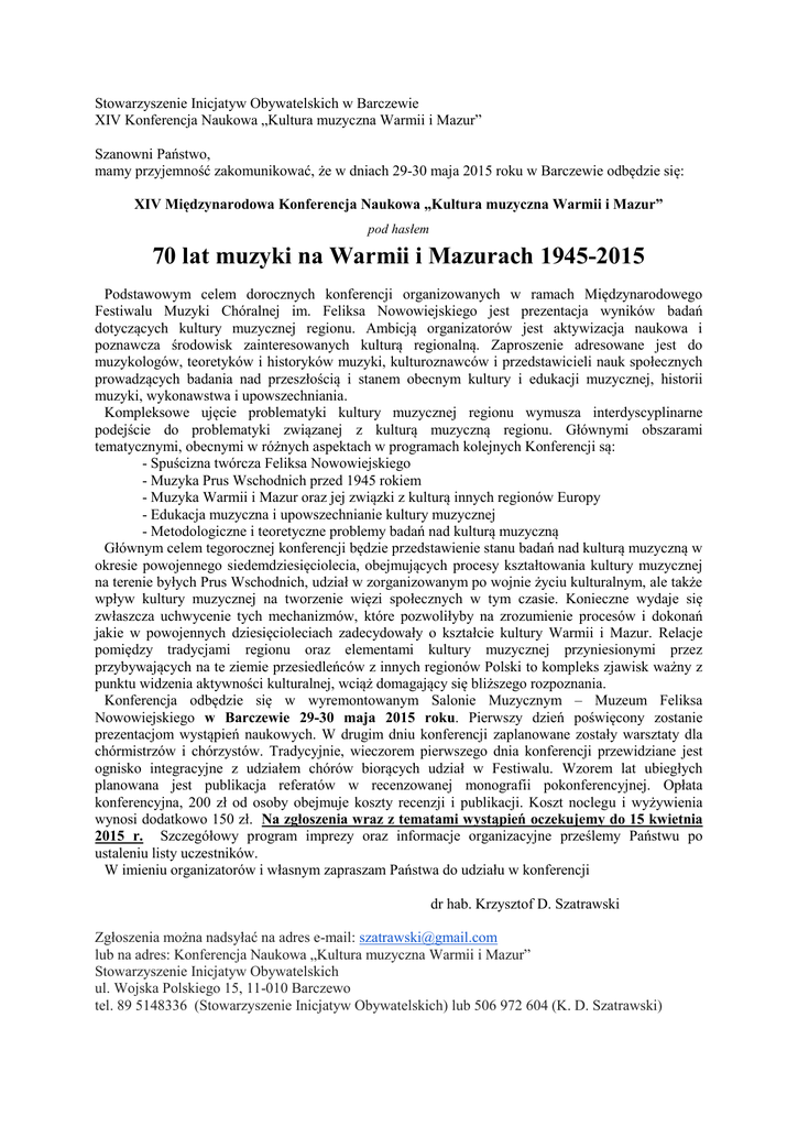 Stowarzyszenie Inicjatyw Obywatelskich w Barczewie XIV Konferencja Naukowa „Kultura muzyczna Warmii i Mazur” Szanowni Państwo, mamy przyjemność zakomunikować, że w dniach 29-30 maja 2015 roku w Barczewie odbędzie się: XIV Międzynarodowa Konferencja Naukowa „Kultura muzyczna Warmii i Mazur” pod hasłem 70 lat muzyki na Warmii i Mazurach 1945-2015 Podstawowym celem dorocznych konferencji organizowanych w ramach Międzynarodowego Festiwalu Muzyki Chóralnej im. Feliksa Nowowiejskiego jest prezentacja wyników badań dotyczących kultury muzycznej regionu. Ambicją organizatorów jest aktywizacja naukowa i poznawcza środowisk zainteresowanych kulturą regionalną. Zaproszenie adresowane jest do muzykologów, teoretyków i historyków muzyki, kulturoznawców i przedstawicieli nauk społecznych prowadzących badania nad przeszłością i stanem obecnym kultury i edukacji muzycznej, historii muzyki, wykonawstwa i upowszechniania. Kompleksowe ujęcie problematyki kultury muzycznej regionu wymusza interdyscyplinarne podejście do problematyki związanej z kulturą muzyczną regionu. Głównymi obszarami tematycznymi, obecnymi w różnych aspektach w programach kolejnych Konferencji są: - Spuścizna twórcza Feliksa Nowowiejskiego - Muzyka Prus Wschodnich przed 1945 rokiem - Muzyka Warmii i Mazur oraz jej związki z kulturą innych regionów Europy - Edukacja muzyczna i upowszechnianie kultury muzycznej - Metodologiczne i teoretyczne problemy badań nad kulturą muzyczną Głównym celem tegorocznej konferencji będzie przedstawienie stanu badań nad kulturą muzyczną w okresie powojennego siedemdziesięciolecia, obejmujących procesy kształtowania kultury muzycznej na terenie byłych Prus Wschodnich, udział w zorganizowanym po wojnie życiu kulturalnym, ale także wpływ kultury muzycznej na tworzenie więzi społecznych w tym czasie. Konieczne wydaje się zwłaszcza uchwycenie tych mechanizmów, które pozwoliłyby na zrozumienie procesów i dokonań jakie w powojennych dziesięcioleciach zadecydowały o kształcie kultury Warmii i Mazur. Relacje pomiędzy tradycjami regionu oraz elementami kultury muzycznej przyniesionymi przez przybywających na te ziemie przesiedleńców z innych regionów Polski to kompleks zjawisk ważny z punktu widzenia aktywności kulturalnej, wciąż domagający się bliższego rozpoznania. Konferencja odbędzie się w wyremontowanym Salonie Muzycznym – Muzeum Feliksa Nowowiejskiego w Barczewie 29-30 maja 2015 roku. Pierwszy dzień poświęcony zostanie prezentacjom wystąpień naukowych. W drugim dniu konferencji zaplanowane zostały warsztaty dla chórmistrzów i chórzystów. Tradycyjnie, wieczorem pierwszego dnia konferencji przewidziane jest ognisko integracyjne z udziałem chórów biorących udział w Festiwalu. Wzorem lat ubiegłych planowana jest publikacja referatów w recenzowanej monografii pokonferencyjnej. Opłata konferencyjna, 200 zł od osoby obejmuje koszty recenzji i publikacji. Koszt noclegu i wyżywienia wynosi dodatkowo 150 zł. Na zgłoszenia wraz z tematami wystąpień oczekujemy do 15 kwietnia 2015 r. Szczegółowy program imprezy oraz informacje organizacyjne prześlemy Państwu po ustaleniu listy uczestników. W imieniu organizatorów i własnym zapraszam Państwa do udziału w konferencji dr hab. Krzysztof D. Szatrawski Zgłoszenia można nadsyłać na adres e-mail: [email protected] lub na adres: Konferencja Naukowa „Kultura muzyczna Warmii i Mazur” Stowarzyszenie Inicjatyw Obywatelskich ul. Wojska Polskiego 15, 11-010 Barczewo tel. 89 5148336 (Stowarzyszenie Inicjatyw Obywatelskich) lub 506 972 604 (K. D. Szatrawski)
