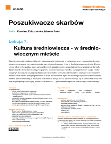 Poszukiwacze skarbów Autor: Karolina Żelazowska, Marcin Paks Lekcja 7: Kultura średniowiecza - w średniowiecznym mieście Zajęcia zobrazują kolejne możliwości wykorzystania kodowania w codziennej pracy nauczyciela. Za podstawę merytoryczną tym razem posłuży nam obszar dotyczący życia w średniowiecznym mieście. Uczniowie na lekcji wykorzystają szereg interaktywnych zasobów online oraz algorytmikę w programie Scratch. Będzie to zakodowanie interaktywnego planu średniowiecznego miasta z uwzględnieniem swojej “małej ojczyzny”. Uczniowie nauczą się stosować odpowiednie instrukcje strukturalne, posługiwać się mechanizmem komunikatów oraz programować reakcje na zdarzenia. Będą oni tez mogli wyruszyć w teren i samodzielnie zebrać materiały, a następnie rozbudować swoją pracę. Zajęcia wpisują się w całokształt pracy nad interaktywną linią czasu i grą „Podróże Chronoska” - tym razem w aspekcie kultury i życia codziennego. Cele zajęć: Uczeń powinien: • potrafi opisać miasto średniowieczne, • posługiwać się poznanymi pojęciami, • umieć porównać warunki życia w mieście średniowiecznym i współczesnym, • zaznaczać na mapce poglądowej najważniejsze miejsca w średniowiecznym mieście, • wyszukiwać i samodzielnie selekcjonować źródła w internecie, • potrafić zaprojektować i zaimplementować mapę średniowiecznego miasta z wykorzystaniem grafiki mapy Google. Materiały pomocnicze: • E-podręcznik, Średniowieczne miasto https://www.epodreczniki.pl/reader/c/246229/v/ latest/t/student-canon/m/j0000008F6B5v32#j0000008F6B5v32_00000008 • materiały dodatkowe dotyczące programowania (dostępne na końcu scenariusza), • zasoby portalu edupolis.pl. Czas na realizację zajęć: 45 min. Pojęcia kluczowe: → kupiec → rzemieślnik → cech → burmistrz → samorząd miejski → rynek → mury miejskie → lokacja Metody pracy: • praca w grupach przy komputerach, • praca z materiałem edukacyjnym online, • praca z e-podręcznikiem, • algorytmika w programie Scratch, kodowanie mapy na interaktywnej linii czasu, • praca z mapą / planem miasta, • pogadanka, • opowiadanie. Treści programowe (związek z podstawą programową) Podstawa programowa kształcenia ogólnego dla szkół podstawowych – II etap edukacyjny – klasy IV-VI; historia i społeczeństwo. Treści szczegółowe: 13. Mieszczanie. Uczeń: 13.1. opisuje miasto średniowieczne, używając pojęć: kupiec, rzemieślnik, cech, burmistrz, samorząd miejski, rynek, mury miejskie; 13.2. porównuje warunki życia w mieście średniowiecznym i współczesnym. Poszukiwacze skarbów / Lekcja 7 / 1 #SuperKoderzy / Poszukiwacze skarbów / Kultura średniowiecza - w średniowiecznym mieście Przebieg zajęć: 1. Wprowadzenie w tematykę i integracja grupy czas: 2 min; materiały: W sytuacji posiadania tablicy interaktywnej, można przygotować rozsypanki słowne dla sformułowania NaCoBeZu, lub wykorzystać Avatara Voki (http://www.voki.com/); metody pracy: dyskusja o celach Nauczyciel przedstawia cele lekcji NaCoBeZu w języku ucznia. Nauczyciel przypomina uczniom, że na ostatnich zajęciach mówiliśmy o reformach Kazimierza Wielkiego, a wśród nich wymieniliśmy liczne lokacje, czyli zakładanie miast. Teraz warto przyjrzeć się, jak wyglądało życie w średniowiecznym mieście, a także poszukali śladów średniowiecza w swojej okolicy. Finałem naszej pracy będzie zakodowanie średniowiecznego planu miasta, być może własnego. 2. Część zasadnicza czas: 1 min; metody pracy: opowiadanie Nauczyciel informuje uczniów, że lokacja miasta to swoista średniowieczna umowa posiadacza ziemi np. między rycerzem a osobą, która dzięki niej może założyć w określonym miejscu miasto lub wieś, w zamian za różne świadczenia. czas: 2 min; materiały: e-podręcznik: https://www.epodreczniki.pl/reader/c/246229/v/latest/t/student-canon/m/ j0000008F6B5v32#j0000008F6B5v32_00000008; metody pracy: pogadanka, praca z mapą, praca z tekstem źródłowym Nauczyciel poleca uczniom zapoznać się z tekstem ze str. 1 e-podręcznika, a następnie pracując z mapą, zrealizować polecenie 1. czas: 1 min; materiały: zasoby dotyczące układu średniowiecznego miasta: https://didactus.edupolis.pl/regional-resources/public/sredniowieczne-miasto/23242/show; metody pracy: praca z mapą, dyskusja, praca z infografiką, praca z materiałem interaktywnym Nauczyciel informuje uczniów, że kształt miasta nie był przypadkowy. Posiadał zasady i odpowiednią organizację - plan, który w wielu miastach obowiązuje do chwili obecnej. Nauczyciel poleca uczniom zapoznać się z zasobem edukacyjnym dostępnym na stronie https://didactus.edupolis.pl/regional-resources/public/sredniowieczne-miasto/23242/show, pozwoli on zobrazować położenie kluczowych elementów w średniowiecznym mieście. czas: 2 min; metody pracy: praca z materiałem interaktywnym; materiały: zasoby dotyczące struktury społecznej średniowiecznego miasta: https://didactus.edupolis.pl/regional-resources/ public/drabina-spoleczna-w-sredniowieczu/23515/show zasoby dotyczące członków wspólnoty miejskiej: https://didactus.edupolis.pl/regional-resources/public/mieszkancy-miasta-sredniowiecznego/23263/show e-podręcznik: Kto rządził w mieście str 2.: https://www.epodreczniki.pl/reader/c/246229/v/latest/t/student-canon/m/ j0000008F6B5v32#j0000008F6B5v32_0000000W Nauczyciel przedstawia/przypomina strukturę feudalną społeczeństwa średniowiecznego https://didactus.edupolis.pl/regional-resources/public/drabina-spoleczna-w-sredniowieczu/23515/show , wskazując na położenie mieszczan i ich zadania. Następnie przedstawia członków wspólnoty miejskiej https://didactus.edupolis.pl/regional-resources/public/mieszkancy-miasta-sredniowiecznego/23263/show oraz ich role na podstawie e-podręcznika - Kto rządził w mieście. Na zakończenie tej części uczniowie wykonują ćw. 1. Poszukiw