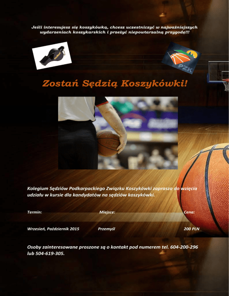 Jeśli interesujesz się koszykówką, chcesz uczestniczyć w najważniejszych wydarzeniach koszykarskich i przeżyć niepowtarzalną przygodę!!! Zostań Sędzią Koszykówki! Kolegium Sędziów Podkarpackiego Związku Koszykówki zaprasza do wzięcia udziału w kursie dla kandydatów na sędziów koszykówki. Termin: Miejsce: Cena: Wrzesień, Październik 2015 Przemyśl 200 PLN Osoby zainteresowane proszone są o kontakt pod numerem tel. 604-200-296 lub 504-619-305.