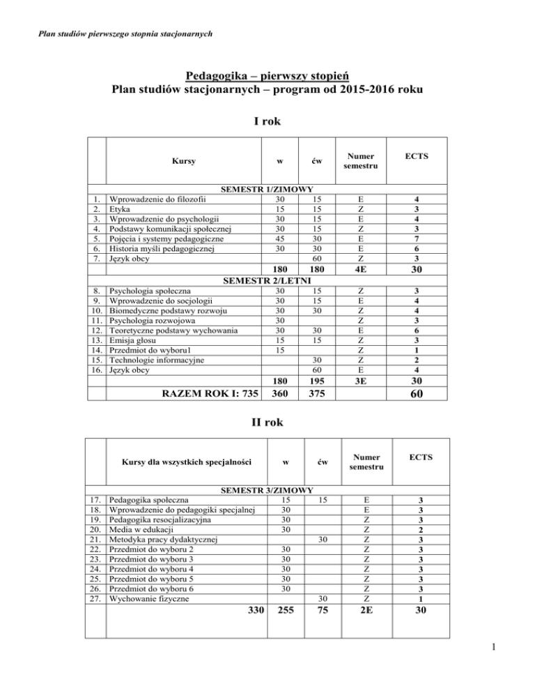 Pedagogika – pierwszy stopień Plan studiów stacjonarnych