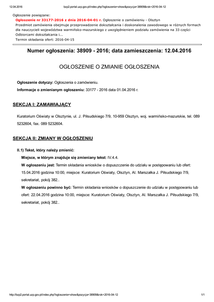 Ogłoszenie o zmianie ogłoszenia - Kuratorium Oświaty w Olsztynie