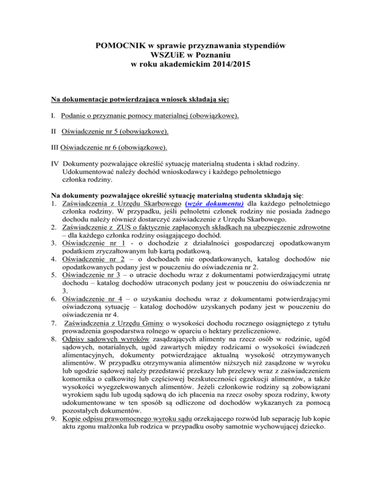 POMOCNIK w sprawie przyznawania stypendiów WSZUiE w Poznaniu w roku akademickim 2014/2015 Na dokumentacje potwierdzającą wniosek składają się: Podanie o przyznanie pomocy materialnej (obowiązkowe). II Oświadczenie nr 5 (obowiązkowe). III Oświadczenie nr 6 (obowiązkowe). IVDokumenty pozwalające określić sytuację materialną studenta i skład rodziny. Udokumentować należy dochód wnioskodawcy i każdego pełnoletniego członka rodziny. Na dokumenty pozwalające określić sytuację materialną studenta składają się: 1. Zaświadczenia z Urzędu Skarbowego (wzór dokumentu) dla każdego pełnoletniego członka rodziny. W przypadku, jeśli pełnoletni członek rodziny nie posiada żadnego dochodu należy również dostarczyć zaświadczenie z Urzędu Skarbowego. 2. Zaświadczenie z ZUS o faktycznie zapłaconych składkach na ubezpieczenie zdrowotne – dla każdego członka rodziny osiągającego dochód. 3. Oświadczenie nr 1 - o dochodzie z działalności gospodarczej opodatkowanym podatkiem zryczałtowanym lub kartą podatkową. 4. Oświadczenie nr 2 – o dochodach nie opodatkowanych, katalog dochodów nie opodatkowanych podany jest w pouczeniu do oświadczenia nr 2. 5. Oświadczenie nr 3 – o utracie dochodu wraz z dokumentami potwierdzającymi utratę dochodu – katalog dochodów utraconych podany jest w pouczeniu do oświadczenia nr 3. 6. Oświadczenie nr 4 – o uzyskaniu dochodu wraz z dokumentami potwierdzającymi oświadczoną sytuację – katalog dochodów uzyskanych podany jest w pouczeniu do oświadczenia nr 4. 7. Zaświadczenia z Urzędu Gminy o wysokości dochodu rocznego osiągniętego z tytułu prowadzenia gospodarstwa rolnego w oparciu o hektary przeliczeniowe. 8. Odpisy sądowych wyroków zasądzających alimenty na rzecz osób w rodzinie, ugód sądowych, notarialnych, ugód zawartych między rodzicami o wysokości świadczeń alimentacyjnych, dokumenty potwierdzające aktualną wysokość otrzymywanych alimentów. W przypadku otrzymywania alimentów niższych niż zasądzone w wyroku lub ugodzie sądowej należy przedstawić przekazy lub przelewy wraz z zaświadczeniem komornika o całkowitej lub częściowej bezskuteczności egzekucji alimentów, a także wysokości wyegzekwowanych alimentów. Jeżeli członkowie rodziny są zobowiązani wyrokiem sądu lub ugodą sądową do ich płacenia na rzecz osoby spoza rodziny, kwoty udokumentowane w ten sposób są odliczone od dochodów wykazanych za pomocą pozostałych dokumentów. 9. Kopie odpisu prawomocnego wyroku sądu orzekającego rozwód lub separację lub kopie aktu zgonu małżonka lub rodzica w przypadku osoby samotnie wychowującej dziecko. 10. aświadczenia ze szkół o uczącym się w szkołach ponadpodstawowych lub studiującym rodzeństwie pozostającym na utrzymaniu rodziny. 11. Aktualne zaświadczenie z Powiatowego Urzędu Pracy o pozostawaniu w rejestrze osób bezrobotnych z adnotacją o wysokości pobieranego zasiłku dla bezrobotnych lub utracie tego prawa w przypadku członka rodziny pozostającego bez pracy. 12. Odpis skróconego aktu urodzenia w przypadku osób małoletnich: rodzeństwa lub dziecka studenta. 13. Kopie aktu ślubu w przypadku małżeństw studenckich. W przypadkach, które nie zostały uwzględnione powyżej, ciężar udokumentowania sytuacji finansowej spoczywa na studencie. Przy ustalaniu dochodu uprawniającego studenta do ubiegania się o stypendium socjalne uwzględnia się dochody osiągane przez: 1. Studenta. 2. Małżonka studenta, a także będące na utrzymaniu studenta lub jego małżonka dzieci niepełnoletnie, dzieci pobierające naukę do 26 roku życia, a jeżeli 26 rok życia przypada w ostatnim roku studiów, do ich ukończenia, oraz dzieci niepełnosprawne bez względu na wiek. 3. Rodziców, opiekunów prawnych i będące na ich utrzymaniu dzieci niepełnoletnie, dzieci pobierające naukę do 26 roku życia, a jeżeli 26 rok życia przypada w ostatnim roku studiów, do ich ukończenia, oraz dzieci niepełnosprawne bez względu na wiek. Dochody, w oparciu o które student stara się o udzielenie pomocy materialnej wylicza, się na podstawie Ustawy o świadczeniach rodzinnych z dnia 28 listopada 2003r. (Dz.U. Nr 228, poz. 2255 z późn. zm.) i Rozporządzenia Ministra Gospodarki, Pracy i Polityki Społecznej z dnia 5 marca 2005r. w sprawie sposobu i trybu postępowania o świadczenia rodzinne (Dz. U. Nr 452, poz. 433) oraz Ustawy z dnia 19 sierpnia 2011 roku o zmianie ustawy o świadczeniach rodzinnych oraz ustawy o pomocy osobom uprawnionym do alimentów (Dz. U. Nr 205, poz. 1212. Student jest samodzielny finansowo, jeżeli on lub jego małżonek spełnia ŁACZNIE następujące warunki: 1. posiadał stałe źródło dochodów w ostatnim roku podatkowym, 2. posiada stałe źródło dochodów w roku bieżącym, 3. jego miesięczny dochód netto w okresach, o których mowa w pkt. 1 i 2, nie jest mniejszy niż 1,15 sumy kwot określonych w art. 5 ust. 1 i art. 6 ust.2 pkt. 3 ustawy z dnia 28 listopada 2003 r o Świadczeniach Rodzinnych. Obecnie jest to 752,10 zł netto. 4. nie złożył oświadczenia o prowadzeniu wspólnego gospodarstwa domowego z rodzicami lub jednym z nich. W ocenie MEN źródłem stałego dochodu studenta może być wynagrodzenie z tytułu umowy o pracę, jak również renta po zmarłym rodzicu, renta inwalidzka, alimenty, regularnie zawierane umowy zlecenia, umowy o dzieło. Ciężar udowodnienia stałego źródła utrzymania spoczywa na studencie. Może on udokumentować powyższe przedstawiając m.in. zaświadczenia z zakładu pracy o zatrudnieniu, umowy cywilno-prawne (zlecenia, o dzieło), decyzje właściwego organu o przyznaniu renty, wyrok sądowy zasądzający alimenty, ponadto zaświadczenia o wysokości osiągniętego dochodu (zaświadczenia z urzędu skarbowego i inne). Członkami gospodarstwa domowego w szczególności są: rodzice lub opiekunowie prawni, rodzeństwo niepełnoletnie, rodzeństwo pełnoletnie uczące si