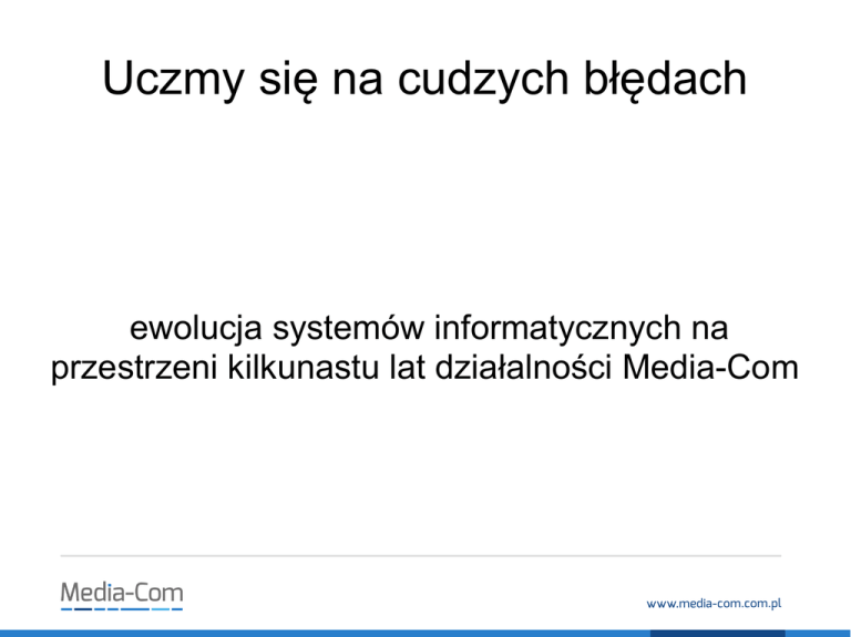 Uczmy się na cudzych błędach ewolucja systemów informatycznych na przestrzeni kilkunastu lat działalności Media-Com Grupa Media-Com w skrócie ● Operator telekomunikacyjny (B2B, B2C) : ● ● Dzierżawa włókien, kanałów CWDM, kanalizacji, masztów, kolokacja Usługi L2, Internet, VoIP, IPTV ● Development oprogramowania ● Biuro rachunkowe ● Integrator systemów IT ● Zewnętrzny dział informatyki ● Inne działalności (potrzeba kontroli) Najistotniejsze potrzeby ● ● ● Standardowy office :) Systemy związane z fiskusem (FK, fakturowanie, magazyn) Systemy związane z zarządzaniem siecią L2/IP oraz jej utrzymaniem ● Zarządzanie projektami (IT ale nie tylko) ● CRM i zarządzanie usługami ● Helpdesk ● Zarządzanie procesami Systemy „pudełkowe” ● Cacti ● JIRA ● OpenOffice i pochodne ● Google docs :) ● Mediawiki ● Subversion/Mercurial ● ● Coś do sprzedaży detalicznej i obsługi magazynu (WFMAG ??) Coś do spraw kadrowych (???) Własna radosna twórczość - stare, ale „jare” ● ● ● ● System Finansowo-Księgowy (faktury, rozrachunki, księgowość itp.) Mini CRM (umowy, kontakty z klientem) System zarządzania usługami IPTV (konfiguracja headendu, pakietów, usług) IPTV multiplekser (obsługa strumieni) Problem ? Totalny rozpierdziel :-] Rozwiązanie - integracja ● Pisany „od zera” z naszym czynnym udziałem ● Analiza + framework + aplikacja + wdrożenie ● Dotowany z POIG 8.2 ● Oparty na otwartych standardach ● Apache/nginx + Squid ● PostgreSQL + pgpool (nieprodukcyjnie) ● XML, REST/https ● koncepcja szyny EAI ale bez „armaty na muchy” Co już działa ? ● podstawowy elektroniczny obieg dokumentów (SOD) z elementami OCR - ograniczenie papierów w firmie ● inwentaryzacja sieci plus raportowanie SIIS ● centralne konfigurowanie usług (SNMP, ssh) ● inne nieistotne dla Was :) W trakcie wdrażania ● ● ● ● Rozbudowany CRM Centralne raportowanie stanu sieci w kontekście użytkownika/usługi Zarządzanie projektami i procesami (rozwinięcie koncepcji obiegu dokumentów o zarządzanie procesami) Planowanie finansowe (kontrola nad wydatkami, projekcje kosztów i przychodów) Na co zwrócić uwagę ? ● ● ● Analiza procesów w firmie, najlepiej zewnętrzna UPRASZCZANIE procesów i konfiguracji (czasem tymczasowo trzeba skomplikować) Interoperacyjność pomiędzy systemami (EAI) ● ● ● Przyzwyczajenia użytkowników Uproszczenie korzystania z bardzo skomplikowanych mechanizmów Skalowalność od małych systemów nawet do korporacji Napotkane problemy ● ● ● Czas Opór pracowników (przyzwyczajenie do „nowego”) Problemy kompetencyjne (trudno znaleźć kogoś, kto to zrobi tak jak chcemy) ● Jestem programistą :-) ● Ważniejsze sprawy (dotacja „kręci śrubę”) ● Czas Czy możemy pomóc ? Elementy systemu będziemy chcieli wdrażać w modelu dotowanym z Unii Europejskiej Rewolucje W.B. ? :) Dziękuję za uwagę Radosław Kojdecki prezes Zarządu Media-Com Sp. z o.o. [email protected]