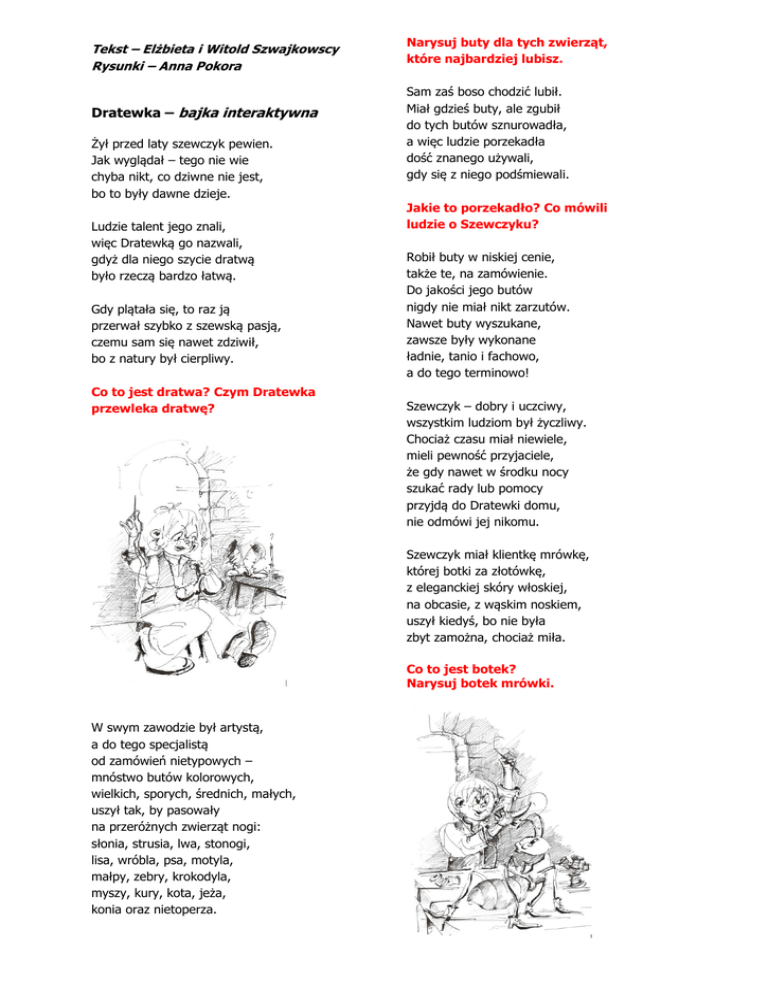 Tekst – Elżbieta i Witold Szwajkowscy Rysunki – Anna Pokora Dratewka – bajka interaktywna Żył przed laty szewczyk pewien. Jak wyglądał – tego nie wie chyba nikt, co dziwne nie jest, bo to były dawne dzieje. Ludzie talent jego znali, więc Dratewką go nazwali, gdyż dla niego szycie dratwą było rzeczą bardzo łatwą. Gdy plątała się, to raz ją przerwał szybko z szewską pasją, czemu sam się nawet zdziwił, bo z natury był cierpliwy. Co to jest dratwa? Czym Dratewka przewleka dratwę? Narysuj buty dla tych zwierząt, które najbardziej lubisz. Sam zaś boso chodzić lubił. Miał gdzieś buty, ale zgubił do tych butów sznurowadła, a więc ludzie porzekadła dość znanego używali, gdy się z niego podśmiewali. Jakie to porzekadło? Co mówili ludzie o Szewczyku? Robił buty w niskiej cenie, także te, na zamówienie. Do jakości jego butów nigdy nie miał nikt zarzutów. Nawet buty wyszukane, zawsze były wykonane ładnie, tanio i fachowo, a do tego terminowo! Szewczyk – dobry i uczciwy, wszystkim ludziom był życzliwy. Chociaż czasu miał niewiele, mieli pewność przyjaciele, że gdy nawet w środku nocy szukać rady lub pomocy przyjdą do Dratewki domu, nie odmówi jej nikomu. Szewczyk miał klientkę mrówkę, której botki za złotówkę, z eleganckiej skóry włoskiej, na obcasie, z wąskim noskiem, uszył kiedyś, bo nie była zbyt zamożna, chociaż miła. Co to jest botek? Narysuj botek mrówki. W swym zawodzie był artystą, a do tego specjalistą od zamówień nietypowych – mnóstwo butów kolorowych, wielkich, sporych, średnich, małych, uszył tak, by pasowały na przeróżnych zwierząt nogi: słonia, strusia, lwa, stonogi, lisa, wróbla, psa, motyla, małpy, zebry, krokodyla, myszy, kury, kota, jeża, konia oraz nietoperza. Kiedyś w nocy zapukała – pilną sprawę bardzo miała, bo swój tylni botek prawy chciała oddać do naprawy. Ile butów nosiła mrówka? Przy okazji też w środkowym chciała, by jej obcas nowy szewczyk zrobił; więc zaspany, z głębokiego snu wyrwany, wziął się szybko za robotę, myśląc, że się wyśpi potem. Która mogła być godzina, gdy zapukała mrówka? Kiedy się zajmował botkiem, mrówka szewczykowi plotkę powiedziała w tajemnicy, bardzo straszną, że z piwnicy pod zamczyskiem, tym za lasem, głośny lament słychać czasem, bo zła jędza (co jest pewne!) piękną więzi tam królewnę, gdyż uwielbia dźwięk jej szlochu z głębi piwnicznego lochu. Przypomnij sobie, jak czujesz się kiedy się złościsz. Spróbuj narysować twarz kogoś, kto się złości. Wiedział, że gdy jędza zła jest, nochal bardziej jej odstaje, oczy wielkie wybałusza, strasznie też uszami rusza i wydaje moc odgłosów, a zapomnieć – ich nie sposób. Czym się różni nos od nochala? Spróbuj narysować nochal jędzy. Gdzieś chodziły nawet słuchy, że niedawno smok przygłuchy do zamczyska trafił między atakami złości jędzy. Spróbuj zaszlochać tak, jak więziona królewna. Szewczyk był tym poruszony, a ponieważ szukał żony, to wieczorem, siedząc w domu, myślał jak królewnie pomóc. Był to smok dość nietypowy, bo mu z boków smoczej głowy wielkie uszy wyrastały, które w trąbki się zwijały. Za to skrzydła miał nieduże, ale sprawne, więc podróże bardzo szybkie mógł odbywać oraz w wielu miejscach bywać. Dorysuj smokowi uszy i skrzydełka. Czuł, że jest to trudna sprawa i że czeka go przeprawa, gdyż odstrasza jędza gości atakami swojej złości. Jędza smoka wywęszyła, czym się strasznie zezłościła. Smok, gdy ją zobaczył z bliska, to ze strachu słuch odzyskał, więc usłyszał jędzy dźwięki: wrzaski, krzyki, wycie, jęki i tak nimi się przeraził, że się do niej mocno zraził. Też na jędzę głośno ryknął, potem prędko w lesie zniknął. Spróbuj ryknąć tak, jak smok ryknął na jędzę. Ludzie zamek omijali, gdyż się złości jędzy bali. Czasem ktoś próbował wnikać z czego jędzy złość wynika, lecz Dratewka się nie głowił: wykorzystać postanowił najpierw doświadczenia własne: – Może buty ma za ciasne? Jaki numer jędza nosi? Gdyby mrówkę tak poprosić, żeby była taka miła i jej buty mi zmierzyła? Mrówka bardzo pomóc chciała. Do zamczyska podreptała, które otoczone murem stało w lesie – dość ponure, brzydkie, stare, brudne, ciemne, zaniedbane, nieprzyjemne, niesprzątane... Z tej przyczyny w oknach miało pajęczyny, a w na w pół zburzonej wieży było gniazdo nietoperzy. Jak myślisz, co by się stało, gdyby jędza zobaczyła w zamku mrówkę? Butów kilka par znalazła. Były brudne, lecz w nie wlazła, w środku kroki policzyła i notatki sporządziła. Co mrówka mogła zapisać w notatkach? Gdy wróciła, dumnym głosem przedstawiła taki wniosek: – Z liczby policzonych kroków widać, że gdzieś co pół roku, stopy jędzy się zmieniają i o numer powiększają. A tej sknerze, czyli jędzy, najwyraźniej żal pieniędzy, żeby kupić buty nowe! Wyjaśnienie masz gotowe! Złość się wtedy w jędzy wzbiera, gdy ją jakiś but uwiera! Narysuj pajęczynę w oknie i zburzoną wieżę. Wziął się szewczyk za robotę. Do roboty ręce złote zawsze miał, więc uszył śliczne, modne buty, lecz klasyczne, na obcasie zgrabnym, który wykończenie miał ze skóry. Narysuj but dla jędzy. Miało także bramę starą. Mrówka pod tą bramą, szparą, w mig do sieni się dostała, choć się jędzy bardzo bała. Gdy je skończył, to czym prędzej pobiegł, by odwiedzić jędzę i ją spytać, czy by chciała takie buty, gdyby miała na ich kupno dość pieniędzy? A jak nie, to... dać je jędzy. Jędza brudną głowę myła. Drzwi mu wściekła otworzyła, lecz gdy zobaczyła buty, każdy but przez trzy minuty z błyskiem w oku oglądała. Widać było, że by chciała dostać butów nową parę i móc zdjąć te ciasne, stare. Co to znaczy, że jędza miała błysk w oku? Chciała też go pocałować, l