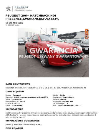 PEUGEOT 206+ HATCHBACK HDI PRESENCE,GWARANCJA,F.VAT23% 16 179 PLN netto 19 900 PLN brutto DANE KONTAKTOWE Krzysztof, Tłuściak, Tel.: 608538011, D & D Sp. z o.o., 53-015, Wrocław, ul. Karkonoska 45 DANE POJAZDU Marka : Peugeot Wersja : HDI Presence,gwarancja,f.vat23% Silnik :1.4 68 KM Rok produkcji : 2011 Liczba drzwi : 5 Kolor : czerwony Model : 206+ Nadwozie : hatchback Paliwo : diesel Przebieg : 87 035 km Liczba miejsc : 5 VIN : VF32M8HR0BY126371 WYPOSAŻENIE elektryczne szyby przednie, klimatyzacja: ręczna, podgrzewana tylna szyba, wspomaganie kierownicy, ABS, BAS/AFU - system wspomagania nagłego hamowania, blokada drzwi podczas jazdy, poduszek: 2 szt., centralny zamek WYPOSAŻENIE DODATKOWE pierwszy właściciel, serwisowany w ASO OPIS POJAZDU PAKIET KORZYŚCI: Dlaczego warto kupić auto w D&D PEUGEOT UŻYWANY GWARANTOWANY: -Bo jesteśmy liderem w sprzedaży samochodów Peugeot Używany Gwarantowany na DOLNYM ŚLĄSKU -Dokładnie sprawdzamy stan techniczny, -W każdym samochodzie GWARANTUJEMY przebieg, -Na fakturze sprzedaży zawsze wpisujemy przebieg i wystawiamy na pełną wartość auta -Auto zawsze posiada aktualne badanie techniczne i ważne ubezpieczenie OC -Klient zawsze otrzymuje komplet dokumentów do rejestracji -Gwarantujemy jazdę próbną i profesjonalną obsługą -Dla nas najważniejszy jest Klient KREDYT- dla osób fizycznych i firm do 84 miesięcy, kredyt do 100% wartości auta LEASING – minimalne wpłaty, wykup 1%, od 24-84 miesięcy UBEZPIECZENIA- atrakcyjne PAKIETY DEALERSKIE ODKUPUJEMY SAMOCHODY WSZYSTKICH MAREK ZA GOTÓWKE, ROZLICZAMY BEZGOTÓWKOWO PRZY ZAKUPIE AUTA UŻYWANEGO LUB NOWEGO. Niniejsze ogłoszenie nie stanowi oferty handlowej w myśl art.66, paragraf 1.Kodeksu Cywilnego. Sprzedawca nie odpowiada za ewentualne błędy lub nieaktualność ogłoszenia Airbag kierowcy i pasażera, Klamki i lusterka w kolorze nadwozia, Automatyczna blokada drzwi podczas jazdy, Elektryczne podnoszenie szyb, przód, Automatyczne włączanie świateł, Fotele sportowe - przód, Felgi stalowe 14 z ogumieniem, Gniazdo 12V, Koło zapasowe pełnowymiarowe, REF - system rozdziału sił hamowania, Instalacja radiowa z 2 głośnikami, Klimatyzacja, 5 zagłówków, Zderzaki w kolorze nadwozia, ABS, Zamek centralny z pilotem, Wspomaganie układu kierowniczego, Uchwyty na kubki w konsoli środkowej, Uchwyty ISOFIX do mocowania fotelika dziecięcego - tył, System wspomagania hamowania awaryjnego, Szyba tylna ogrzewana, Listwy boczne w kolorze nadwozia, Lakier uni Pierwszy właściciel, Kupiony w ASO w Polsce, Pojazd regularnie serwisowany, samochód sprzedawany z 3 miesięczna gwarancją PUG w cenie QR CODE DLA OGŁOSZENIA W SERWISIE UZYWANYGWARANTOWANY.PL Powered by TCPDF (www.tcpdf.org)