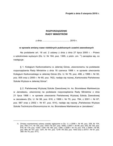 Projekt z dnia 5 sierpnia 2010 r. ROZPORZĄDZENIE RADY MINISTRÓW z dnia ........................................... 2010 r. w sprawie zmiany nazw niektórych publicznych uczelni zawodowych Na podstawie art. 18 ust. 2 ustawy z dnia z dnia 27 lipca 2005 r. - Prawo o szkolnictwie wyŜszym (Dz. U. Nr 164, poz. 1365, z późn. zm. 1)) zarządza się, co następuje: § 1. Kolegium Karkonoskiemu w Jeleniej Górze, utworzonemu na podstawie rozporządzenia Rady Ministrów z dnia 16 czerwca 1998 r. w sprawie utworzenia Kolegium Karkonoskiego w Jeleniej Górze (Dz. U. Nr 76, poz. 496, z 1999 r. Nr 50, poz. 505 oraz z 2000 r. Nr 65, poz. 762), nadaje się nazwę „Karkonoska Państwowa Szkoła WyŜsza w Jeleniej Górze”. § 2. Państwowej WyŜszej Szkole Zawodowej im. ks. Bronisława Markiewicza w Jarosławiu, utworzonej na podstawie rozporządzenia Rady Ministrów z dnia 21 lipca 1998 r. w sprawie utworzenia Państwowej WyŜszej Szkoły Zawodowej w Jarosławiu (Dz. U. Nr 98, poz. 616, z 1999 r. Nr 70, poz. 784, z 2001 r. Nr 67, poz. 687 oraz z 2002 r. Nr 67, poz. 614), nadaje się nazwę „Państwowa WyŜsza Szkoła Techniczno-Ekonomiczna im. ks. Bronisława Markiewicza w Jarosławiu”. _______________________________________ 1) Zmiany wymienionej ustawy zostały ogłoszone w Dz. U. z 2006 r. Nr 46, poz. 328, Nr 104, poz. 708 i 711, Nr 144, poz. 1043 i Nr 227, poz. 1658, z 2007 r. Nr 80, poz. 542, Nr 120, poz. 818, Nr 176, poz. 1238 i 1240 i Nr 180, poz. 1280, z 2008 r. Nr 70, poz. 416, z 2009 r. Nr 68, poz. 584, Nr 157, poz. 1241, Nr 161, poz. 1278 i Nr 202, poz. 1553 oraz z 2010 r. Nr 57, poz. 359 i Nr 75, poz. 471). § 3. Państwowej WyŜszej Szkole Zawodowej w Oświęcimiu, utworzonej na podstawie rozporządzenia Rady Ministrów z dnia 7 czerwca 2005 r. w sprawie utworzenia Państwowej WyŜszej Szkoły Zawodowej w Oświęcimiu (Dz. U. Nr 106, poz. 888), nadaje się nazwę „Państwowa WyŜsza Szkoła Zawodowa im. rtm. Witolda Pileckiego w Oświęcimiu”. § 4. Rozporządzenie wchodzi w Ŝycie po upływie 14 dni od dnia ogłoszenia. PREZES RADY MINISTRÓW UZASADNIENIE Z wnioskiem o nadanie Kolegium Karkonoskiemu w Jeleniej Górze nazwy „Karkonoska Państwowa Szkoła WyŜsza w Jeleniej Górze” wystąpił Rektor Uczelni. Do wniosku dołączona została uchwała senatu Kolegium Karkonoskiego w Jeleniej Górze Nr 13/2010 z dnia 31 maja 2010 r. w sprawie zmiany nazwy Uczelni oraz pozytywna opinia samorządu studenckiego. W uzasadnieniu wniosku podniesiono, iŜ aktualna nazwa Uczelni była uzasadniona stopniem organizacyjnym, mającym pierwowzór w organizacji szkolnictwa wyŜszego w państwach zachodnich. Obecnie jednak, jak napisano, „wywołuje ona skojarzenia z kolegium nauczycielskim, które jest placówką oświatową”. Wskazano równieŜ, iŜ obecna nazwa utrudnia promocję Uczelni oraz „satysfakcjonującą rekrutację na prowadzone kierunki studiów”. Zwrócono uwagę, iŜ aktualna nazwa nie definiuje typu szkoły (publiczna, wyŜsza), dodając, iŜ pozostawienie w nazwie określenia „Karkonoska” jest uzasadnione regionalnym charakterem Uczelni oraz chęcią utrzymania w nazwie elementu wypromowanego w okresie 12 lat działalności. Wniosek o zmianę nazwy Państwowej WyŜszej Szkoły Zawodowej im. ks. Bronisława Markiewicza w Jarosławiu na: „Państwowa WyŜsza Szkoła Techniczno-Ekonomiczna im. ks. Bronisława Markiewicza w Jarosławiu” złoŜył Rektor Uczelni. Do wniosku dołączono uchwałę senatu Państwowej WyŜszej Szkoły Zawodowej im. ks. Bronisława Markiewicza w Jarosławiu Nr 3/V/10 z dnia 19 maja 2010 r. w sprawie wyraŜenia opinii dotyczącej zmiany nazwy Uczelni oraz pozytywną opinię samorządu studenckiego. W uzasadnieniu wniosku wskazano, iŜ zastąpienie w nazwie Uczelni wyrazu „zawodowa” wyrazami „techniczno-ekonomiczna” lepiej oddaje strukturę i profil Uczelni oraz pozwoli na podniesienie jej rangi. Z wnioskiem o zmianę nazwy Państwowej WyŜszej Szkoły Zawodowej w Oświęcimiu wystąpił Rektor Uczelni. Do wniosku dołączone zostały: uchwała senatu Państwowej WyŜszej Szkoły Zawodowej w Oświęcimiu Nr 7/2010 z dnia 19 kwietnia 2010 r. w sprawie zmiany nazwy Uczelni oraz pozytywna opinia samorządu studenckiego. Zmiana nazwy Uczelni polega na dodaniu – przed oznaczeniem miasta – wyrazów: „im. rtm. Witolda Pileckiego”. W uzasadnieniu wniosku wskazano na bohaterski Ŝyciorys rotmistrza Witolda Pileckiego – więźnia Auschwitz, który przedostał się do obozu z własnej inicjatywy „w celu utworzenia siatki konspiracyjnej”, oraz lokalizację kampusu Uczelni w pobliŜu byłego obozu. Podkreślono, iŜ rotmistrz Witold Pilecki jako patron byłby wzorem dla studentów i wyróŜnieniem dla Uczelni. Zgodę na nadanie imienia Uczelni wyraziła rodzina rotmistrza Witolda Pileckiego. Poparcie dla wniosku Państwowej WyŜszej Szkoły Zawodowej w Oświęcimiu wyrazili posłowie ziemi oświęcimskiej, Prezydent Miasta Oświęcimia, Starosta Oświęcimski. Projektowane rozporządzenie nie podlega procedurze notyfikacji w rozumieniu przepisów rozporządzenia Rady Ministrów z dnia 23 grudnia 2002 r. w sprawie sposobu funkcjonowania krajowego systemu notyfikacji norm i aktów prawnych (Dz. U. Nr 239, poz. 2039 oraz z 2004 r. Nr 65, poz. 597). Wstępna opinia o zgodności projektu rozporządzenia z prawem Unii Europejskiej Projektowana regulacja nie jest objęta zakresem prawa Unii Europejskiej. OCENA SKUTKÓW REGULACJI 1. Podmioty, na które oddziałuje projektowane rozporządzenie Projekt rozporządzenia dotyczy trzech publicznych uczelni zawodowych: Kolegium Karkonoskiego w Jeleniej Górze, Państwowej WyŜszej Szkoły Zawodowej im. ks. Bronisława Markiewicza w Jarosławiu oraz Państwowej WyŜszej Szkoły Zawodowej w Oświęcimiu, a zatem swym zakresem obejmuje studentów i pracowników tych uczelni. 2. Konsultacje społeczne Projekt rozporządzenia zostanie skierowany do zaopiniowania następującym partnerom społecznym: