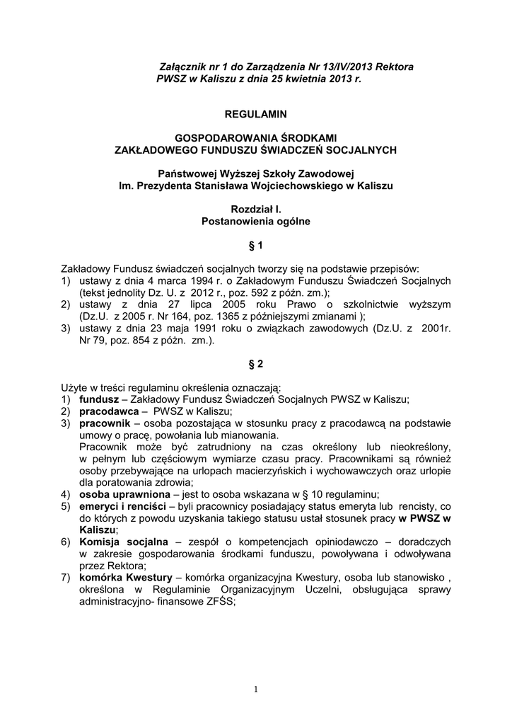 Załącznik nr 1 do Zarządzenia Nr 13/IV/2013 Rektora PWSZ w Kaliszu z dnia 25 kwietnia 2013 r. REGULAMIN GOSPODAROWANIA ŚRODKAMI ZAKŁADOWEGO FUNDUSZU ŚWIADCZEŃ SOCJALNYCH Państwowej Wyższej Szkoły Zawodowej Im. Prezydenta Stanisława Wojciechowskiego w Kaliszu Rozdział I. Postanowienia ogólne §1 Zakładowy Fundusz świadczeń socjalnych tworzy się na podstawie przepisów: 1) ustawy z dnia 4 marca 1994 r. o Zakładowym Funduszu Świadczeń Socjalnych (tekst jednolity Dz. U. z 2012 r., poz. 592 z późn. zm.); 2) ustawy z dnia 27 lipca 2005 roku Prawo o szkolnictwie wyższym (Dz.U. z 2005 r. Nr 164, poz. 1365 z późniejszymi zmianami ); 3) ustawy z dnia 23 maja 1991 roku o związkach zawodowych (Dz.U. z 2001r. Nr 79, poz. 854 z póżn. zm.). §2 Użyte w treści regulaminu określenia oznaczają: 1) fundusz – Zakładowy Fundusz Świadczeń Socjalnych PWSZ w Kaliszu; 2) pracodawca – PWSZ w Kaliszu; 3) pracownik – osoba pozostająca w stosunku pracy z pracodawcą na podstawie umowy o pracę, powołania lub mianowania. Pracownik może być zatrudniony na czas określony lub nieokreślony, w pełnym lub częściowym wymiarze czasu pracy. Pracownikami są również osoby przebywające na urlopach macierzyńskich i wychowawczych oraz urlopie dla poratowania zdrowia; 4) osoba uprawniona – jest to osoba wskazana w § 10 regulaminu; 5) emeryci i renciści – byli pracownicy posiadający status emeryta lub rencisty, co do których z powodu uzyskania takiego statusu ustał stosunek pracy w PWSZ w Kaliszu; 6) Komisja socjalna – zespół o kompetencjach opiniodawczo – doradczych w zakresie gospodarowania środkami funduszu, powoływana i odwoływana przez Rektora; 7) komórka Kwestury – komórka organizacyjna Kwestury, osoba lub stanowisko , określona w Regulaminie Organizacyjnym Uczelni, obsługująca sprawy administracyjno- finansowe ZFŚS; 1 §3 Regulamin określa osoby uprawnione do korzystania z funduszu, zakres przedmiotowy działalności socjalnej, cele na które przeznacza się środki funduszu oraz zasady i warunki przyznawania świadczeń i pomocy z funduszu. §4 Funduszem w imieniu pracodawcy zarządza Rektor. §5 Obsługę finansowo-księgową określoną przepisami ustawy o ZFŚS i innych ustaw oraz administracyjną funduszu prowadzi komórka Kwestury. Rozdział II. Komisja socjalna. §6 1. Komisja socjalna powoływana jest odrębnym zarządzeniem Rektora na okres kadencji Rektora. Skład Komisji socjalnej może ulegać zmianie w trakcie kadencji. 2. Rektor określa skład osobowy komisji, jej szczegółowe zadania oraz powołuje przewodniczącego. 3. Komisja socjalna ma uprawnienia opiniodawczo – doradcze. Podejmuje decyzje większością głosu, a następnie przedstawia je Rektorowi do akceptacji, po uzyskaniu zgody przedstawiciela pracowników, w przypadkach tego wymagających. 4. Posiedzenie Komisji socjalnej zwoływane jest przez Przewodniczącego lub osobę przez niego upoważnioną, w zależności od potrzeb z własnej inicjatywy, na wniosek Rektora, Kanclerza lub Kwestora. Rozdział III. Zasady tworzenia odpisu. §7 1. Fundusz tworzy się z corocznego odpisu podstawowego w wysokości 6,5 % planowanych przez Uczelnię rocznych wynagrodzeń osobowych. 2. Odpis na jednego byłego pracownika , będącego emerytem lub rencistą wynosi za dany rok kalendarzowy 10 % rocznej sumy emerytury lub renty z roku poprzedniego, ustalonej zgodnie z art.94 ust. 2 pkt 1 lit. A ustawy z dnia 17 2 grudnia 1998 r. o emeryturach i rentach z Funduszu Ubezpieczeń Społecznych ( D.U.2009.153.1227 z późn. zm. ). 3. Odpisy o których mowa w ust. 1 i 2 stanowią jeden fundusz. §8 Środki Funduszu mogą być zwiększone poprzez : 1) odsetki od środków funduszu na rachunku bankowym, 2) wpływy z oprocentowania pożyczek udzielonych na cele mieszkaniowe, 3) darowizny oraz zapisy osób fizycznych i prawnych, 4) dobrowolne wpłaty osób korzystających z funduszu, 5) inne środki określone w odrębnych przepisach. §9 1. Środki Funduszu są gromadzone na odrębnym rachunku bankowym. 2. Równowartość odpisu rocznego przekazywana jest na rachunek funduszu w terminie do dnia 30 września każdego roku z tym, że do dnia 31 maja danego roku przekazywana jest kwota, stanowiąca równowartość co najmniej 75% środków odpisu rocznego. 3. Koszty obsługi wyodrębnionego rachunku bankowego obciążają pracodawcę. 4. Niewykorzystane w danym roku kalendarzowym środki funduszu przechodzą na rok następny. 5. Wydatkowanie środków Funduszu na poszczególne cele i rodzaje działalności socjalnej odbywa się w każdym roku kalendarzowym na podstawie rocznego planu rzeczowo-finansowego funduszu przygotowanego przez komórkę Kwestury, w uzgodnieniu z Kwestorem, zaopiniowanego przez Komisję socjalną, uzgodnionego z przedstawicielem załogi oraz zaakceptowanego przez Rektora w terminie do końca lutego każdego roku. Wzór planu rzeczowo-finansowego stanowi załącznik nr 1 do regulaminu. 6. Do czasu zatwierdzenia planu na dany rok mogą być przyznawane świadczenia socjalne na podstawie planu z roku poprzedniego w kwotach nie wyższych niż 2/12 planu roku poprzedniego. Rozdział IV. Osoby uprawnione i ich oświadczenia. § 10 1. Do korzystania ze świadczeń socjalnych finansowanych z funduszu uprawnieni są: 1) pracownicy, z wyłączeniem osób przebywających na urlopach bezpłatnych i innych niż urlopy wychowawcze; 3 2) emeryci i renciści PWSZ w Kaliszu; 3) członkowie rodzin pracowników,; 4) członkowie rodzin zmarłych pracowników, którzy pozostawali na ich utrzymaniu – w zakresie świadczeń, o których mowa w § 16. 2. Za członków rodziny, wymienionych w ust. 1 pkt 3-4, uprawnionych do korzystania z funduszu uważa się: 1) współmałżonków oraz osoby tworzące wspólne gospodarstwo domowe, o który mowa w ust. 1 pkt 1, 2) pozostające na utrzymaniu i wychowaniu osoby uprawnionej – o której mowa w ust. 1 pkt 1-2 - dzieci własne, dzieci przysposobione, prz