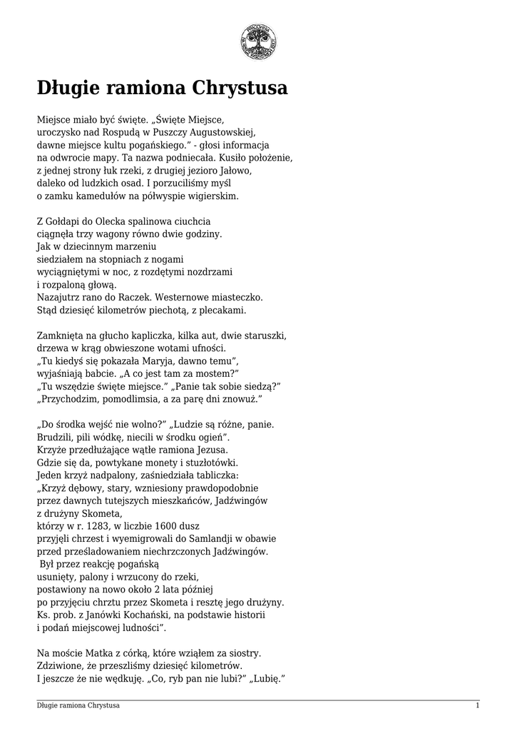 Długie ramiona Chrystusa Miejsce miało być święte. „Święte Miejsce, uroczysko nad Rospudą w Puszczy Augustowskiej, dawne miejsce kultu pogańskiego.” - głosi informacja na odwrocie mapy. Ta nazwa podniecała. Kusiło położenie, z jednej strony łuk rzeki, z drugiej jezioro Jałowo, daleko od ludzkich osad. I porzuciliśmy myśl o zamku kamedułów na półwyspie wigierskim. Z Gołdapi do Olecka spalinowa ciuchcia ciągnęła trzy wagony równo dwie godziny. Jak w dziecinnym marzeniu siedziałem na stopniach z nogami wyciągniętymi w noc, z rozdętymi nozdrzami i rozpaloną głową. Nazajutrz rano do Raczek. Westernowe miasteczko. Stąd dziesięć kilometrów piechotą, z plecakami. Zamknięta na głucho kapliczka, kilka aut, dwie staruszki, drzewa w krąg obwieszone wotami ufności. „Tu kiedyś się pokazała Maryja, dawno temu”, wyjaśniają babcie. „A co jest tam za mostem?” „Tu wszędzie święte miejsce.” „Panie tak sobie siedzą?” „Przychodzim, pomodlimsia, a za parę dni znowuż.” „Do środka wejść nie wolno?” „Ludzie są różne, panie. Brudzili, pili wódkę, niecili w środku ogień”. Krzyże przedłużające wątłe ramiona Jezusa. Gdzie się da, powtykane monety i stuzłotówki. Jeden krzyż nadpalony, zaśniedziała tabliczka: „Krzyż dębowy, stary, wzniesiony prawdopodobnie przez dawnych tutejszych mieszkańców, Jadźwingów z drużyny Skometa, którzy w r. 1283, w liczbie 1600 dusz przyjęli chrzest i wyemigrowali do Samlandji w obawie przed prześladowaniem niechrzczonych Jadźwingów. Był przez reakcję pogańską usunięty, palony i wrzucony do rzeki, postawiony na nowo około 2 lata później po przyjęciu chrztu przez Skometa i resztę jego drużyny. Ks. prob. z Janówki Kochański, na podstawie historii i podań miejscowej ludności”. Na moście Matka z córką, które wziąłem za siostry. Zdziwione, że przeszliśmy dziesięć kilometrów. I jeszcze że nie wędkuję. „Co, ryb pan nie lubi?” „Lubię.” Długie ramiona Chrystusa 1 Rzadko rozmawiam tak lekko, płynnie i sympatycznie. „Jesteśmy tu przypadkiem. Czy pan wie coś o tym miejscu?” „To miejsce kultowe Jaćwingów. Lecz kult się, jak widać, zmienił”. Wieczorem jeszcze słowna utarczka z turystami: „Proszę nie hałasować i nie siusiać do rzeki, z której ja wodę piję.” Odjadą późną nocą. Miejsce stanie się święte. Z ziemi., która jedna pogan z chrześcijanami, moc wejdzie w moje ciało. Lidka rano zaznaczy głosem zmiękczonym snami: „A nie pisz o tym, jak się...” „Zrobię jak zechcę” - ucinam. Święty jest ogień na wietrze i popiół w moich włosach. Święta czapla przepływa ponad naszą polaną. Świętym głosem przemawia niezwykła w tym miejscu rzeka, brzeg jasny i brzeg ciemny, z tej strony łąka, las z tamtej i dno zielonymi włosami dokładnie myje nam stopy. Święte są nasze ciała zmagające się z prądem. Jest jeden Bóg w wielości. W trawie, w drewnianym moście, w stercie śmieci pod krzyżem, w kamieniach na dnie rzeki. Ponad posążki, inskrypcje, ofiary i nabożeństwa wznosi się nieruchomy Wielki Właściciel Wieczności, wbrew któremu staramy się uwieczniać dane nam chwile, daremni w wysiłkach jak tamte napisy ujrzane znienacka, litery mozolnie skrobane w dębowym krzyżu Skometa: „Tu srałem. Heniek z Jastrzębia.” „Bylim tu – Jan i Elżbieta” Jacek Podsiadło 92.08.26 Wiersz pochodzi z tomu „Języki ognia” wyd. w roku 1994 Długie ramiona Chrystusa 2