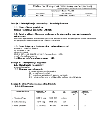 Karta charakterystyki mieszaniny niebezpiecznej Sporządzona zgodnie z przepisami wymienionymi w p.15 niniejszej Karty Spirytusowy lakier ALVIS Data wydania 5.07.2010 r. Data aktualizacji 10.07.2012/1.08.2013 Strona/stron 1z8 Sekcja 1: Identyfikacja mieszaniny i Przedsiębiorstwa 1.1. Identyfikator produktu: Nazwa Handlowa produktu: ALVIS 1.2. Istotne zidentyfikowane zastosowania mieszaniny oraz zastosowania odradzane: Mieszanina wykonana na bazie roztworu poiloctanu winylu w etanolu, do wykonywania powłok barierowych na sprzęcie pszczelarskim wykonanym z różnych materiałów 1.3. Dane dotyczące dostawcy karty charakterystyki: Wytwórnia Chemiczna „CAGRO” Ul. Sienkiewicza 191 42-583 Bobrowniki 0048 32 287-41-13, 0048 32 287-41-73 (w godz. 7.00 – 15.00) e-mail: [email protected] 1.4 Numer telefonu alarmowego 112 Sekcja 2: Identyfikacja zagrożeń 2.1. Klasyfikacja mieszaniny: preparat łatwopalny. 2.2 Elementy oznakowania F – mieszanina wysoce łatwopalna S 2 – chronić przed dziećmi, S 7 – przechowywać pojemnik szczelnie zamknięty, S 16 – nie przechowywać w pobliżu źródeł zapłonu, nie palić tytoniu Sekcja 3: Skład/ informacja o składnikach 3.2.1. Mieszanina: Nazwa chemiczna Zawartość w mieszaninie Nr CAS Nr WE Symbol ostrzegaw czy Symbole zagrożenia (R) 1. Polioctan Winylu 24,75 % wag. 9003-20-7 polimer - - 2 Szelak naturalny <3 % wag. 9000-59-3 brak - - 3. etanol (skażony) 72,2 % wag. 64-17-5 200-578-6 F 11 Karta charakterystyki mieszaniny niebezpiecznej Sporządzona zgodnie z przepisami wymienionymi w p.15 niniejszej Karty Spirytusowy lakier ALVIS Data wydania 5.07.2010 r. Data aktualizacji 10.07.2012/1.08.2013 Strona/stron 2z8 Sekcja 4. Środki pierwszej pomocy: 4.1. Opis środków pierwszej pomocy: Objawy i skutki: W zależności od wchłoniętej dawki pierwsze objawy są charakterystyczne dla upojenia alkoholowego (zaburzenia mowy, koordynacji ruchowej do utraty przytomności). Dłuższe narażenie na działanie par może spowodować podrażnienie górnych dróg oddechowych. Pierwsza pomoc: w pierwszej kolejności należy wyprowadzić poszkodowaną osobę ze skażonego środowiska. Dalsze postępowanie: - ułożyć w pozycji leżącej, zapewnić dopływ świeżego powietrza - w razie konieczności wykonać sztuczne oddychanie, wezwać lekarza Zatrucie doustne: Preparat nie nadaje się do spożycia W razie przypadkowego spożycia: - podać dużą ilość wody do picia (1 - 2 szklanki) - u osoby przytomnej spowodować wymioty, lub zastosować płukanie żołądka - przy poważniejszym zatruciu wezwać lekarza Skażenie oczu: - przemyć skażone oczy większa ilością letniej wody przez około 15 minut, przy wywiniętych powiekach (usunąć przedtem szkła kontaktowe) - w przypadku konieczności zapewnić pomoc lekarza okulisty. Skażenie skóry: - zdjąć zanieczyszczoną odzież - przy widocznym podrażnieniu skóry zmyć dużą ilością wody z mydłem, w razie potrzeby skontaktować się z lekarzem dermatologiem Sekcja 5. Postępowanie w przypadku pożaru 5.1. Środki gaśnicze: Zalecenia - - gaśnice CO2 gaśnice proszkowe z proszkiem gaszącym ABC lub BC, woda gaśnicza (stanowiska za – i rozładunkowe wyposażone w hydranty wodne). szczegółowe: stosować wyłącznie rozproszone strumienie wody na powierzchnię palącego się preparatu, Zwarte strumienie wody powodują rozrzucenie palącej się substancji i rozprzestrzenienie ognisk pożaru, zbiorniki narażone na działanie wysokiej temperatury chłodzić wodą, oraz w miarę możliwości usunąć z zagrożonego obszaru. chronić przed wyładowaniami atmosferycznymi, 5.2. Szczególne zagrożenia związane z mieszaniną: - produkty rozkładu: ditlenek węgla i para wodna 5.3. Informacje dla straży pożarnej: - stosować ubranie ognioodporne, stosować indywidualny aparaty izolujące drogi oddechowe, stosować urządzenia sygnalizujące zagrożenia wybuchem mieszanin powietrzno – alkoholowych. Karta charakterystyki mieszaniny niebezpiecznej Sporządzona zgodnie z przepisami wymienionymi w p.15 niniejszej Karty Spirytusowy lakier ALVIS Data wydania 5.07.2010 r. Data aktualizacji 10.07.2012/1.08.2013 Strona/stron 3z8 Sekcja 6: Postępowanie w przypadku niezamierzonego uwolnienia do środowiska 6.1. Indywidualne środki ostrożności, wyposażenie ochronne i procedury w sytuacjach awaryjnych: 6.1.1. dla osób nienależących do personelu udzielającego pomocy: - osoby postronne przebywające na zagrożonym terenie natychmiast ewakuować miejsce awarii zabezpieczyć przed dostępem osób postronnych, w zależności od ilości uwolnionej mieszaniny założyć maski i okulary ochronne. zebrać przy pomocy substancji absorbującej ciecze lub neutralizować przy pomocy wody, przekazać do likwidacji, niewielkie ilości uwolnionej mieszaniny usunąć przez rozpuszczenie wodą’ w przypadku niemożności zlikwidowania następstw awarii własnymi środkami, przeprowadzenie akcji należy powierzyć zewnętrznym wyspecjalizowanym służbom - 6.1.2. dla osób udzielających pomocy: - używać odzieży ochronnej, masek z filtrem par oznaczonym kolorem brązowym i literą A oraz filtrem cząsteczkowym P2, szczelnych okularów ochronnych, rękawic ochronnych odpornych na działanie alkoholu. 6.2. Środki ostrożności w zakresie ochrony środowiska: - chronić kanalizację w przypadku wydostania się większej ilości preparatu do wód powierzchniowych, ostrzec użytkowników 6.3. Metody i materiały zapobiegające rozprzestrzenianiu się skażenia i służące do usuwania skażenia: Używane do jednorazowej produkcji niewielkie ilości etanolu, jak i opakowania jednostkowe stosowane przez nabywców nie stwarzają niebezpieczeństwa rozprzestrzenienia się skażenia, dlatego czynności opisane w podsekcjach 6.1.1. i 6.2. są wystarczające dla usunięcia zagrożenia. Sekcja 7. Postępowanie mieszaniną i jej magazynowanie: 7.1. Środki ostrożności dotyczące bezpiecznego postępowania: 7.1.1. Zalecenia
