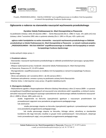 Projekt „PRZEDSZKOLANDIA – RAJ DLA DZIECKA” jest współfinansowany ze środków Unii Europejskiej w ramach Europejskiego Funduszu Społecznego Ogłoszenie o naborze na stanowisko nauczyciel wychowania przedszkolnego Dyrektor Szkoły Podstawowej im. Marii Konopnickiej w Piasecznie na podstawie Ustawy z dnia 26 stycznia 1982 r. - Karta Nauczyciela (Dz.U. 1982 nr 3 poz. 19 z późn.zm) oraz Ustawy z dnia 7 września 1991 roku o systemie oświaty (Dz.U. 1991 nr 95 poz. 425 z późn.zm) ogłasza nabór kandydatów na wolne stanowisko - nauczyciel wychowania przedszkolnego w Oddziale przedszkolnym w Szkole Podstawowej im. Marii Konopnickiej w Piasecznie - w ramach realizacji projektu „PRZEDSZKOLANDIA – RAJ DLA DZIECKA” współfinansowanego ze środków Unii Europejskiej w ramach Europejskiego Funduszu Społecznego Liczba wolnych miejsc pracy: 1 I. Przedmiot naboru: - Stanowisko: nauczyciel wychowania przedszkolnego w oddziale przedszkolnym (pracujący z grupą dzieci 3-4-letnich) - Miejsce wykonywania pracy: budynek i otoczenie Szkoły Podstawowej im. Marii Konopnickiej w Piasecznie, Piaseczno 37, 21-075 Ludwin - Wynagrodzenie: współfinansowane ze środków Unii Europejskiej w ramach Europejskiego Funduszu Społecznego - Okres zatrudnienia: od 1 września 2013 r. do 30 czerwca 2015 r. - Podstawa zatrudnienia: umowa o pracę na podstawie ustawy Karta Nauczyciela - Wymiar etatu: 1 etat (wymiar czasu pracy: 25 godzin dydaktycznych) II. Wymagania niezbędne: - Wykształcenie zgodne z Rozporządzeniem Ministra Edukacji Narodowej z dnia 12 marca 2009 r. w sprawie szczegółowych kwalifikacji wymaganych od nauczycieli oraz określenia szkół i wypadków, w których można zatrudnić nauczycieli niemających wyższego wykształcenia lub ukończonego zakładu kształcenia nauczycieli (Dz.U. 2009 nr 50 poz. 400 z późn.zm), tj.: studia magisterskie na kierunku (specjalności) zgodnym z nauczanym przedmiotem lub prowadzonymi zajęciami oraz posiadanie przygotowania pedagogicznego lub ukończone: studia pierwszego stopnia na kierunku (specjalności) zgodnym z prowadzonymi zajęciami oraz posiadanie przygotowania pedagogicznego, lub studia pierwszego stopnia na kierunku, którego zakres, określony w standardzie kształcenia dla tego kierunku studiów w grupie treści podstawowych i kierunkowych, obejmuje treści prowadzonych zajęć, oraz posiadanie przygotowania pedagogicznego, Szkoła Podstawowa im. Marii Konopnickiej w Piasecznie, Piaseczno 37, 21-075 Ludwin e-mail: [email protected], tel. 81 757 08 15 1 Projekt „PRZEDSZKOLANDIA – RAJ DLA DZIECKA” jest współfinansowany ze środków Unii Europejskiej w ramach Europejskiego Funduszu Społecznego lub studia wyższe na kierunku (specjalności) innym, a ponadto ukończone studia podyplomowe lub kurs kwalifikacyjny w zakresie prowadzonych zajęć oraz posiadanie przygotowania pedagogicznego, lub ukończony zakład kształcenia nauczycieli w specjalności odpowiadającej prowadzonym zajęciom, lub ukończony zakład kształcenia nauczycieli w specjalności innej niż odpowiadająca prowadzonym zajęciom, a ponadto ukończony kurs kwalifikacyjny w zakresie nauczanego przedmiotu lub prowadzonych zajęć, lub studia wyższe na kierunku pedagogika w specjalności przygotowującej do pracy z dziećmi w wieku przedszkolnym albo wczesnoszkolnym lub zakład kształcenia nauczycieli w specjalności przygotowującej do pracy z dziećmi w wieku przedszkolnym lub wczesnoszkolnym; - Posiadanie stopnia zawodowego nauczyciel kontraktowy; - Minimum roczne doświadczenie zawodowe w pracy na stanowisku nauczyciela wychowania przedszkolnego lub edukacji wczesnoszkolnej; - Posiadanie obywatelstwa polskiego; - Pełna zdolność do czynności prawnych; - Korzystanie z pełni praw publicznych; - Brak prawomocnego wyroku sądu za umyślne przestępstwo ścigane z oskarżenia publicznego lub umyślne przestępstwo skarbowe; - Nienaganna postawa moralna; - Stan zdrowia pozwalający na zatrudnienie na stanowisku nauczyciel wychowania przedszkolnego w oddziale przedszkolnym; - Znajomość następujących dokumentów: a. Rozporządzenie Ministra Edukacji Narodowej z dnia 21 maja 2001 r. w sprawie ramowych statutów publicznego przedszkola oraz publicznych szkół b. Rozporządzenie Ministra Edukacji Narodowej z dnia 27 sierpnia 2012 r. w sprawie podstawy programowej wychowania przedszkolnego oraz kształcenia ogólnego w poszczególnych typach szkół. III. Wymagania dodatkowe: - Umiejętność pracy w zespole, w tym: cierpliwość i opanowanie; - Komunikatywność - łatwość w nawiązywaniu kontaktów z dziećmi; - Kreatywność – w tym inicjatywność i pomysłowość. Szkoła Podstawowa im. Marii Konopnickiej w Piasecznie, Piaseczno 37, 21-075 Ludwin e-mail: [email protected], tel. 81 757 08 15 2 Projekt „PRZEDSZKOLANDIA – RAJ DLA DZIECKA” jest współfinansowany ze środków Unii Europejskiej w ramach Europejskiego Funduszu Społecznego IV. Zakres wykonywanych zadań na stanowisku: 1. Organizowanie i prowadzenie pracy dydaktyczno-wychowawczej i opiekuńczej w grupie 3-4-latków w oddziale przedszkolnym; 2. Dbanie o bezpieczeństwo i zdrowie wychowanków; 3. Tworzenie warunków wspomagających rozwój dzieci, ich zdolności i zainteresowań; 4. Wspieranie rozwoju aktywności poznawczej dziecka nastawionej na poznanie samego siebie oraz otaczającej rzeczywistości społeczno – kulturowej i przyrodniczej; 5. Przygotowanie i realizacja autorskiego programu realizacji podstawy programowej w oparciu o załącznik nr 1 do Rozporządzenia Ministra Edukacji Narodowej z dnia 27 sierpnia 2012 r. w sprawie podstawy programowej wychowania przedszkolnego oraz kształcenia ogólnego w poszczególnych typach szkół w wymiarze 5 godzin dziennie od poniedziałku do piątku w grupie przedszkolnej dzieci w wieku 3-4 lata na okres realizacji zajęć w ramach projektu (tj. 09.2013 – 07.2014 oraz 09.2014 – 06.2015); 6. Prowadzenie pracy dydaktyczno – wychowawcze