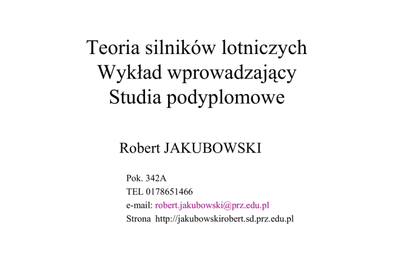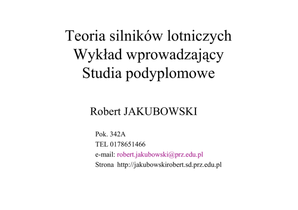Teoria silników lotniczych Wykład wprowadzający Studia podyplomowe Robert JAKUBOWSKI Pok. 342A TEL 0178651466 e-mail: [email protected] Strona http://jakubowskirobert.sd.prz.edu.pl Literatura • Balicki i in. Lotnicze silniki Turbinowe, część I II, IL • DzierŜanowski i in. Turbinowe silniki odrzutowe, WKŁ • Gajewski Lesikiewicz: Przepływowe silniki odrzutowe WNT • DzierŜanowski i in. Turbinowe silniki śmigłowe i śmigłowcowe WKŁ • Orkisz: Wybrane zagadnienia z teorii turbinowych silników odrzutowych • Muszyński, Orkisz: Modelowanie turbinowych silników odrzutowych , IL • Antas, Wolański: Obliczenia termogazodynamiczne lotniczych silników turbinowych , Literatura c.d. • Oates: Aerothermodynamics of Gas Turbines and Rocket Propulsion • Oates: Aircrafts Propulsion System Technology and Design • Oates: Aerothermodynamics of Aircraft Engine Components • Mattingly: Airctaft Engine Design • Kerrebrock: Aircraft Engines and Gas Turbines • Coumpsty: Jet Propulsion – A Simple Quide to the Aerodynamic and Thetmodynamic Design and Performanece of Jet Engines • i in. Pierwszy silnik do samolotu moc-12KM • Lot braci Wright, 17 grudnia 1903 roku, Kitti Hawk, Floryda Silnik lotniczy chłodzony powietrzem • W 1908 r bracia Louis i Laurent Seguin zaprojektowali i wyprodukowali silnik chłodzony powietrzem Silniki tłokowe • W układzie rzędowym cylindrów • W układzie gwiazdowym cylindrów Doładowanie silnika – zwiększenie zakresu mocy na wysokości • Połowa lat 30-ych ubiegłego wieku – początek silników doładowanych w lotnictwie • Przed II WŚ pojawiły się silniki doładowane ze P spręŜarką dwubiegową • W latach 40-ych ubiegłego wieku pojawiły się silniki ze spręŜarką dwustopniową i chłodzeniem pośrednim • Silniki turbodoładowane S iln Sil nik id o ła Siln iki n ie H Obl ik ze do sp r ęŜ ark ąd wa n d o ła y wu b ie go wą d ow a ny H R4360 – największy lotniczy silnik tłokowy skonstruowany w czasie drugiej wojny światowej (moc 3000 KM, układ poczwórnej gwiazdy) Największy tłokowy silnik lotniczy • Lycoming 7755 (1944 rok) – 9 rzędów po 4 cylindry chłodzone wodą – Prawie 127 dm3 pojemności skokowej – 5 000 KM mocy – Wymiary 3m długości, 1,5m średnica – Waga 2740 kg Silnik: 9 – cylindrów 300 KM – moc startowa SpręŜarka umoŜliwia utrzymanie poziomu mocy do 1800 m Samoloty: PZL 101- Wilga PZL 104 - Gawron Jak-12A AI 14 R Silnik: 9 – cylindrów 860 kW – moc startowa SpręŜarka umoŜliwia utrzymanie poziomu mocy do 1500 m Samoloty: An –2 M – 18 PZL M-24 Super dromader DC-3 Dakota ASz 62 IR Nowa koncepcja napędu F = mɺ spalin cspalin − mɺ powietrzaVlotu Sir Frank WHITTLE Dr Hans Joachim PABST von OHAIN 1907 - 1996 1911 - 1998 Pierwszy latający odrzutowiec • Henri Marie Coanda w 1910 r zbudował samolot COANDA 1910, do którego napędu uŜył silnika pracującego na zasadzie odrzutu Silnik odrzutowy Secondo Campini • W 1931 roku Secondo Campini przedstawił do Ministerstwa Sił Powietrznych propozycję budowy napędu odrzutowego „termojet” do samolotu, a 27 sierpnia 1940 roku odbył się pierwszy lot prototypu Caproni Campini CC-2 N.1 Dr Hans von OHAIN – twórca pierwszego latającego silnika odrzutowego • 1935 patent silnika odrzutowego • 1939 silnik HeS-3B o ciągu 5 kN • 27.08.1939 lot samolotu He-178 z silnikiem HeS-3B Sir Frank Whittle – pierwszy patent silnika odrzutowego • 1930 patent silnika odrzutowego • 1937 prototyp W1 o ciagu 4 kN • 15.05.1941 lot samolotu Gloster Meteor E28/39 z silnikiem W1 1. Axial compressor casing 2. Intake 3. Compressor body 4. Compressor blades 5. Stator blades 7. Centrifugal compressor 8. Compressor outlet 9. Elbow 10. Combustion chambers 11. Fuel injector 13. Turbine disk 14. Turbine blades 15. Stator blades 16. Shaft 17. Divergent nozzle ring. Pierwszy silnik odrzutowy produkowany seryjnie - Jumo 004B • Anzelm Franz – twórca projektu silnika o przepływie osiowym • 1944 poczatek masowej produkcji silnika Jumo-004 o ciagu • Pierwszy myśliwki samolot odrzutowy Messerschmit Me 262 Pierwszy silnik turbośmigłowy • 1938 - Gyorgy Jendrassik patent turbinowego silnika śmigłowego Cs-1 • 1942 Max Mueller projekt turbinowego silnika śmigłowego wdroŜonego do produkcji Silnik dwuprzepływowy sposób na oszczędzanie paliwa • 1936 – Frank Whitle patent silnika dwuprzepływowego • 1941 – Arkhip Mikhailovich Lyulka koncepcja silnika dwuprzepływowego odrzutowego z mieszaniem strumieni w dyszy wylotowej • 1943 - Daimler- Benz DB 109–007 pierwszy silnik pracujący na stanowisku • 1951 – Aspin I Turbomeca o ciągu 197 daN • 1960 - RB.80 Conway i pierwszy silnik dwuprzepływowy uŜywany seryjnie Silniki odrzutowe – strumieniowe X-43A – M=6.83 (27.03.2004) Silnik HYPOSED III 7,6 Ma Pojazd X-43A osiągnął z silnikiem strumieniowym prędkość 9,6 Ma Silniki odrzutowe – pulsacyjne Silnik rakietowy: - na paliwo ciekłe - na paliwo stałe K = mɺ c w yl Napęd jonowy (plazmowy) • Napęd jonowy jest cichy, „czysty” i bardzo wydajny. • Czynnikiem roboczym jest silnie zjonizowany gaz (ksenon) • Silnik cechuje się duŜym ciągiem jednostkowym (prędkość wypływających jonów 35 km/s) jednak małą siłą ciągu ze względu na małą masę czynnika roboczego • Jest on znacznie bardziej efektywny w przestrzeni kosmicznej od innych zespołów napędowych Silnik turbinowy jednoprzepływowy RD 10 Silniki SO-3/schemat konstrukcyjny Odrzutowy silnik jednoprzepływowy 1. wlot, 2. spręŜarka niskiego ciśnienia, 3. spręŜarka wysokiego ciśnienia, 4. komora spalania, 5. zespół turbin i dysza wylotowa, 6. część gorąca silnika, 7. turbina silnika, 8 dyfuzor wlotowy do komory spalania, 9. część zimna silnika, 10. strumień powietrza na wlocie do silnika Schematyczne przedstawienie silnika wl 1 1a 2 3 3a 4 TURBINA WC SPRĘśARKA NC TURBINA NC SPRĘśARKA WC 5 Ciąg: Z do