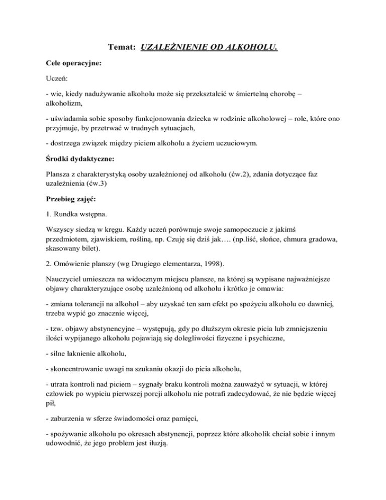 Temat: UZALEŻNIENIE OD ALKOHOLU.