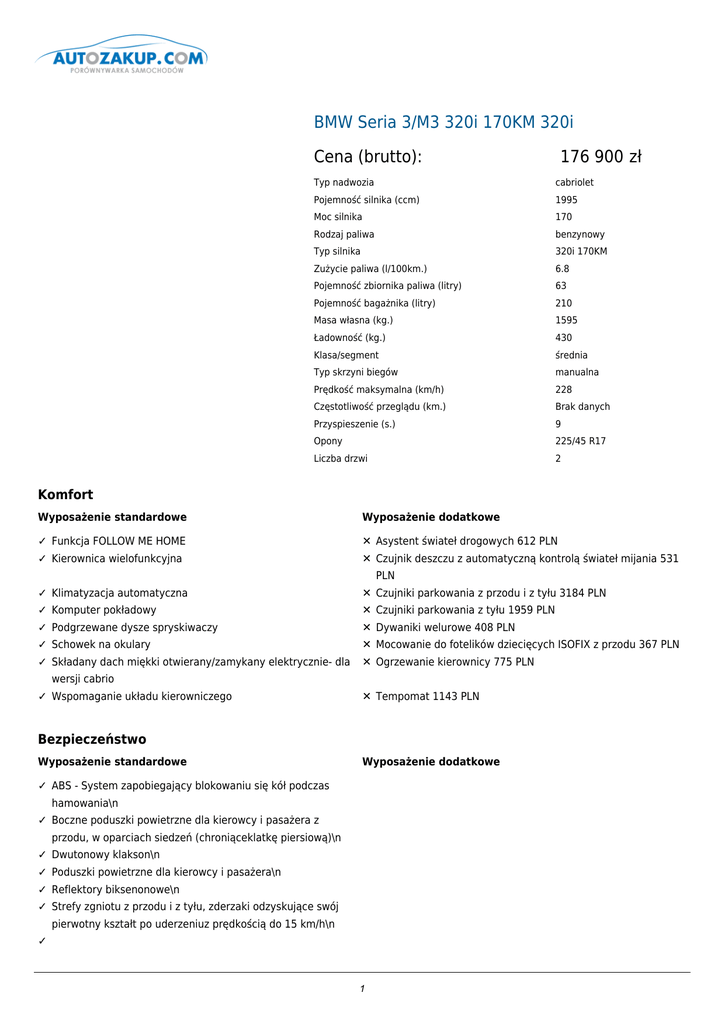 BMW Seria 3/M3 320i 170KM 320i Cena (brutto): 176 900 zł Typ nadwozia cabriolet Pojemność silnika (ccm) 1995 Moc silnika 170 Rodzaj paliwa benzynowy Typ silnika 320i 170KM Zużycie paliwa (l/100km.) 6.8 Pojemność zbiornika paliwa (litry) 63 Pojemność bagażnika (litry) 210 Masa własna (kg.) 1595 Ładowność (kg.) 430 Klasa/segment średnia Typ skrzyni biegów manualna Prędkość maksymalna (km/h) 228 Częstotliwość przeglądu (km.) Brak danych Przyspieszenie (s.) 9 Opony 225/45 R17 Liczba drzwi 2 Komfort Wyposażenie standardowe Wyposażenie dodatkowe ✓ Funkcja FOLLOW ME HOME ✕ Asystent świateł drogowych 612 PLN ✓ Kierownica wielofunkcyjna ✕ Czujnik deszczu z automatyczną kontrolą świateł mijania 531 ✓ Klimatyzacja automatyczna ✕ Czujniki parkowania z przodu i z tyłu 3184 PLN ✓ Komputer pokładowy ✕ Czujniki parkowania z tyłu 1959 PLN ✓ Podgrzewane dysze spryskiwaczy ✕ Dywaniki welurowe 408 PLN ✓ Schowek na okulary ✕ Mocowanie do fotelików dziecięcych ISOFIX z przodu 367 PLN ✓ Składany dach miękki otwierany/zamykany elektrycznie- dla ✕ Ogrzewanie kierownicy 775 PLN PLN wersji cabrio ✓ Wspomaganie układu kierowniczego ✕ Tempomat 1143 PLN Bezpieczeństwo Wyposażenie standardowe Wyposażenie dodatkowe ✓ ABS - System zapobiegający blokowaniu się kół podczas hamowania\n ✓ Boczne poduszki powietrzne dla kierowcy i pasażera z przodu, w oparciach siedzeń (chroniąceklatkę piersiową)\n ✓ Dwutonowy klakson\n ✓ Poduszki powietrzne dla kierowcy i pasażera\n ✓ Reflektory biksenonowe\n ✓ Strefy zgniotu z przodu i z tyłu, zderzaki odzyskujące swój pierwotny kształt po uderzeniuz prędkością do 15 km/h\n ✓ 1 Światła do jazdy dziennej\n 2 ✓ Trójkąt ostrzegawczy i apteczka\n ✓ Tryb kontroli trakcji (DTC)\n ✓ Układ dynamicznej kontroli stabilności (DSC) z systemem automatycznej kontroli trakcji (ASC+T)\n Dodatki Wyposażenie standardowe Wyposażenie dodatkowe ✓ 6-biegowa manualna skrzynia biegów ✕ Automatyczna skrzynia biegów Steptronic 8938 PLN ✓ Aktywne zagłówki z przodu, regulowane, automatyczny ✕ Diodowe elementy świetlne 1224 PLN zaciskna wypadek zderzenia ✓ Atrapa chłodnicy z grillem w kolorze czarnym i ✕ Dodatkowe gniazda 12V 122 PLN chromowanym obramowaniem ✓ Bezpośredni wtrysk benzyny High Precision Injection ✕ Dostęp komfortowy 2816 PLN ✓ Centralny zamek z dwoma pilotami radiowym ✕ Dzielone i składane oparcie kanapy z tyłu ze zintegrowanym zintegrowanymi w kluczyku rękawembagażowym 816 PLN ✓ Chromowana listwa boczna ✕ Hak holowniczy ze zdejmowaną kulą 3592 PLN ✓ Chromowane obramowania szyb ✕ Interfejs audio USB 1224 PLN ✓ Chromowane progi drzwiowe z emblematem BMW ✕ Internet 408 PLN ✓ Dynamiczne światła stop, intensywność świateł ✕ Lakier metalizowany 3428 PLN dostosowanado siły hamowania ✓ Elektryczne szyby z przodu i z tyłu ✕ Listwy ozdobne czarne błyszczące 612 PLN ✓ Elementy zewnętrzne w kolorze karoserii ✕ Listwy ozdobne drewno szlachetne bambus 2000 PLN ✓ Gniazdo AUX-IN ✕ Listwy ozdobne drewno szlachetne korzeń orzecha 2000 PLN ✓ Immobilizer ✕ Listwy ozdobne drewno szlachetne orzech jasny 2000 PLN ✓ Komfortowe wsiadanie dla kierowcy i pasażera ✕ Listwy ozdobne szlifowane aluminium 1469 PLN ✓ Konsola centralna z tyłu ze schowkiem ✕ Lusterka zewnętrzne i wewnętrzne przyciemnianeautomatycznie 2367 PLN ✓ Lakier niemetalizowany ✕ Obramowania Shadow Line BMW Individual,na wysoki połysk 2122 PLN ✓ Listwy ozdobne satynowo srebrne mat ✕ Obręcze kół ze stopu lekkiego Double Spoke 313M, 19 cali 2735 PLN ✓ Lusterka zewnętrzne regulowane elektrycznie, ogrzewane, ✕ Obręcze kół ze stopu lekkiego Star Spoke 189z ogumieniem asferyczne ✓ Lusterka zewnętrzne w kolorze karoserii, okrągłe, mieszanym, 18 cali 5306 PLN ✕ Obręcze kół ze stopu lekkiego Star Spoke 193 Mz aerodynamiczne ✓ Mocowanie fotelików dziecięcych ISOFIX na zewnętrznych ogumieniem mieszanym, 18 cali 0 PLN ✕ Obręcze kół ze stopu lekkiego Star Spoke 230z ogumieniem siedzeniach tylnich mieszanym, 19 cali 8040 PLN ✓ Norma emisji spalin Euro 5 ✕ Obręcze kół ze stopu lekkiego Star Spoke 339,17 cali 571 ✓ Obręcze kół ze stopu lekkiego Star Spoke 157, 17 cali ✕ Obręcze PLN kół ze stopu lekkiego Star Spoke 340z ogumieniem mieszanym, 17 cali 2653 PLN ✓ Opony z funkcją jazdy awaryjnej Runflat z czujnikiem ✕ Obręcze kół ze stopu lekkiego V Spoke 338, 17 cali 1020 PLN uszkodzenia opony ✓ Oświetlenie powitalne, światła obrysowe z boku i światła ✕ Obręcze kół ze stopu lekkiego V Spoke 342z ogumieniem tylneaktywowane przyciskiem otwórz w pilocie radiowym mieszanym, 18 cali 5306 PLN ✓ Oświetlenie wnętrza z lampkami do czytania ✕ Ogrzewanie foteli przednich 1510 PLN ✓ Osłony przeciwsłoneczne z podświetlanymi lusterkami do ✕ Ogrzewanie postojowe sterowane pilotem 5673 PLN makijażu ✓ 3 Oznaczenie modelu ✕ 4 Osłona przeciwwiatrowa 1347 PLN 5 ✓ Pakiet serwisowy BMW Service Inclusive 5 lat / 100 000 ✕ Podparcie lędźwiowe w fotelach przednich 1265 PLN km,pokrywa koszty serwisowania oraz robociznę ✓ Podgrzewanie tylnej szyby z automatyczną dezaktywacją ✕ Podłokietnik z przodu, przesuwany 612 PLN ✓ Podłokietnik przedni w konsoli centralnej, składany, ze ✕ Połączenie tkaniny i Alcantary Blue Shadow 0 PLN schowkiem ✓ Pojedyncza owalna końcówka układu wydechowego, matowy ✕ Przygotowanie do telefonu 1102 PLN chrom, z lewej strony ✓ Przycisk Start/Stop z ozdobną obwódką Chrome Pearl Grey, ✕ Przygotowanie do telefonu komórkowego ze złączem w M3 Pearl Gloss Chome Bluetooth 3143 PLN ✓ Przycisk zamka centralnego ✕ Przygotowanie do zmieniarki CD 286 PLN ✓ Radio BMW Business CD l l ✕ Radio BMW Professional 857 PLN ✓ Ręczna regulacja kolumny kierownicy w pionie i w poziomie ✕ Reflektory adaptacyjne 1837 PLN ✓ Siatki bagażowe na oparciach foteli pr