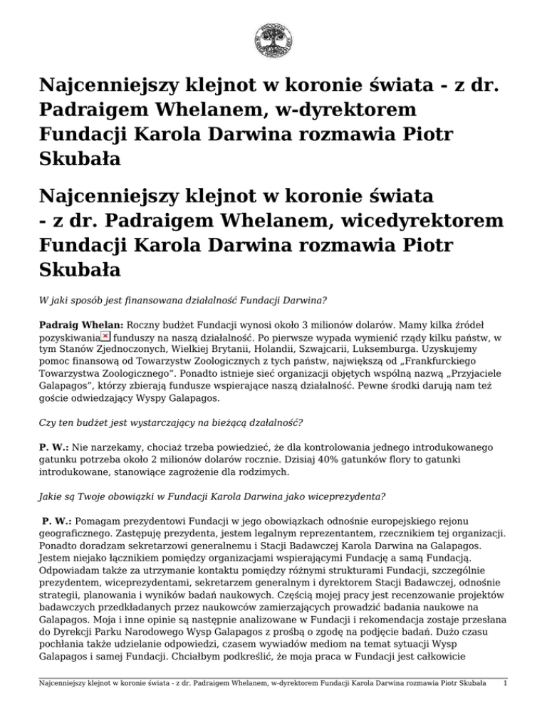 Najcenniejszy klejnot w koronie świata - z dr. Padraigem Whelanem, w-dyrektorem Fundacji Karola Darwina rozmawia Piotr Skubała Najcenniejszy klejnot w koronie świata - z dr. Padraigem Whelanem, wicedyrektorem Fundacji Karola Darwina rozmawia Piotr Skubała W jaki sposób jest finansowana działalność Fundacji Darwina? Padraig Whelan: Roczny budżet Fundacji wynosi około 3 milionów dolarów. Mamy kilka źródeł pozyskiwania funduszy na naszą działalność. Po pierwsze wypada wymienić rządy kilku państw, w tym Stanów Zjednoczonych, Wielkiej Brytanii, Holandii, Szwajcarii, Luksemburga. Uzyskujemy pomoc finansową od Towarzystw Zoologicznych z tych państw, największą od „Frankfurckiego Towarzystwa Zoologicznego”. Ponadto istnieje sieć organizacji objętych wspólną nazwą „Przyjaciele Galapagos”, którzy zbierają fundusze wspierające naszą działalność. Pewne środki darują nam też goście odwiedzający Wyspy Galapagos. Czy ten budżet jest wystarczający na bieżącą dzałalność? P. W.: Nie narzekamy, chociaż trzeba powiedzieć, że dla kontrolowania jednego introdukowanego gatunku potrzeba około 2 milionów dolarów rocznie. Dzisiaj 40% gatunków flory to gatunki introdukowane, stanowiące zagrożenie dla rodzimych. Jakie są Twoje obowiązki w Fundacji Karola Darwina jako wiceprezydenta? P. W.: Pomagam prezydentowi Fundacji w jego obowiązkach odnośnie europejskiego rejonu geograficznego. Zastępuję prezydenta, jestem legalnym reprezentantem, rzecznikiem tej organizacji. Ponadto doradzam sekretarzowi generalnemu i Stacji Badawczej Karola Darwina na Galapagos. Jestem niejako łącznikiem pomiędzy organizacjami wspierającymi Fundację a samą Fundacją. Odpowiadam także za utrzymanie kontaktu pomiędzy różnymi strukturami Fundacji, szczególnie prezydentem, wiceprezydentami, sekretarzem generalnym i dyrektorem Stacji Badawczej, odnośnie strategii, planowania i wyników badań naukowych. Częścią mojej pracy jest recenzowanie projektów badawczych przedkładanych przez naukowców zamierzających prowadzić badania naukowe na Galapagos. Moja i inne opinie są następnie analizowane w Fundacji i rekomendacja zostaje przesłana do Dyrekcji Parku Narodowego Wysp Galapagos z prośbą o zgodę na podjęcie badań. Dużo czasu pochłania także udzielanie odpowiedzi, czasem wywiadów mediom na temat sytuacji Wysp Galapagos i samej Fundacji. Chciałbym podkreślić, że moja praca w Fundacji jest całkowicie Najcenniejszy klejnot w koronie świata - z dr. Padraigem Whelanem, w-dyrektorem Fundacji Karola Darwina rozmawia Piotr Skubała 1 społeczna. Jakiej profesji są naukowcy zaangażowani w działalność Fundacji na Galapagos i z jakich wywodzą się oni krajów? P. W.: Naukowcy będący na kontrakcie na Galapagos to entomolodzy, biolodzy morza, ekolodzy, botanicy, zoolodzy, herpetolodzy, osoby zajmujące się edukacją środowiskową oraz specjaliści od analizy wyników. Wywodzą się oni głównie ze Stanów Zjednoczonych, Nowej Zelandii, Niemiec, Kanady, Hiszpanii, Wielkiej Brytanii, Danii i Szwajcarii. Czy polscy naukowcy wspierają w jakiś sposób działalność fundacji? P. W.: Spotkałem tylko jednego entomologa z Polski, profesora Gajewskiego. Czy zechciałbyś opowiedzieć o swoich badaniach naukowych, które prowadzisz obecnie na Uniwersytecie w Cork i w ramach Fundacji? P. W.: Moja praca naukowa jest związana w głównej mierze ze światem roślin. Po ukończeniu studiów (1976) pracowałem przez 4 lata w projekcie dotyczącym badań w Zatoce Cork w Irlandii. Zajmowałem się badaniami podstawowymi nad morskimi algami, również prowadziłem analizy zawartości metali ciężkich w glonach. Potem moje zainteresowania naukowe poszły w kierunku kwitnącej morskiej rośliny Zostera marina i nad nią prowadziłem badania do mojego doktoratu w latach 1980-86. W tym okresie byłem również koordynatorem kursu dla osób dorosłych na Uniwersytecie Cork pt. „Nauki środowiskowe i polityka społeczna”. Następnie zostałem zatrudniony na tej uczelni i moim zadaniem było założenie biura zajmującego się doradztwem w sprawach środowiskowych (1986-88). Kolejne kilka lat spędziłem na Galapagos. Teraz, gdy jestem na stałe zatrudniony na uczelni, prowadzę zajęcia na kilku kursach nauk środowiskowych, a naukowo pracuję nad gatunkami introdukowanymi i ochroną ginących gatunków. Tam gdzie to możliwe, prowadząc pracę na terenach chronionych, próbuję podkreślać znaczenie informacji naukowej w opracowaniu lepszej strategii ochrony zagrożonych obszarów. Czy obserwujesz poprawę stanu środowiska na Wyspach Galapagos? Czy jesteś optymistą jeżeli chodzi o przyszłość fauny i flory na tym archipelagu? P. W.: Zagrożeń istnieje bardzo wiele, każdego roku zostają wprowadzone nowe obce gatunki. Sytuację na Galapagos można by opisać w następujący sposób - czasem robimy dwa kroki do przodu, potem krok do tyłu. Bilans jest jednak pozytywny. Jaka będzie przyszłość Galapagos, czy zdołamy je uratować? Powiem tak: Galapagos jest jak nasza planeta. Jeżeli nie zdołamy jej ocalić dla przyszłych pokoleń, jeżeli okażemy się niezdolni do opracowania koncepcji zrównoważonego planu zarządzania unikalnym środowiskiem Wysp Galapagos, nie ma nadziei dla reszty świata. Wyspy Galapagos są swoistym testem dla ludzkości, jeżeli nie znajdziemy sposobu na ochronę Galapagos - nie ma przyszłości przed ludzkością. Dlaczego angażujesz cały swój czas i energię w ochronę przyrody na Galapagos, przecież na Ziemi jest jeszcze wiele miejsc o przyrodzie może równie pięknej i godnej zachowania? P. W.: Gdy rozmawiam z ludźmi na Galapagos lub w Ekwadorze używam mniej więcej takiego porównania: proszę o wymienienie rzeczy, które cenią najbardziej. Wśród najcenniejszych rzeczy Najcenniejszy klejnot w koronie świata - z dr. Padraigem Whelanem, w-dyrektorem Fundacji Karola Darwina rozmawia Piotr Skubała 2 wymieni