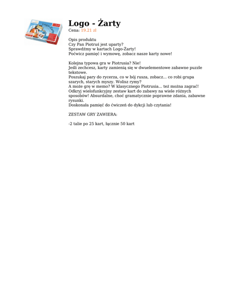 Logo - Żarty Cena: 19.21 zł Opis produktu Czy Pan Piotruś jest uparty? Sprawdźmy w kartach Logo-Żarty! Poćwicz pamięć i wymowę, zobacz nasze karty nowe! Kolejna typowa gra w Piotrusia? Nie! Jeśli zechcesz, karty zamienią się w dwuelementowe zabawne puzzle tekstowe. Poszukaj pary do rycerza, co w bój rusza, zobacz... co robi grupa szarych, starych myszy. Wolisz rymy? A może grę w memo? W klasycznego Piotrusia... też można zagrać! Odkryj wielofunkcyjny zestaw kart do zabawy na wiele różnych sposobów! Absurdalne, choć gramatycznie poprawne zdania, zabawne rysunki. Doskonała pamięć do ćwiczeń do dykcji lub czytania! ZESTAW GRY ZAWIERA: -2 talie po 25 kart, łącznie 50 kart