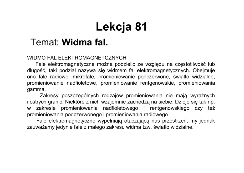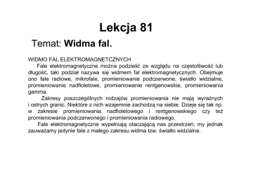 Lekcja 81 Temat: Widma fal. WIDMO FAL ELEKTROMAGNETCZNYCH Fale elektromagnetyczne można podzielić ze względu na częstotliwość lub długość, taki podział nazywa się widmem fal elektromagnetycznych. Obejmuje ono fale radiowe, mikrofale, promieniowanie podczerwone, światło widzialne, promieniowanie nadfioletowe, promieniowanie rentgenowskie, promieniowania gamma. Zakresy poszczególnych rodzajów promieniowania nie mają wyraźnych i ostrych granic. Niektóre z nich wzajemnie zachodzą na siebie. Dzieje się tak np. w zakresie promieniowania nadfioletowego i rentgenowskiego czy też promieniowania podczerwonego i promieniowania radiowego. Fale elektromagnetyczne wypełniają otaczającą nas przestrzeń, my jednak zauważamy jedynie fale z małego zakresu widma tzw. światło widzialne. Widmo fal elektromagnetycznych Fale radiowe Zakres długości fal: 10m – 2000m Wykorzystywane w radiofonii. Wytwarzane są przez prądy elektryczne wielkiej częstotliwości, przepływające przez antenę radiostacji nadawczej. Ze względu na długość fali, fale radiowe dzielimy na: fale krótkie, średnie i długie. Ze względu na środowisko propagacji wyróżnia się falę przyziemną (powierzchniową i nadziemną), falę troposferyczną, falę jonosferyczną i w przestrzeni kosmicznej. W zależności od długości fali radiowej jej propagacja jest poddana wpływowi różnorodnych zjawisk np.: dyfrakcji, refrakcji, odbicia od jonosfery itp. Fale radiowe ultrakrótkie Zakres długości fal: 1m – 10m Wykorzystuje się je do przekazywania obrazu (nadawanie programów telewizyjnych), w radiofonii i telefonii komórkowej. W telefonii komórkowej zasięg nadajnika nie przekracza kilku kilometrów, dlatego obszar działania telefonii komórkowej podzielony jest na sześciokątne komórki. W środku każdej z nich znajdują się stacje nadawczo-odbiorcze. Mikrofale Zakres długości fal: 1mm – 1m Używane są w urządzeniach radarowych. Służą do określania położenia obiektów np. samolotów oraz do określania szybkości jadącego samochodu (radar policyjny). Inne zastosowanie znajdują w kuchenkach mikrofalowych. Odbijając się od metalowych ścianek zostają pochłonięte przez cząsteczki wody w potrawach, które pod ich wpływem zaczynają bardzo szybko drgać, przez co podnosi się ich temperatura, a wraz z nią, temperatura potrawy. Promieniowanie podczerwone Zakres długości fal: 0,7µm – 1mm Jest falą krótszą od mikrofal. Jest to promieniowanie emitowane dzięki zmianom energii elektronów walencyjnych atomów. Są wysyłane przez ciała o wysokiej temperaturze np. ciało człowieka. Najdłuższe fale zaliczane do zakresu noszą nazwę podczerwieni. Ich długości mieszczą się w zakresie od kilku milimetrów do około 7×10-7 m. Znalazły zastosowanie w systemach alarmowych. Reagują ruchome źródła promieniowania podczerwonego, ignorując źródła nieruchome. Światło widzialne Zakres długości fal: 0,4µm – 0,7µm Źródła światła widzialnego: gwiazdy, Słońce, substancja podgrzana do wysokiej temperatury np. włókno żarówki, reakcje chemiczne np. płomień, świetliki, ryby, meduzy pobudzenie do świecenia cząsteczek gazów w silnym polu elektrycznym - pochłanianie promieniowania ultrafioletowego np. luminofor Długość fal światła widzialnego: 7×10-7 m – światło czerwone, 4×10-7 m – światło fioletowe Promieniowanie ultrafioletowe Zakres długości fal: 10nm – 0,4µm Wchodzi w skład promieniowania słonecznego. Wysyłane są także przez lampy kwarcowe używane w solarium. Służy do sterylizacji w szpitalach, ponieważ zabija bakterie i wirusy. Dzięki niemu opalamy się. Pobudza proces produkcji witaminy D w naszym organizmie. Może być przyczyną raka skóry. W górnej części atmosfery ziemskiej znajduje się warstwa ozonu, która chroni powierzchnię ziemi przed tym promieniowaniem. Promieniowanie rentgenowskie (X) Zakres długości fal: 0,01nm – 10nm Powstaje przy hamowaniu szybkich cząstek naładowanych w materii. Jest pochłaniane w różnych stopniu przez różne substancje. Wykorzystywane jest w aparatach rentgenowskich do diagnozowania złamań, skręceń itp. Jest to promieniowanie szkodliwe dla zdrowia. Promieniowanie gamma (γ) Zakres długości fal: < 0,01nm Towarzyszy procesom zachodzącym w jądrach atomowych. Jest wysyłane przez substancje promieniotwórcze. Ma największą częstotliwość i najmniejszą długość fali. Potrafi przeniknąć przez trzymetrową warstwę betonu. Zaczernia kliszę fotograficzną, co pozwala na jego rejestrację. Zabija wszystkie żywe komórki, również nowotworowe, dlatego jest wykorzystywany w leczeniu nowotworów. Urządzenie służące do tego nazywa się bombą kobaltową. Widma liniowe Pierwiastki podgrzane do wysokiej temperatury wysyłają charakterystyczne dla siebie promieniowanie. Za pomocą siatki dyfrakcyjnej możemy uzyskać widmo złożone z linii. Widmo światła białego Widmo emisyjne rtęci Widmo emisyjne helu Widmo emisyjne miedzi Widma światła wysyłanego przez gorące substancje nazywamy emisyjnymi. Widma innego rodzaju, nazywane absorpcyjnymi, otrzymujemy wówczas, gdy badamy światło, którego część została pochłonięta, czyli zaabsorbowana. Przepuszczamy wiązkę światła białego przez gaz (badaną substancję) i kierujemy na je na siatkę dyfrakcyjną. Na ekranie otrzymujemy wówczas widmo ciągłe z ciemnymi prążkami odpowiadającymi falom, które zostały z widma wyeliminowane (pochłonięte). Metoda ta służy do wyznaczenia składu chemicznego badanej substancji. Gazowy absorbent musi być chłodny (temp. Musi być niższa od temp. Źródła światła białego). Widmo absorpcyjne sodu Widmo absorpcyjne pochodzące ze Słońca Zadanie 1. Jakiemu zakresowi promieniowania elektromagnetycznego odpowiadają następujące długości fal (zmierzone w różni): 1 km, 3 cm, 5 µm, 500 nm, 50 nm, 1 pm? Zadanie 2. Jakiemu zakresowi promieniowania ele