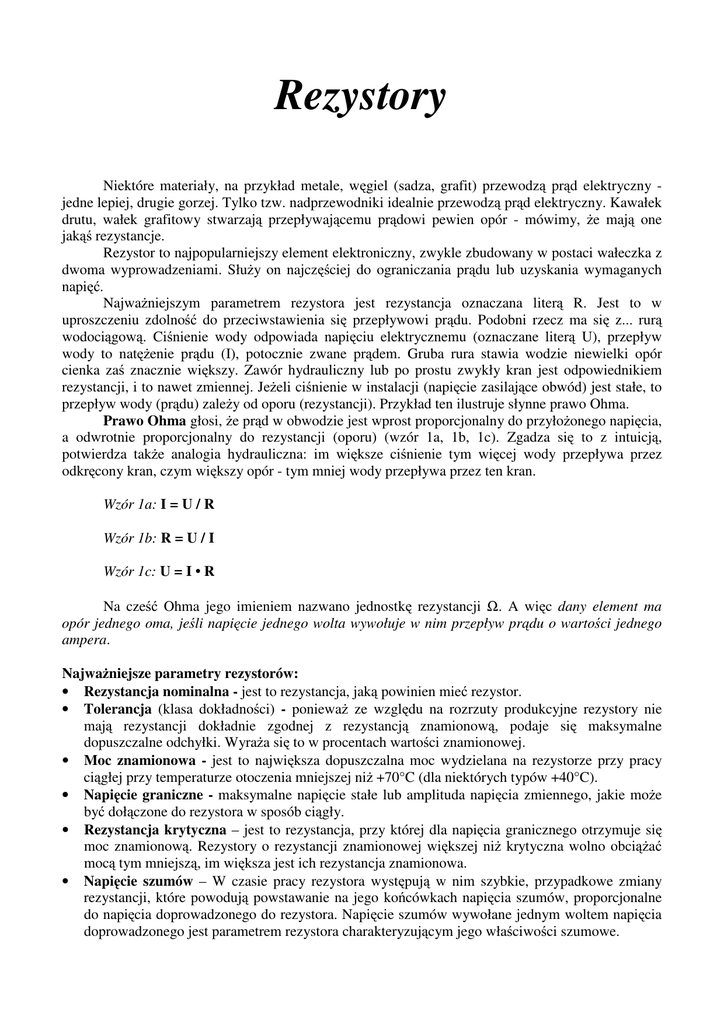 Rezystory Niektóre materiały, na przykład metale, węgiel (sadza, grafit) przewodzą prąd elektryczny jedne lepiej, drugie gorzej. Tylko tzw. nadprzewodniki idealnie przewodzą prąd elektryczny. Kawałek drutu, wałek grafitowy stwarzają przepływającemu prądowi pewien opór - mówimy, że mają one jakąś rezystancje. Rezystor to najpopularniejszy element elektroniczny, zwykle zbudowany w postaci wałeczka z dwoma wyprowadzeniami. Służy on najczęściej do ograniczania prądu lub uzyskania wymaganych napięć. Najważniejszym parametrem rezystora jest rezystancja oznaczana literą R. Jest to w uproszczeniu zdolność do przeciwstawienia się przepływowi prądu. Podobni rzecz ma się z... rurą wodociągową. Ciśnienie wody odpowiada napięciu elektrycznemu (oznaczane literą U), przepływ wody to natężenie prądu (I), potocznie zwane prądem. Gruba rura stawia wodzie niewielki opór cienka zaś znacznie większy. Zawór hydrauliczny lub po prostu zwykły kran jest odpowiednikiem rezystancji, i to nawet zmiennej. Jeżeli ciśnienie w instalacji (napięcie zasilające obwód) jest stałe, to przepływ wody (prądu) zależy od oporu (rezystancji). Przykład ten ilustruje słynne prawo Ohma. Prawo Ohma głosi, że prąd w obwodzie jest wprost proporcjonalny do przyłożonego napięcia, a odwrotnie proporcjonalny do rezystancji (oporu) (wzór 1a, 1b, 1c). Zgadza się to z intuicją, potwierdza także analogia hydrauliczna: im większe ciśnienie tym więcej wody przepływa przez odkręcony kran, czym większy opór - tym mniej wody przepływa przez ten kran. Wzór 1a: I = U / R Wzór 1b: R = U / I Wzór 1c: U = I • R Na cześć Ohma jego imieniem nazwano jednostkę rezystancji Ω. A więc dany element ma opór jednego oma, jeśli napięcie jednego wolta wywołuje w nim przepływ prądu o wartości jednego ampera. Najważniejsze parametry rezystorów: • Rezystancja nominalna - jest to rezystancja, jaką powinien mieć rezystor. • Tolerancja (klasa dokładności) - ponieważ ze względu na rozrzuty produkcyjne rezystory nie mają rezystancji dokładnie zgodnej z rezystancją znamionową, podaje się maksymalne dopuszczalne odchyłki. Wyraża się to w procentach wartości znamionowej. • Moc znamionowa - jest to największa dopuszczalna moc wydzielana na rezystorze przy pracy ciągłej przy temperaturze otoczenia mniejszej niż +70°C (dla niektórych typów +40°C). • Napięcie graniczne - maksymalne napięcie stałe lub amplituda napięcia zmiennego, jakie może być dołączone do rezystora w sposób ciągły. • Rezystancja krytyczna – jest to rezystancja, przy której dla napięcia granicznego otrzymuje się moc znamionową. Rezystory o rezystancji znamionowej większej niż krytyczna wolno obciążać mocą tym mniejszą, im większa jest ich rezystancja znamionowa. • Napięcie szumów – W czasie pracy rezystora występują w nim szybkie, przypadkowe zmiany rezystancji, które powodują powstawanie na jego końcówkach napięcia szumów, proporcjonalne do napięcia doprowadzonego do rezystora. Napięcie szumów wywołane jednym woltem napięcia doprowadzonego jest parametrem rezystora charakteryzującym jego właściwości szumowe. -2• Temperaturowy współczynnik rezystancji - oznaczony w krajowych źródłach TWR, lub z angielskiego TCR, określa zmiany rezystancji pod wpływem temperatury. Czym mniejsza wartość TCR, tym bardziej stabilny rezystor. Wartość TCR podaje się w %/K lub ppm/K (1% = 104ppm). Niestabilność parametrów rezystora w zależności od warunków otoczenia. Jednym z głównych czynników warunkujących zachowanie parametrów rezystora jest temperatura. Oprócz rezystancji zmieniają się także inne parametry. Dopuszczalne obciążenie rezystorów jest stałe do pewnej granicy temperatury (zazwyczaj ok. 60˚C), po której przekroczeniu następuje jego spadek z 100 do 0% na długości ok. 40˚C. Na parametry mają także wpływ inne czynniki zewnętrzne zawarte w tabelce: Tabela 1. Zmiany rezystancji rezystora węglowego w zależności od czynników zewnętrznych. Czynnik Lutowanie (350˚C w odległości 3 mm Cykliczne obciążanie (500-krotne włączanie i wyłączanie napięcia w ciągu 1000 godzin) Wibracje (20 g) i wstrząsy (100 g) Wilgotność (wilgotność względna 95% w temp. 40˚C) Współczynnik napięciowy (zmiana o 10 V) Temperatura (25˚C do -15˚C) Temperatura (25˚C do 85˚C) Zmiana rezystancji R = 1k R = 10 M. ± 2% ± 2% Na stałe? tak ± 4 – 6% ± 4 – 6% tak ± 2% + 6% -0,15% +2,5% +3,3% ± 2% + 10% -0,3% +4,5% +5,9% tak nie nie nie nie Produkcja. Obecnie produkowane są rezystory o wartości od 0,01 Ω do 1012 Ω (1 ΤΩ [teraom] czyli 1000 GΩ [gigaomów] ), mocy znamionowej od 1/8 wata do 250 W i dokładności od ±0,005% do ±20%. Połączenia rezystorów. Wyróżniamy dwa typy połączeń: równoległe i szeregowe. Szeregowe połączenie polega na złączeniu dwóch (lub więcej) R1 R2 oporników jeden za drugim (rys. 1a). W tym przypadku a) rezystancja, czyli opór sumują się (wzór 2a). Połączenie równoległe zaś polega - jak sama nazwa wskazuje - na R1 równoległym połączeniu oporników (rys. 1b). Opór w tedy R2 jest równy ilorazowi ich wartości rezystancji podzieloną b) przez sumę wartości rezystancji poszczególnych oporników (wzór 2b). Uwaga! Wzór 2 można zastosować dla dwóch Rysunek 1. Połączenia rezystorów: a) szeregowe; b) równoległe. lub więcej rezystorów, podczas gdy wzór 3 tylko dla dwóch rezystorów. Wzór 2a: R = R1 + R2 + ... Wzór 2b: R = R1R2 1 lub: R = 1 1 R1 + R2 + + ... R1 R2 Oznaczenie rezystorów. W oznaczeniach rezystorów rozróżniamy trzy kody: cyfrowy, cyfrowo-literowy i barwny (paskowym). Kod cyfrowy polega na zapisywaniu wartości rezystancji, tolerancji, temperaturowym współczynniku rezystancji itp. za pomocą cyfr, np.: 210 Ω, 1 kΩ = 1000 Ω, 1,2 -3MΩ 20%, 470 k 0,5% 10%/Κ itp. (UWAGA! W praktyce często pomija się symbol Ω przy zapis
