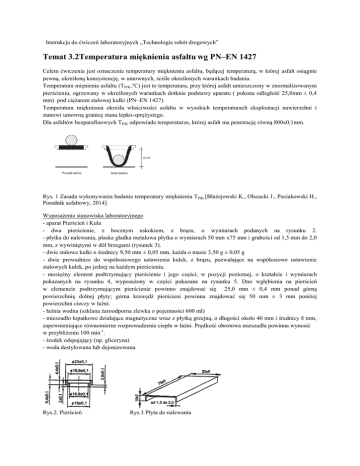 Instrukcja do ćwiczeń laboratoryjnych „Technologia robót drogowych” Temat 3.2Temperatura mięknienia asfaltu wg PN–EN 1427 Celem ćwiczenia jest oznaczenie temperatury mięknienia asfaltu, będącej temperaturą, w której asfalt osiągnie pewną, określoną konsystencję, w umownych, ściśle określonych warunkach badania. Temperatura mięnienia asfaltu (T PiK,°C) jest to temperatura, przy której asfalt umieszczony w znormalizowanym pierścieniu, ogrzewany w określonych warunkach dotknie podstawy aparatu ( pokona odległość 25,0mm ± 0,4 mm) pod ciężarem stalowej kulki (PN–EN 1427). Temperatura mięknienia określa właściwości asfaltu w wysokich temperaturach eksploatacji nawierzchni i stanowi umowną granicę stanu lepko-sprężystego. Dla asfaltów bezparafinowych T PiK odpowiada temperaturze, której asfalt ma penetrację równą 800x0,1mm. Rys. 1 Zasada wykonywania badania temperatury mięknienia TPiK [Błażejowski K., Olszacki J., Peciakowski H., Poradnik asfaltowy, 2014] Wyposażenie stanowiska laboratoryjnego - aparat Pierścień i Kula - dwa pierścienie, z bocznym uskokiem, z brązu, o wymiarach podanych na rysunku 2. - płytka do nalewania, płaska gładka metalowa płytka o wymiarach 50 mm x75 mm i grubości od 1,5 mm do 2,0 mm, z wywiniętymi w dół brzegami (rysunek 3). - dwie stalowe kulki o średnicy 9,50 mm ± 0,05 mm, każda o masie 3,50 g ± 0,05 g - dwie prowadnice do współosiowego ustawienia kulek, z brązu, pozwalające na współosiowe ustawienie stalowych kulek, po jednej na każdym pierścieniu. - mosiężny element podtrzymujący pierścienie i jego części, w pozycji poziomej, o kształcie i wymiarach pokazanych na rysunku 4, wyposażony w części pokazane na rysunku 5. Dno wgłębienia na pierścień w elemencie podtrzymującym pierścienie powinno znajdować się 25,0 mm ± 0,4 mm ponad górną powierzchnię dolnej płyty; górna krawędź pierścieni powinna znajdować się 50 mm ± 3 mm poniżej powierzchni cieczy w łaźni. - łaźnia wodna (szklana żaroodporna zlewka o pojemności 600 ml) - mieszadło łopatkowe działające magnetyczne wraz z płytką grzejną, o długości około 40 mm i średnicy 8 mm, zapewnieniające równomierne rozprowadzenie ciepła w łaźni. Prędkość obrotowa mieszadła powinna wynosić w przybliżeniu 100 min-1. - środek odspajający (np. gliceryna) - woda destylowana lub dejonizowana Rys.2. Pierścień Rys.3 Płyta do nalewania Rys. 3. Prowadnica kulek Rys. 4. Element podtrzymujący pierścienie Przygotowanie próbek do badania 1. Ogrzać dwa pierścienie, lecz nie ogrzewać płytki do nalewania, do temperatury w przybliżeniu o 90 °C wyższej od spodziewanej temperatury mięknienia i umieścić je na płycie do nalewania, pokrytej środkiem odspajającym 2. Rozgrzany asfalt nalać z niewielkim nadmiarem do każdego z pierścieni i pozostawić próbki do wystygnięcia w warunkach otoczenia co najmniej na 30 min. Od czasu nalania próbek do całkowitego zakończenia badania nie może minąć więcej niż 4 h. 3. Po ostygnięciu próbek ściąć nadmiar asfaltu rozgrzanym czystym nożem lub ostrzem, tak by każda próbka wypełniała pierścienie do jego górnego poziomu. Wykonanie oznaczania Zależnie od spodziewanej temperatury mięknienia należy dobrać właściwe warunki oznaczenia: - dla temperatur mięknienia od 28°C do 80°C badanie należy przeprowadzać z użyciem wody zdejonizowanej lub destylowanej, początkowa temperatura w łaźni powinna wynosić 5°C±1°C, pomiar temperatury z dokładnością do 0,2°C. -dla temperatur mięknienia od 80 °C do 150°C badanie należy przeprowadzać z użyciem gliceryny, początkowa temperatura w łaźni powinna wynosić 30°C±1°C, pomiar temperatury z dokładnością do 0,5°C. Procedura badania w wodzie: 1. Umieścić w aparacie pierścienie z badaną próbką, tak, aby powierzchnia cieczy w łaźni znajdowała się 50 mm nad górną krawędzią pierścieni. Używając pęsety umieścić obie stalowe kulki w łaźni, można użyć oddzielnego pojemnika o temperaturze odpowiadającej temperaturze badania. Kulki powinny mieć taką samą temperaturę, co pozostałe części aparatu. 2. Schłodzić łaźnię z wodą do początkowej temperatury badania, umieszczając ją w wodzie z lodem, 3. Za pomocą pęsety umieścić kulki w prowadnicy kulek. 4.Uruchomić aparat. Ciecz w łaźni jest mieszana mieszadłem magnetycznym i jest ogrzewana od spodu, tak aby temperatura podnosiła się równomiernie z szybkością 5 °C/min. 5.Odnotowywać, dla każdego pierścienia i kulki, temperaturę wskazaną na termometrze natychmiast, gdy kulka otoczona asfaltem dotknie dolnej płytki. 6.Powtórzyć oznaczanie, jeżeli różnica pomiędzy dwoma oznaczonymi temperaturami przekracza 1°C 7.Temperatura mięknienia jest średnią z dwóch oznaczeń z dokładnością do 0,2°C. Wyniki badań Temperatura mięknienia oznaczana w wodzie jest w przybliżeniu o 4 °C niższa niż oznaczana w łaźni glicerynowej. Przy zapisie otrzymanych wyników należy postępować zgodnie z poniższymi zasadami: 1. Temperatury mięknienia od 30 °C do 80 °C oznaczone w łaźni wodnej.- podać otrzymany wynik. 2. Temperatury mięknienia powyżej 80 °C oznaczone w łaźni wodnej - odrzucić wynik jako nieprawidłowy i oznaczenie powtórzyć w glicerynie. 3. Temperatury mięknienia 84 °C i niższe oznaczone w łaźni glicerynowej. Powtórzyć oznaczanie w łaźni wodnej. Jeżeli wynik oznaczania w łaźni wodnej wynosi 80 °C lub poniżej, podać te wyniki, w przeciwnym razie podać wyniki otrzymane w łaźni glicerynowej. 4. Temperatury mięknienia powyżej 84 °C oznaczone w łaźni glicerynowej. Podać otrzymany wynik. Opracowała: mgr inż. Agnieszka Woszuk Katedra Dróg i Mostów