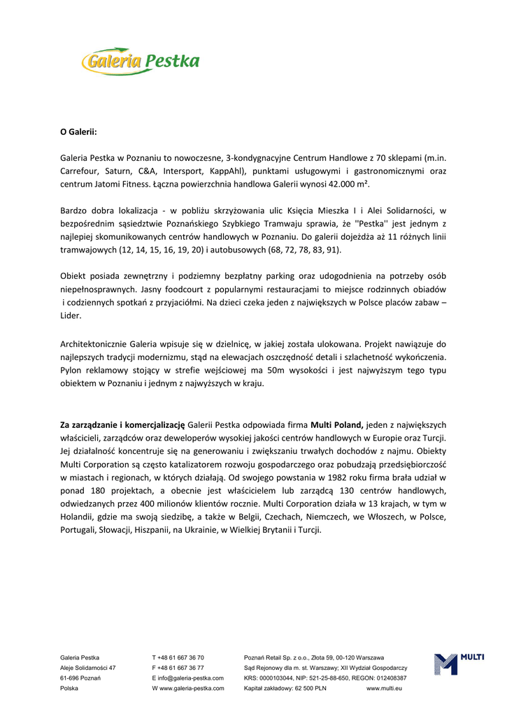 O Galerii: Galeria Pestka w Poznaniu to nowoczesne, 3-kondygnacyjne Centrum Handlowe z 70 sklepami (m.in. Carrefour, Saturn, C&A, Intersport, KappAhl), punktami usługowymi i gastronomicznymi oraz centrum Jatomi Fitness. Łączna powierzchnia handlowa Galerii wynosi 42.000 m². Bardzo dobra lokalizacja - w pobliżu skrzyżowania ulic Księcia Mieszka I i Alei Solidarności, w bezpośrednim sąsiedztwie Poznańskiego Szybkiego Tramwaju sprawia, że ''Pestka'' jest jednym z najlepiej skomunikowanych centrów handlowych w Poznaniu. Do galerii dojeżdża aż 11 różnych linii tramwajowych (12, 14, 15, 16, 19, 20) i autobusowych (68, 72, 78, 83, 91). Obiekt posiada zewnętrzny i podziemny bezpłatny parking oraz udogodnienia na potrzeby osób niepełnosprawnych. Jasny foodcourt z popularnymi restauracjami to miejsce rodzinnych obiadów i codziennych spotkań z przyjaciółmi. Na dzieci czeka jeden z największych w Polsce placów zabaw – Lider. Architektonicznie Galeria wpisuje się w dzielnicę, w jakiej została ulokowana. Projekt nawiązuje do najlepszych tradycji modernizmu, stąd na elewacjach oszczędność detali i szlachetność wykończenia. Pylon reklamowy stojący w strefie wejściowej ma 50m wysokości i jest najwyższym tego typu obiektem w Poznaniu i jednym z najwyższych w kraju. Za zarządzanie i komercjalizację Galerii Pestka odpowiada firma Multi Poland, jeden z największych właścicieli, zarządców oraz deweloperów wysokiej jakości centrów handlowych w Europie oraz Turcji. Jej działalność koncentruje się na generowaniu i zwiększaniu trwałych dochodów z najmu. Obiekty Multi Corporation są często katalizatorem rozwoju gospodarczego oraz pobudzają przedsiębiorczość w miastach i regionach, w których działają. Od swojego powstania w 1982 roku firma brała udział w ponad 180 projektach, a obecnie jest właścicielem lub zarządcą 130 centrów handlowych, odwiedzanych przez 400 milionów klientów rocznie. Multi Corporation działa w 13 krajach, w tym w Holandii, gdzie ma swoją siedzibę, a także w Belgii, Czechach, Niemczech, we Włoszech, w Polsce, Portugali, Słowacji, Hiszpanii, na Ukrainie, w Wielkiej Brytanii i Turcji. Galeria Pestka T +48 61 667 36 70 Poznań Retail Sp. z o.o., Złota 59, 00-120 Warszawa Aleje Solidarności 47 F +48 61 667 36 77 Sąd Rejonowy dla m. st. Warszawy; XII Wydział Gospodarczy 61-696 Poznań E [email protected] KRS: 0000103044, NIP: 521-25-88-650, REGON: 012408387 Polska W www.galeria-pestka.com Kapitał zakładowy: 62 500 PLN www.multi.eu
