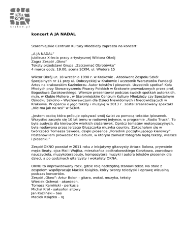 koncert A JA NADAL Staromiejskie Centrum Kultury Młodzieży zaprasza na koncert: „A JA NADAL” Jubileusz X-lecia pracy artystycznej Wiktora Okrój Zagra Zespół „Okno” Teksty przedstawi Grupa „Zatrzymać Obrotówkę” 4 marca godz. 19.00, scena SCKM, ul. Wietora 15 Wiktor Okrój ur. 18 września 1990 r. w Krakowie . Absolwent Zespołu Szkół Specjalnych nr 11 przy ul. Dobczyckiej w Krakowie i uczestnik Warsztatów Fundacji Artes na krakowskim Kazimierzu. Autor tekstów i piosenek. Uczestnik spotkań Koła Młodych przy Stowarzyszeniu Pisarzy Polskich w Krakowie prowadzonych przez prof. Bogusława Żurakowskiego. Wiersze prezentował podczas swoich spotkań autorskich, m.in. w Klubie Moliere , w Staromiejskim Centrum Kultury Młodzieży czy Specjalnym Ośrodku Szkolno – Wychowawczym dla Dzieci Niewidomych i Niedowidzących w Krakowie. W oparciu o jego teksty i muzykę w 2013 r . został zrealizowany spektakl „Nie ma jak na wsi” w SCKM. „Jestem osobą która próbuje opisywać swój świat za pomocą tekstów /piosenek. Wszystko zaczęło się 10 lat temu w radiowej Jedynce, w programie „Radio Truck”. To była audycja dla kierowców wielkich ciężarówek. Oprócz tematów motoryzacyjnych, była nadawana przez Jerzego Głuszczyka muzyka country. Zakochałem się w twórczości Tomasza Szweda, dzięki piosence „Poradnik początkującego kierowcy”. Postanowiłem prowadzić taki album, w którym zamiast fotografii będą teksty, wiersze i piosenki.” Zespół OKNO powstał w 2011 roku z inicjatywy gitarzysty Artura Bolona, prywatnie męża Beaty, ojca Mai i Wojtka, mieszkańca podkrakowskiego Gorzkowa, zawodowo nauczyciela, muzykoterapeuty, kompozytora muzyki i autora tekstów piosenek dla dzieci, a po godzinach gitarzysty i wokalisty OKNA. OKNO to improwizowany rock, gdzie rolę nadrzędną stanowi tekst. Na stałe z zespołem współpracuje Maciek Książko, który tworzy teledyski i oprawę wizualną podczas koncertów. Zespół „Okno”: Artur Bolon - gitara, wokal, muzyka, teksty Wiesiek Ochwat - akordeon, Tomasz Kamiński - perkusja Michał Król - saksofon altowy Jan Koźliński - bas Maciek Książko – VJ Powered by TCPDF (www.tcpdf.org)