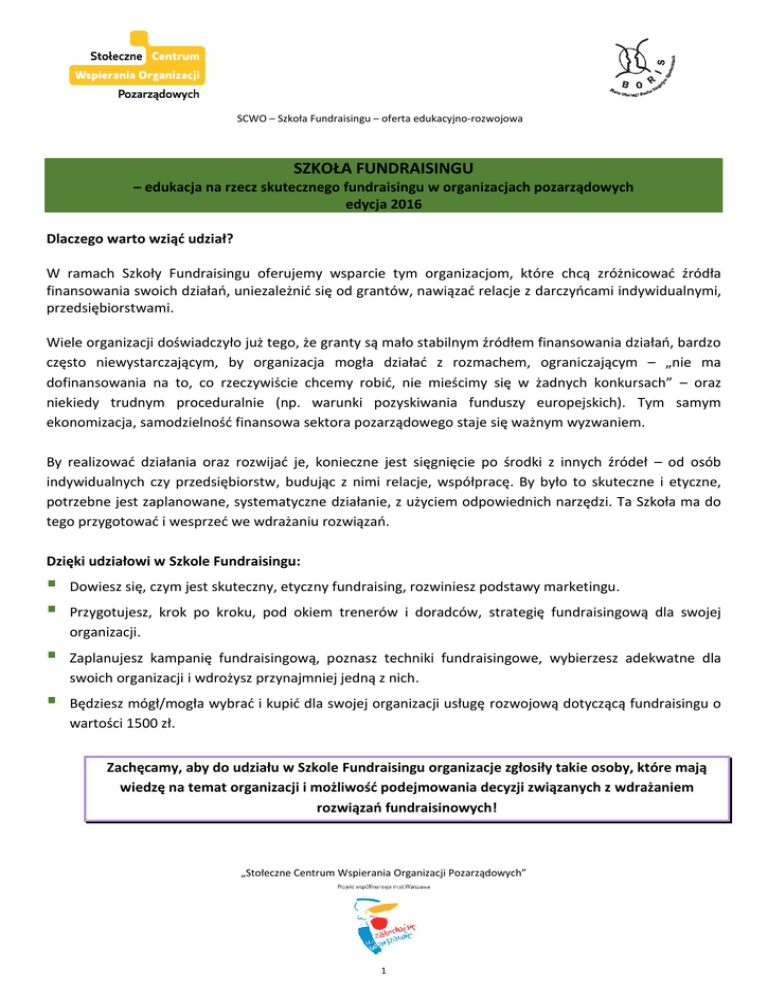 SCWO – Szkoła Fundraisingu – oferta edukacyjno-rozwojowa SZKOŁA FUNDRAISINGU – edukacja na rzecz skutecznego fundraisingu w organizacjach pozarządowych edycja 2016 Dlaczego warto wziąć udział? W ramach Szkoły Fundraisingu oferujemy wsparcie tym organizacjom, które chcą zróżnicować źródła finansowania swoich działań, uniezależnić się od grantów, nawiązać relacje z darczyńcami indywidualnymi, przedsiębiorstwami. Wiele organizacji doświadczyło już tego, że granty są mało stabilnym źródłem finansowania działań, bardzo często niewystarczającym, by organizacja mogła działać z rozmachem, ograniczającym – „nie ma dofinansowania na to, co rzeczywiście chcemy robić, nie mieścimy się w żadnych konkursach” – oraz niekiedy trudnym proceduralnie (np. warunki pozyskiwania funduszy europejskich). Tym samym ekonomizacja, samodzielność finansowa sektora pozarządowego staje się ważnym wyzwaniem. By realizować działania oraz rozwijać je, konieczne jest sięgnięcie po środki z innych źródeł – od osób indywidualnych czy przedsiębiorstw, budując z nimi relacje, współpracę. By było to skuteczne i etyczne, potrzebne jest zaplanowane, systematyczne działanie, z użyciem odpowiednich narzędzi. Ta Szkoła ma do tego przygotować i wesprzeć we wdrażaniu rozwiązań. Dzięki udziałowi w Szkole Fundraisingu: Dowiesz się, czym jest skuteczny, etyczny fundraising, rozwiniesz podstawy marketingu. Przygotujesz, krok po kroku, pod okiem trenerów i doradców, strategię fundraisingową dla swojej organizacji. Zaplanujesz kampanię fundraisingową, poznasz techniki fundraisingowe, wybierzesz adekwatne dla swoich organizacji i wdrożysz przynajmniej jedną z nich. Będziesz mógł/mogła wybrać i kupić dla swojej organizacji usługę rozwojową dotyczącą fundraisingu o wartości 1500 zł. Zachęcamy, aby do udziału w Szkole Fundraisingu organizacje zgłosiły takie osoby, które mają wiedzę na temat organizacji i możliwość podejmowania decyzji związanych z wdrażaniem rozwiązań fundraisinowych! „Stołeczne Centrum Wspierania Organizacji Pozarządowych” 1 SCWO – Szkoła Fundraisingu – oferta edukacyjno-rozwojowa SZKOŁA FUNDRAISINGU – zapoznaj się z opisem procesu edukacji i działań rozwojowych (szczegółowym programem) Sposób organizacji zajęć: Zajęcia prowadzone aktywnymi metodami, uczenia przez doświadczenie, przez doświadczonych praktyków fundraisingu – osoby, które na co dzień wdrażają kampanie fundraisingowe w organizacjach. Trenerem wiodącym i opiekunem merytorycznym jest Andrzej Pietrucha – trener fundraisingu, ekspert związany z Fundacją Akademia Organizacji Obywatelskich i Stowarzyszeniem BORIS, szef korporacyjnej Fundacji BOŚ. Szkolenia odbędą się w siedzibie SCWO ul. Warecka 4/6, doradztwo w siedzibie organizacji lub w siedzibie SCWO. Podczas szkoleń Stowarzyszenie BORIS zapewnia poczęstunek (nie zapewniamy obiadu). Finansowanie: Udział w Szkole Fundraisingu jest bezpłatny, dofinansowany przez Miasto St. Warszawa w ramach Stołecznego Centrum Współpracy Organizacji Pozarządowych. Nabór do procesu wsparcia: Ze wsparcia w 2016 roku może skorzystać 8 organizacji pozarządowych działających ponad 2 lata na rzecz mieszkańców Warszawy. Z każdej organizacji zapraszamy 2 osoby. Zależy nam, aby te same osoby uczestniczyły we wszystkich zaplanowanych zjazdach. Dzięki temu w każdej organizacji będą 2 osoby, które mają wiedzę i umiejętności fundraisngowe, zwiększa to szanse na wdrożenie przez organizację. W uzasadnionych przypadkach proponujemy zastępstwo (w uzgodnieniu ze specjalistką ds. edukacji). Należy zgłosić się poprzez Kwestionariusz zgłoszeniowy Szkoła Fundraisingu, a przede wszystkim, być zmotywowanym/zmotywowaną do systemowej pracy nad rozwojem fundraisingu w swojej organizacji. Organizacje, które zostaną wybrane w procesie rekrutacji zostaną zaproszone na spotkanie otwierające i podpiszą Porozumienie o współpracy w ramach Szkoły Fundraisingu. Daty procesu rekrutacji: Przysłanie kwestionariusza zgłoszeniowego ze strony organizacji Decyzja Komisji dotycząca organizacji uczestniczących i wysłane zawiadomienia Spotkanie edukacyjne otwierające do 5 lutego 2016 10 lutego 2016 24 lutego 2016 Na pytania odpowiada: Marta Henzler, specjalistka ds. edukacji, [email protected], 22 620 31 92. Kwestionariusz zgłoszeniowy należy wysłać do dnia 5 lutego 2016 na adres e-mail: [email protected]. ZAPRASZAMY DO WSPÓLNEJ EDUKACJI! „Stołeczne Centrum Wspierania Organizacji Pozarządowych” 2