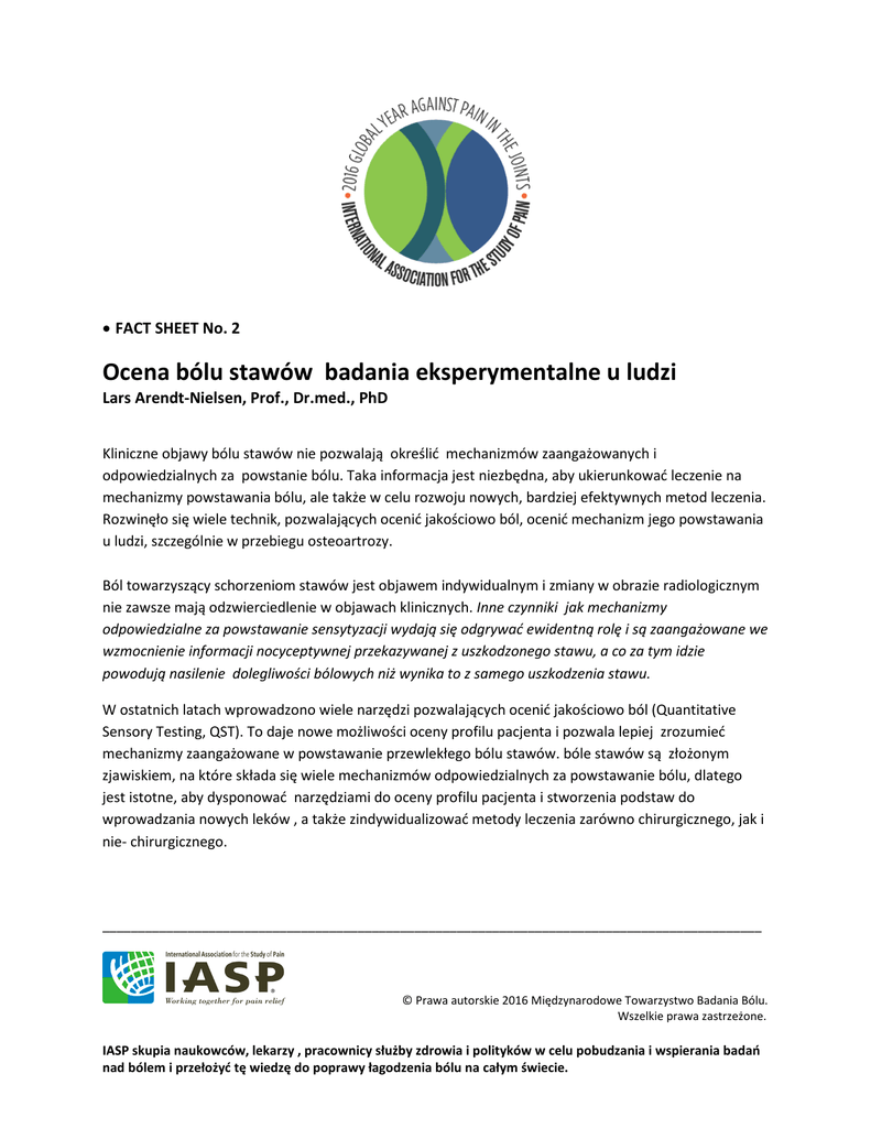 • FACT SHEET No. 2 Ocena bólu stawów badania eksperymentalne u ludzi Lars Arendt-Nielsen, Prof., Dr.med., PhD Kliniczne objawy bólu stawów nie pozwalają określić mechanizmów zaangażowanych i odpowiedzialnych za powstanie bólu. Taka informacja jest niezbędna, aby ukierunkować leczenie na mechanizmy powstawania bólu, ale także w celu rozwoju nowych, bardziej efektywnych metod leczenia. Rozwinęło się wiele technik, pozwalających ocenić jakościowo ból, ocenić mechanizm jego powstawania u ludzi, szczególnie w przebiegu osteoartrozy. Ból towarzyszący schorzeniom stawów jest objawem indywidualnym i zmiany w obrazie radiologicznym nie zawsze mają odzwierciedlenie w objawach klinicznych. Inne czynniki jak mechanizmy odpowiedzialne za powstawanie sensytyzacji wydają się odgrywać ewidentną rolę i są zaangażowane we wzmocnienie informacji nocyceptywnej przekazywanej z uszkodzonego stawu, a co za tym idzie powodują nasilenie dolegliwości bólowych niż wynika to z samego uszkodzenia stawu. W ostatnich latach wprowadzono wiele narzędzi pozwalających ocenić jakościowo ból (Quantitative Sensory Testing, QST). To daje nowe możliwości oceny profilu pacjenta i pozwala lepiej zrozumieć mechanizmy zaangażowane w powstawanie przewlekłego bólu stawów. bóle stawów są złożonym zjawiskiem, na które składa się wiele mechanizmów odpowiedzialnych za powstawanie bólu, dlatego jest istotne, aby dysponować narzędziami do oceny profilu pacjenta i stworzenia podstaw do wprowadzania nowych leków , a także zindywidualizować metody leczenia zarówno chirurgicznego, jak i nie- chirurgicznego. _____________________________________________________________________________________________ © Prawa autorskie 2016 Międzynarodowe Towarzystwo Badania Bólu. Wszelkie prawa zastrzeżone. IASP skupia naukowców, lekarzy , pracownicy służby zdrowia i polityków w celu pobudzania i wspierania badań nad bólem i przełożyć tę wiedzę do poprawy łagodzenia bólu na całym świecie. Psychofizyczna odpowiedź (próg bólu lub nasilenie bólu) może być wywoływane przez bolesny lub niebolesny bodziec (np. przez stosowanie ucisku za pomocą algometru)co pozwala na jakościowę ocenę stopnia wrażliwości u pacjenta z bólem stawów i porównać go z grupą kontrolną. ocena bólu musi być wielowymiarowa, dlatego w ewaluacji jakościowej wrażliwości na ból preferowana jest wielowymiarowa ocena z zastosowaniem różnych rodzajów stymulacji- mechaniczna (np. ucisk), chemiczna (niedokrwienie), elektryczna, itp. – a także ocena różnych mechanizmów powstawania bólu (próg bólu, próg tolerancji bólu, odpowiedź na bodziec, sumowanie czasowe i przestrzenne, warunkowana modulacja bólu). Ręczny algometr uciskowy (pojedynczy obszar) jest najczęściej stosowany do oceny sensytyzacji w okolicy stawu u pacjentów z bólem stawów. Ogólnie rzecz biorąc nie jest on przydatny klinicznie do oceny wewnątrzstawowej reakcji bólowej na np. stymulację elektryczną lub artoskopowo sterowaną zlokalizowaną stymulację uciskową. Metody jakościowej oceny bólu służą przede wszystkim do oceny wtórnej reakcji w odpowiedzi na procesy w obrębie stawów(np. ze strony więzadeł, mięśni). Zwiększone odczuwanie bólu lub obniżenie progu bólu pod wpływem nacisku występują w okolicy okołostawowej (więzadła, mięśnie, ścięgna), odzwierciedlają sensytyzację obwodową i ośrodkową, natomiast zwiększone odczuwanie bólu w odległej od chorego stawu lokalizacji może odzwierciedlać rozległą , uogólnioną sensytyzację. Jeśli zlokalizowany bodziec uciskowy jest powtarzany (np. ciąg pięciu nacisków z przerwą dwóch sekund), nasilenie bólu będzie stopniowo narastać w ciągu stymulacji. Nazywane jest to „sumowaniem czasowym”. Sumowanie czasowe jest miarą ośrodkowych mechanizmów integracyjnych. U pacjentów z przewlekłym bólem stawów te mechanizmy są rozregulowane, co skutkuje ułatwieniem sumowania czasowego. Powtarzane bodźce mogą być zastosowane na okolicę okołostawową w pobliżu bolesnego stawu lub w okolicy zdrowej (rozległa, uogólniona sensytyzacja). Ułatwienie sumowania czasowego może być eksperymentalnie zahamowane przez antagonistów receptora NMDA, ale jest trudno zahamować go przez większość innych dostępnych leków. Ważnym czynnikiem wpływającym na rozprzestrzenianie się bólu i hiperalgezję jest stan zstępujących mechanizmów kontroli bólu. Zmniejszenie sprawności zstępujących dróg kontroli bólu lub zwiększenie torowania w obrębie zstępujących mechanizmów powoduje, że cały układ nerwowy osiowy staje się bardziej podatny na ból, co wynika z rozwijającej się rozlanej, uogólnionej hiperalgezji. Równowaga pomiędzy zstępującym hamowaniem i torowaniem może być oceniana eksperymentalnie u pacjentów z bólem stawów, a ogólne wnioski wskazują, że hamowanie bólu jest upośledzone. Sugeruje się, że równowaga może być wyrównana przez zastosowanie na przykład inhibitorów wychwytu zwrotnego serotoniny i noradrenaliny. _____________________________________________________________________________________________ © Prawa autorskie 2016 Międzynarodowe Towarzystwo Badania Bólu. Wszelkie prawa zastrzeżone. IASP skupia naukowców, lekarzy , pracownicy służby zdrowia i polityków w celu pobudzania i wspierania badań nad bólem i przełożyć tę wiedzę do poprawy łagodzenia bólu na całym świecie. W podsumowaniu, wielu pacjentów z przewlekłym bólem stawów ma objawy sensytyzacji obwodowej, a także uogólnionej i rozlanej. Narzędzia pomiarowe do oceny bólu mogą być zastosowane w celu oceny profilu mechanizmu odpowiedzialnego za powstanie bólu u pacjentów z przewlekłym bólem stawów i wskażą nowe możliwości zrozumienia niektórych czynników nasilających ból. Szczególne znaczenie ma pogrupowanie i sklasyfikowanie pacjentów ze specyficznymi dolegliwościami bólow