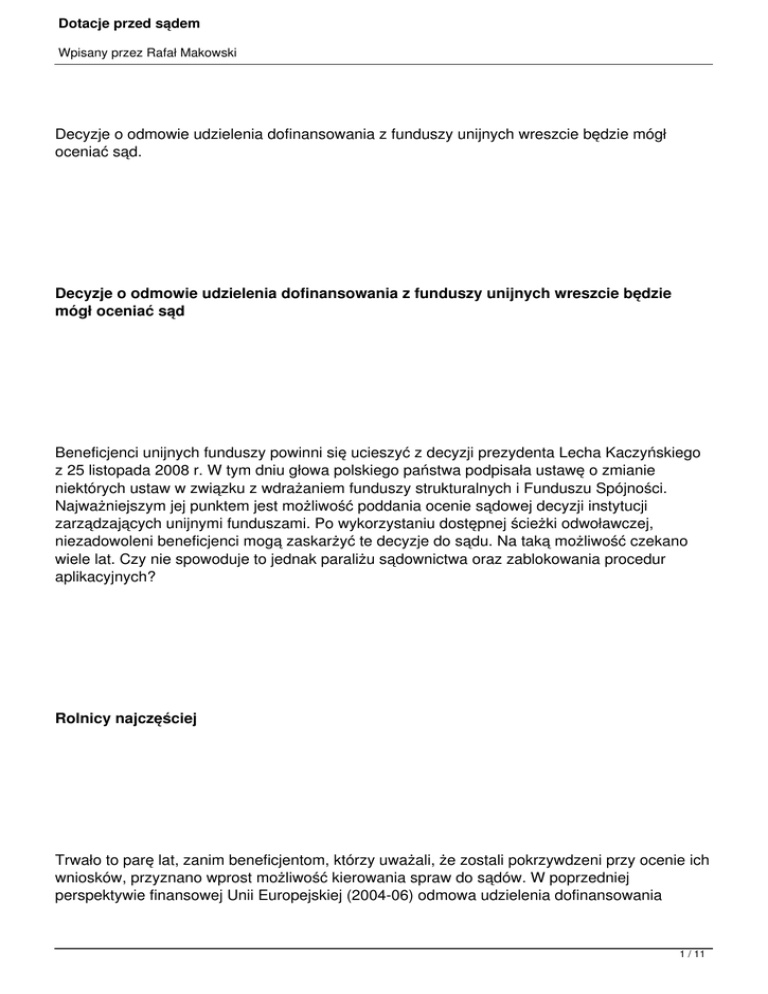 Dotacje przed sądem Wpisany przez Rafał Makowski Decyzje o odmowie udzielenia dofinansowania z funduszy unijnych wreszcie będzie mógł oceniać sąd. Decyzje o odmowie udzielenia dofinansowania z funduszy unijnych wreszcie będzie mógł oceniać sąd Beneficjenci unijnych funduszy powinni się ucieszyć z decyzji prezydenta Lecha Kaczyńskiego z 25 listopada 2008 r. W tym dniu głowa polskiego państwa podpisała ustawę o zmianie niektórych ustaw w związku z wdrażaniem funduszy strukturalnych i Funduszu Spójności. Najważniejszym jej punktem jest możliwość poddania ocenie sądowej decyzji instytucji zarządzających unijnymi funduszami. Po wykorzystaniu dostępnej ścieżki odwoławczej, niezadowoleni beneficjenci mogą zaskarżyć te decyzje do sądu. Na taką możliwość czekano wiele lat. Czy nie spowoduje to jednak paraliżu sądownictwa oraz zablokowania procedur aplikacyjnych? Rolnicy najczęściej Trwało to parę lat, zanim beneficjentom, którzy uważali, że zostali pokrzywdzeni przy ocenie ich wniosków, przyznano wprost możliwość kierowania spraw do sądów. W poprzedniej perspektywie finansowej Unii Europejskiej (2004-06) odmowa udzielenia dofinansowania 1 / 11 Dotacje przed sądem Wpisany przez Rafał Makowski przedsięwzięcia z funduszy UE kończyła proces aplikowania o pomoc finansową w realizacji projektu. - Nie było przepisu, który wprost dopuszczałby złożenie skargi do wojewódzkiego sądu administracyjnego. Zwolennicy takiej tezy powoływali się najczęściej na wyrok Wojewódzkiego Sądu Administracyjnego w Warszawie z 19 czerwca 2006 roku, w którym stwierdzono, że rozstrzygnięcie o niewybraniu do dofinansowania z Europejskiego Funduszu Rozwoju Regionalnego projektu strony uznać należy za decyzję administracyjną, a postępowanie ją poprzedzające za postępowanie administracyjne podlegające kontroli sądowej. Orzeczenie to zachęciło potencjalnych beneficjentów do zaskarżania niekorzystnych dla nich rozstrzygnięć, jednak skala zjawiska nie była i w dalszym ciągu nie jest duża. Największe zainteresowanie występowaniem na drogę sądową można było zaobserwować w zakresie środków z sektorowego programu operacyjnego dla rolników - tłumaczy mecenas Jerzy Krotoski z poznańskiej Kancelarii Krotoski-Adwokaci. Polskie prawo nie przewidywało zaskarżenia decyzji zarządu województwa, Polskiej Agencji Rozwoju Przedsiębiorczości czy Agencji Restrukturyzacji i Modernizacji Rolnictwa do sądu administracyjnego. Tylko niektóre programy operacyjne (ZPORR, SPO Wzrost Konkurencyjności Przedsiębiorstw) w perspektywie finansowej 2004-06 w ogóle przewidywały procedurę odwoławczą od decyzji odmawiającej beneficjentom udzielenia dofinansowania z funduszu Unii Europejskiej. W ustawie o zasadach prowadzenia polityki rozwoju z 2006 r., która była swoistym podsumowaniem pierwszych lat aplikowania o fundusze strukturalne w latach 2004-06, sądowej procedury odwoławczej nadal nie przewidziano podtrzymując pogląd, że odmowa udzielenia dofinansowania nie jest decyzją administracyjną. Odmowa jest decyzją 2 / 11 Dotacje przed sądem Wpisany przez Rafał Makowski Mimo wyraźnego wyłączenia sądów administracyjnych przy ocenie procedury aplikacyjnej, część beneficjentów jednak decydowała się na zaskarżanie decyzji odmawiających udzielenia dotacji. Wiele sądów uznawało się za niewłaściwe do rozpoznania skarg, ale część, w tym Naczelny Sąd Administracyjny uznała, że odmowa udzielenia dotacji jest jednak decyzją i rozpatrywała skargi. W praktyce orzeczniczej sądów administracyjnych ugruntowało się stanowisko wyrażone w uchwale NSA z 22 lutego 2007 r. (sygn. akt II GPS 3/06), zgodnie z którym skargę do sądu na rozstrzygnięcie w przedmiocie wniosku o przyznanie środków unijnych uznać można za dopuszczalną. - Brak szczególnej regulacji ustawowej, która przewidywałaby expresis verbis sądową kontrolę aktów podejmowanych w sferze redystrybucji środków pomocowych, zniwelowano staranną wykładnią przepisów aktów prawnych regulujących postępowanie dla poszczególnych rodzajów pomocy. Wykładnia ta ma na celu ustalenie, czy prawodawca przyznaje organowi administracji publicznej lub innej instytucji publicznej kompetencję do dokonania czynności mającej charakter administracyjnoprawny w fazie poprzedzającej zawarcie umowy o dofinansowanie - twierdzi sędzia Janusz Drachal, rzecznik prasowy Naczelnego Sądu Administracyjnego. Na tej zasadzie sądy administracyjne dokonały kontroli legalności aktów wydanych m.in. w toku realizowania projektów w ramach Sektorowego Programu Operacyjnego „Restrukturyzacja i modernizacja sektora żywnościowego oraz rozwój obszarów wiejskich 2004-2006" w zakresie działania „Ułatwianie startu młodym rolnikom" oraz działania „Inwestycje w gospodarstwach rolnych", Sektorowego Programu Operacyjnego „Rybołówstwo i przetwórstwo ryb 2004-2006" w zakresie działania 3.2 „Chów i hodowla ryb", operacja 3.2.2 „Modernizacja istniejących obiektów chowy i hodowli ryb". 3 / 11 Dotacje przed sądem Wpisany przez Rafał Makowski Rzecznik do Trybunału Aby nieco obłaskawić beneficjentów, przy ubieganiu się o dotacje unijne w perspektywie finansowej 2007-13 wprowadzono dwa środki odwoławcze w procesie wyłaniania projektów do dofinansowania: protest oraz wniosek o ponowne rozpatrzenie sprawy. Pierwszy z nich to pisemne wystąpienie do wojewody o ponowne sprawdzenie złożonego wniosku z kryteriami formalnymi i merytorycznymi i można go składać na każdym etapie oceny projektu i jej wyników. Z drugiego środka odwoławczego można skorzystać dopiero po negatywnym rozpatrzeniu pierwszego i dotyczy to powtórnego sprawdzenia zgodności wniosku z ustalonymi kryteriami przez Ministerstwo Rozwoju Regionalnego. Oba środki odwoławcze mogą wnieść wnioskodawcy, których projekty nie zostały wyłonione do dofinansowania. Mimo dopuszczenia 