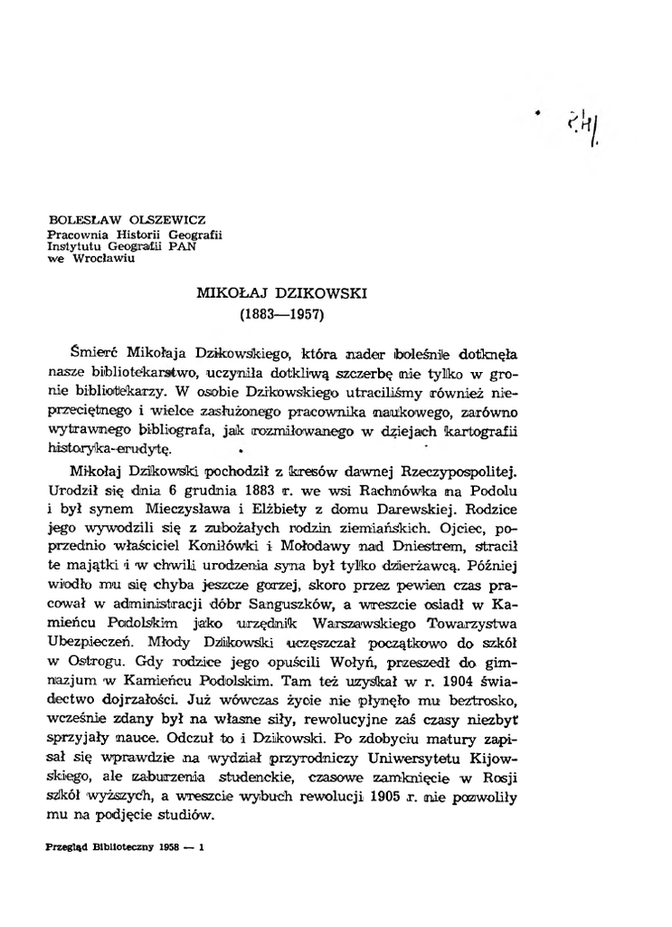 BOLESŁAW OLSZEW ICZ Pracow nia Historii Geografii Instytutu Geografii PAN w e W rocławiu MIKOŁAJ DZIKOWSKI (1883— 1957) Śmierć Mikołaja Dzikowskiego, która nader boleśnie dotknęła nasze bibliotekarstwo, uczyniła dotkliwą szczerbę nie tyllko w gro nie bibliotekarzy. W osobie Dzikowskiego utraciliśmy również nie przeciętnego i wielce zasłużonego pracownika naukowego, zarówno wytrawnego bibliografa, jak (rozmiłowanego w dziejach kartografii historyfca-erudytę. Mikołaj Dzikowski pochodził z kresów dawnej Rzeczypospolitej. Urodził się dnia 6 grudnia 1883 r. we wsi Rachnówka na Podolu i był synem Mieczysława i Elżbiety z domu Darewskiej. Rodzice jego wywodzili się z zubożałych rodzin ziemiańskich. Ojciec, po przednio właściciel Koniłówki i Mołodawy nad Dniestrem, stracił te majątki i w chwili urodzenia syna był tyllko dzierżawcą. Później wiodło mu się chyba jeszcze gorzej, skoro przez pewien czas pra cował w administracji dóbr Sanguszków, a wreszcie osiadł w Ka mieńcu Podolskim jako urzędnik Warszawskiego Towarzystwa Ubezpieczeń. Młody Dzikowski uczęszczał początkowo do szkół w Ostrogu. Gdy rodzice jego opuścili Wołyń, przeszedł do gim nazjum w Kamieńcu Podolskim. Tam też uzyskał w r. 1904 świa dectwo dojrzałości. Już wówczas żyoie nie płynęło mu beztrosko, wcześnie zdany był na własne siły, rewolucyjne zaś czasy niezbyt sprzyjały nauce. Odczuł to i Dzikowski. Po zdobyciu matury zapi sał się wprawdzie na wydział przyrodniczy Uniwersytetu Kijow skiego, ale zaburzenia studenckie, czasowe zamknięcie w Rosji szkół wyższych, a wreszcie wybuch rewolucji 1905 r. nie pozwoliły mu na podjęcie studiów. Przegląd Biblioteczny 1958 — 1 B O L E S Ł A W O L S Z E W IC Z W następnych latach — pisał w rękopiśmiennej autobiogra ficznej mota'tce1 — nie m ając środków d o utrzymania się na stu diach zmuszany byłem wystąpić z uniwersytetu i trudniłem się w latach 1906— 1909 korepetycjam i w rozmaitych m iejscowościach (w pięciu domach) jako „nauczyciel dom ow y” , chcąc zebrać środ ki na dalsze studia. W latach 1906— 1907 przebywałem w tym charakterze w Jerozolimie. Jesienią 1909 r., uzbierawszy widocznie stosowny fundusik, wsitąpił Dzikowski ma Uniwersytet Odeslki, ale już nie na wydział przyrodniczy, lecz na hlistoryczno-filologiczny, bardziej odpowiada jący jego ‘uzdolnieniom i zamiłowaniom. Do pracy zarobkowej mu siał jednak powrócić. W latach 1911— 13 'był iznów nauczycielem diomowym. Wykorzystywał jednak każdy pobyt w Odesie, aby uczestniczyć w ćwiczeniach, pilnie składał egzaminy i wiosną 1914 ;r. uniwersytet ukończył. Jesienią tegoż roku objął stanowisko nauczyciela łaciny w gimnazjum w Aleksamdrowsfcu (obecnym Zaporożu). Nie zagrzał tu miejsca. Już w styczniu następnego roku powołano go jako żołnierza pospolitego ruszania do wojska rosyj skiego i po trzymiesięcznym przeszkoleniu wysłano w randze cho rążego na front niemiecki. W ir. 1916 podczas wielkiego odwrotu armii rosyjskiej dosltał się Dzikowski do niewoli i do końca pierw szej wojny światowej przebywał w oficerskich obozach jenieckich. Następnie wstąpił do wojska polskiego, brał udział w walkach na froncie białoruskim i ukraińskim. Został wtedy odznaczony Krzy żem Walecznych. Zdemobilizowany w marcu 1921 r. w stopniu porucznika mógł wreszcie po siedmiu lataich znów powrócić do zajęć pedagogicz nych. Zrazu czynny był jako ziastępca inspektora szkolnego na po wiat wileńsko-trocki, następnie od lipca 1921 r. jako nauczyciel łaciny i historii w gimnazjum im. króla Zygmunta Augusta, a przez pewien czas również i w gimnazjum :im. Mickiewicza w Wilnie. Ale do pracy pedagogicznej nie miał woale Dzikowsiki zamiłowania. We wspomnianej notatce pisał: Wspomnienia ciężkich przeżyć w tułaczce p o różnych domach, jako korepetytor w w alce o zdobycie środków dla studiów na uniwersytecie, nie przyczyniały się d o pobudzenia chęci d o dal szej foellerki. Poza tym przerywane, niesystematyczne studia na 1 Uprzystępnienie mi tej notatki, doprowadzonej niestety (tylko d o r. 1940, zawdzięczam uprzejm ości p. d r Manii Puciiatowej, dyrektonkli B iblioteki Uni wersyteckiej w Toruniu. Zawdzięczam Jej (także inform acje o działalności Dzikowskiego w Toruniu. M IK O Ł A J D Z IK O W S K I 3 uniwersytecie, z powodu konieczności zdobycia środków na nie pnącą zarobkową nauczycielską, spraw iły, że uczułem potrzebę d o kształcania się. Ażeby mieć łatwy dostęp do książek i czasopism naukowych, powziął Dzikowski zamiar poświęcenia się 'bibliotekarstwu. N ie wiedziałem w ów czas — pisał — że praca w bibliotece nau kow ej nie w mmiejszym stopniu mliż praca nauczycielska w y m agać będzie oddania się je j p raw ie całktowidie. Że tak jest istotnie, ale że piracę bibliotekarza związać można najściślej z (pracą naukową, przekonał się później Dzikowski, będąc czyńmy przeszło ćwierć wieku w bibliotekarstwie. Działalność w tym nowym dla siebie zawodzie rozpoczął na początku 1924 r. Wówczas; za dynektorstwa Stefana Rygla, wstąpił w charakterze bezpłatnego wolontariusza do Uniwersyteckiej Biblioteki Publicznej w Wilnie. 1 lipca 1925 r. otrzymał tam nominację na asystenta bibliotecznego. Równocześnie zrzekł się Dzikowski 'stanowiska w gimnazjum, w którym uzyskał wtedy właśnie wyższy stopień służbowy, co do wodzi dosadnie, jak żywo pociągała go nauka. W tym pierwszym okresie pracy bibliotekarskiej powierzono mu w Bibliotece dział czasopism. Dział ten uporządkował, odpowiednio rozmieścił i skata logował. W r. 1927 opuścił jednak Dzikowski swe stanowisko w Biblio tece Uniwersyteckiej, a nawet i Wilno. Skłoniła go do tego nie możność uzyskania awansu. Niemniejszą 'rolę odegrała propozycja przejścia ma lepsze i kierownicze stanowisko w służbie samorządo wej, w Bibliotece M