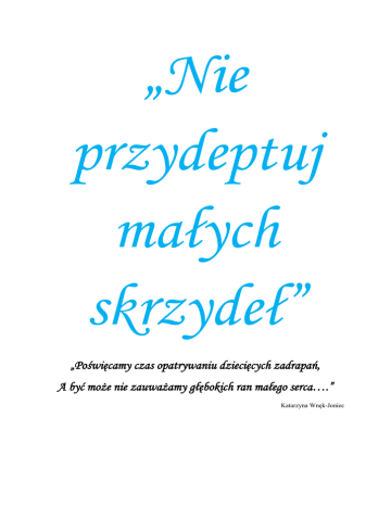„Nie przydeptuj małych skrzydeł” „Poświęcamy czas opatrywaniu dziecięcych zadrapań, A być może nie zauważamy głębokich ran małego serca….” Katarzyna Wnęk-Joniec Małe dziecko, by dobrze się rozwijało i wzrastało w poczuciu bezpieczeństwa, potrzebuje wsparcia i opieki ze strony dorosłych. Móc rozwinąć skrzydła, potrzebuje naszej mądrości. Niestety, często bywa to trudne, ponieważ każdy z nas popełnia błędy, zwykle z niewiedzy, zaniedbania, zmęczenia. Zdarza się, że nie wiemy jak reagować na burzliwe emocje małego człowieka. Popełniamy błędy, a one, niewyjaśnione, zostają gdzieś na dnie małego serca. Mały człowiek nie umie wyrazić i nazwać tego, co przeżywa, nie jest w stanie jasno opowiedzieć o swych potrzebach i oczekiwaniach. Przyjmuje wszystko takie, jakie jest: zdarzenia, słowa, czyny. Nie zna powodów naszych zachowań, nie umie ich prawidłowo ocenić i rozpoznać. Jednak je zapamiętuje. Chwile te właśnie powodują, że bardzo łatwo możemy utrwalić w dziecku poczucie odrzucenia, mniejszej wartości…. Jak temu zapobiec? Oto kilka prostych rad, które płyną prosto z serca dziecka.: 1. Nie porównuj mnie z innymi Nie wymagaj, żeby był taki jak inni. Pozwól mi być sobą. Pozwól bym swoje szczyty zdobywał w moim własnym tempie… Nie oczekuj, że będę jak Tomek czy Zuzia. Doskonale wiem, że inne, często dużo młodsze dzieci skaczą na basenie, występy publiczne to dla nich żaden problem, śmigają na rowerku dwukołowym, zostają z ochotą w przedszkolu..Ja natomiast wolę patrzeć niż szaleć. Czuję się bezpieczniej, gdy wokół mnie jest mniej osób. Może się zmienię, a może taki już zostanę… Widzę, że często Cię to złości. Domyślam się ,że chciałabyś, żebym był bardziej przebojowy, dzielny, głośny… Ale jestem Twoim dzieckiem, uczę się w swoim tempie, w odmiennym, nie lubię nowych sytuacji, to wcale nie znaczy, że jestem gorszy. Posiadam inne zalety, więc już nie porównuj mnie do nikogo. Każdy potrzebuje czasu, by oswoić świat, który poznaje. Bądź przy mnie, potrzebuję tego. Proszę pozwól mi być sobą… 2. Kochaj mnie i mów mi o tym Bardzo lubię słuchać, gdy mówisz mi, że mnie kochasz. To wcale nie jest dla mnie takie oczywiste. I nie zawsze jest pewne. Każdy z nas potrzebuje dobrych, ciepłych słów, by żyć, by rozwijać skrzydła. Lubię dostawać prezenty, podarunki, ale wolę słowo: KOCHAM CIĘ. To słowa klucze. Gdy wypowiadasz te słowa, wszystko staje się prostsze, a ja czuję się bezpiecznie. Opowiadaj mi o ty, że jestem ważny i kochany. Nauczysz mnie mówić otwarcie o swoich uczuciach. Jestem dzieckiem, doświadczając robię wiele rzeczy, których nie akceptujesz, czasem więc podnosisz głos, czasem każesz odejść. Wtedy tracę pewność, co czujesz. To boli, bo myślę, że już mnie nie kochasz. Moja pewność siebie upada we mnie jak przewracane klocki domina… Nie ucz, że kochasz mnie tylko wtedy, gdy jestem posłuszny, i dlatego, że zachowuję się dokładnie tak, jak oczekujesz. Chcę być sobą, chcę się rozwijać i mądrze dorastać, a to czasami oznacza sprzeciw bunt… Przypominaj mi o tym, że mnie kochasz. Bez tych słów trudno wzlatywać… 3. Przygotuj mnie na zmiany Nie rób wielkiego wydarzenia ze zmiany w moim życiu. Nie rób proszę, sensacji z pójścia do żłobka, przedszkola, zerówki, szkoły… Zamieszanie wokół nie dodaje mi sił. Raczej zwiększa mój lęk przed tym, co będzie. To awans, jednak niesie niewiadomą. Jeżeli to nieznane, jest takie ogroooomne , to- może wcale – nie chcę żadnej zmiany. Wiem, że chcesz mi pomóc przygotować się na nowe doświadczenia. Nie obiecuj mi jednak, że na pewno- będzie bardzo dobrze- bo nie wiesz, jak będzie. Może nie lubię zmian- i mówienie o nich tylko nasila moje lęki. Opowiadając mi o tym, co będzie, nie używaj wielu przymiotników. Nie roztaczaj cudownych wizji. Nie wplataj słów takich jak: super, fajnie, podejdź do tego spokojnie, naturalnie, zwyczajnie. Codziennie. Jesteś dorosły, dawno chodziłeś do przedszkola, szkoły, nie wiesz jak będzie. Pozwól mi na moje własne przeżycia i doświadczenia. Zapytaj co ja czuję, narysuj, że wybrałeś dla mnie przytulne miejsce, Może razem narysujemy. Nie koloruj, nie ubarwiaj, przygotuj mnie mądrze na zmiany. W ten sposób sprawisz, że będę się powolutku przygotowywał do dużych obowiązków i odpowiedzialności za nie. Uniknę też wielu rozczarowań. 4. Przytulaj mnie Przytulaj mnie choć jestem starszym bratem…. Może chodzę do szkoły, mam młodszą siostrę, którą wciąż przytulasz, bierzesz na kolana. Mówisz: ona jest malutka, nie obchodzi mnie to, że jest mała. Ja ma 10 lat, ale też potrzebuję się przytulić. Może zamykam się i z nikim nie rozmawiam..może buntuję się otwarcie, kłócę się o wszystko, nie słucham nikogo. A ja czasem czuję się po prostu bardzo niepotrzebny i samotny. Bo długo byłaś tylko dla mnie… Przytulaj mnie, przecież wciąż jestem Twoim dzieckiem. Daj buziaka, potargaj włosy, otocz ramieniem. Powiesz mi w ten sposób, że jestem ważny, że nadal jest dla mnie miejsce na Twoich kolanach i w Twoim sercu. Pokażesz mi, że nadal jestem potrzebny. Przytulaj mnie, a efekt Cię zadziwi. 5. Nie mów o mnie źle Nie rozmawiaj z kimś źle o mnie- w mojej obecności. Nie opowiadaj o rzeczach, których nie potrafiłem, nie umiem zrobić, kiedy ja stoję tuż obok mnie… Kiedy martwisz się, że nie używam nocnika, że nie potrafię czytać, a inni już czytają, ja to wszystko słyszę..Wtedy czuję się bardzo źle. Mogę jeszcze nie mówić, ale słyszę i rozumiem. Nie omawiaj z sąsiadką moich niepowodzeń. Jestem człowiekiem- okaż mi więc szacunek taki sam jak okazujesz innym, swoim znajomym. Proszę, nie mów niedobrych rzeczy o mnie do innych. Proszę także, nie chwal mnie zbyt często nadmiernie. Nie rób ze mnie p