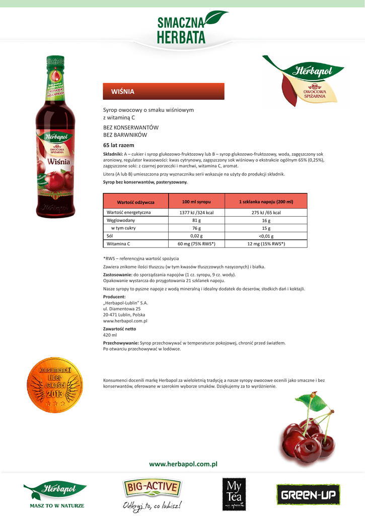 WIŚNIA Syrop owocowy o smaku wiśniowym z witaminą C BEZ KONSERWANTÓW BEZ BARWNIKÓW 65 lat razem Składniki: A – cukier i syrop glukozowo-fruktozowy lub B – syrop glukozowo-fruktozowy, woda, zagęszczony sok aroniowy, regulator kwasowości: kwas cytrynowy, zagęszczony sok wiśniowy o ekstrakcie ogólnym 65% (0,25%), zagęszczone soki: z czarnej porzeczki i marchwi, witamina C, aromat. Litera (A lub B) umieszczona przy wyznaczniku serii wskazuje na użyty do produkcji składnik. Syrop bez konserwantów, pasteryzowany. Wartość odżywcza Wartość energetyczna 100 ml syropu 1 szklanka napoju (200 ml) 1377 kJ /324 kcal 275 kJ /65 kcal Węglowodany 81 g 16 g w tym cukry 76 g 15 g 0,02 g <0,01 g 60 mg (75% RWS*) 12 mg (15% RWS*) Sól Witamina C *RWS – referencyjna wartość spożycia Zawiera znikome ilości tłuszczu (w tym kwasów tłuszczowych nasyconych) i białka. Zastosowanie: do sporządzania napojów (1 cz. syropu, 9 cz. wody). Opakowanie wystarcza do przygotowania 21 szklanek napoju. Nasze syropy to pyszne napoje z wodą mineralną i idealny dodatek do deserów, słodkich dań i koktajli. Producent: „Herbapol-Lublin” S.A. ul. Diamentowa 25 20-471 Lublin, Polska www.herbapol.com.pl Zawartość netto 420 ml Przechowywanie: Syrop przechowywać w temperaturze pokojowej, chronić przed światłem. Po otwarciu przechowywać w lodówce. Konsumenci docenili markę Herbapol za wieloletnią tradycję a nasze syropy owocowe ocenili jako smaczne i bez konserwantów, oferowane w szerokim wyborze smaków. Dziękujemy za to wyróżnienie. www.herbapol.com.pl