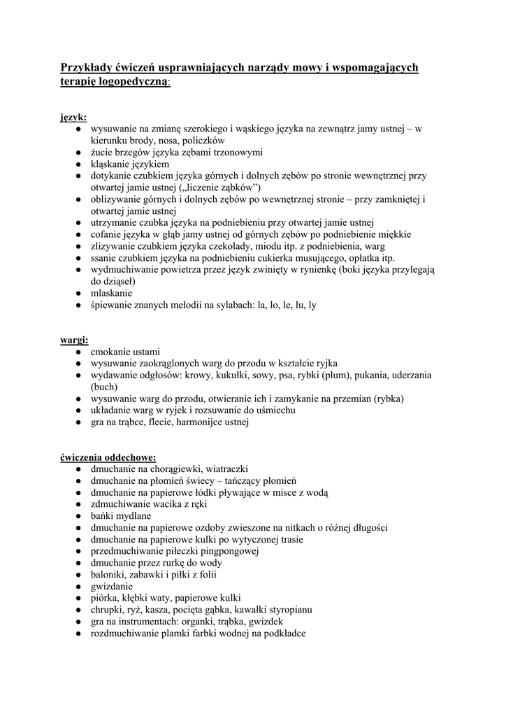 Przykłady ćwiczeń usprawniających narządy mowy i wspomagających terapię logopedyczną: język: wysuwanie na zmianę szerokiego i wąskiego języka na zewnątrz jamy ustnej – w kierunku brody, nosa, policzków żucie brzegów języka zębami trzonowymi kląskanie językiem dotykanie czubkiem języka górnych i dolnych zębów po stronie wewnętrznej przy otwartej jamie ustnej („liczenie ząbków”) oblizywanie górnych i dolnych zębów po wewnętrznej stronie – przy zamkniętej i otwartej jamie ustnej utrzymanie czubka języka na podniebieniu przy otwartej jamie ustnej cofanie języka w głąb jamy ustnej od górnych zębów po podniebienie miękkie zlizywanie czubkiem języka czekolady, miodu itp. z podniebienia, warg ssanie czubkiem języka na podniebieniu cukierka musującego, opłatka itp. wydmuchiwanie powietrza przez język zwinięty w rynienkę (boki języka przylegają do dziąseł) mlaskanie śpiewanie znanych melodii na sylabach: la, lo, le, lu, ly wargi: cmokanie ustami wysuwanie zaokrąglonych warg do przodu w kształcie ryjka wydawanie odgłosów: krowy, kukułki, sowy, psa, rybki (plum), pukania, uderzania (buch) wysuwanie warg do przodu, otwieranie ich i zamykanie na przemian (rybka) układanie warg w ryjek i rozsuwanie do uśmiechu gra na trąbce, flecie, harmonijce ustnej ćwiczenia oddechowe: dmuchanie na chorągiewki, wiatraczki dmuchanie na płomień świecy – tańczący płomień dmuchanie na papierowe łódki pływające w misce z wodą zdmuchiwanie wacika z ręki bańki mydlane dmuchanie na papierowe ozdoby zwieszone na nitkach o różnej długości dmuchanie na papierowe kulki po wytyczonej trasie przedmuchiwanie piłeczki pingpongowej dmuchanie przez rurkę do wody baloniki, zabawki i piłki z folii gwizdanie piórka, kłębki waty, papierowe kulki chrupki, ryż, kasza, pocięta gąbka, kawałki styropianu gra na instrumentach: organki, trąbka, gwizdek rozdmuchiwanie plamki farbki wodnej na podkładce