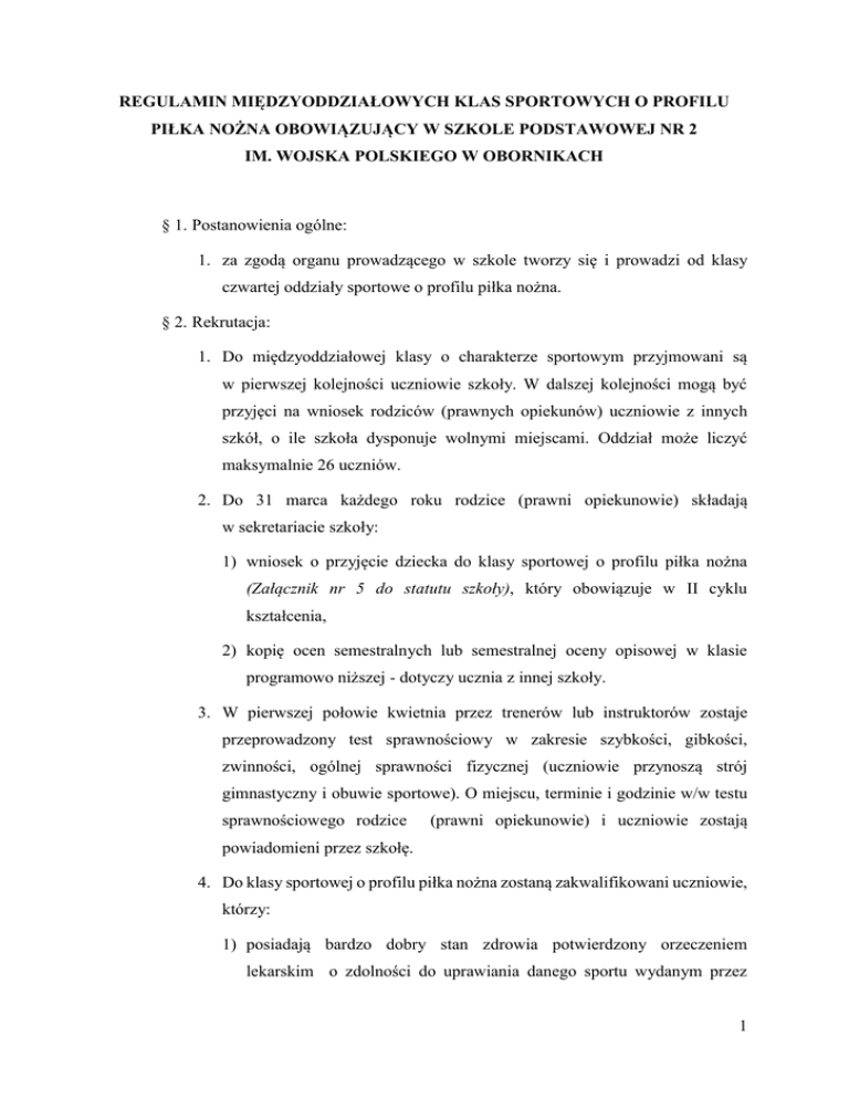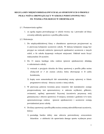 REGULAMIN MIĘDZYODDZIAŁOWYCH KLAS SPORTOWYCH O PROFILU PIŁKA NOŻNA OBOWIĄZUJĄCY W SZKOLE PODSTAWOWEJ NR 2 IM. WOJSKA POLSKIEGO W OBORNIKACH § 1. Postanowienia ogólne: 1. za zgodą organu prowadzącego w szkole tworzy się i prowadzi od klasy czwartej oddziały sportowe o profilu piłka nożna. § 2. Rekrutacja: 1. Do międzyoddziałowej klasy o charakterze sportowym przyjmowani są w pierwszej kolejności uczniowie szkoły. W dalszej kolejności mogą być przyjęci na wniosek rodziców (prawnych opiekunów) uczniowie z innych szkół, o ile szkoła dysponuje wolnymi miejscami. Oddział może liczyć maksymalnie 26 uczniów. 2. Do 31 marca każdego roku rodzice (prawni opiekunowie) składają w sekretariacie szkoły: 1) wniosek o przyjęcie dziecka do klasy sportowej o profilu piłka nożna (Załącznik nr 5 do statutu szkoły), który obowiązuje w II cyklu kształcenia, 2) kopię ocen semestralnych lub semestralnej oceny opisowej w klasie programowo niższej - dotyczy ucznia z innej szkoły. 3. W pierwszej połowie kwietnia przez trenerów lub instruktorów zostaje przeprowadzony test sprawnościowy w zakresie szybkości, gibkości, zwinności, ogólnej sprawności fizycznej (uczniowie przynoszą strój gimnastyczny i obuwie sportowe). O miejscu, terminie i godzinie w/w testu sprawnościowego rodzice (prawni opiekunowie) i uczniowie zostają powiadomieni przez szkołę. 4. Do klasy sportowej o profilu piłka nożna zostaną zakwalifikowani uczniowie, którzy: 1) posiadają bardzo dobry stan zdrowia potwierdzony orzeczeniem lekarskim o zdolności do uprawiania danego sportu wydanym przez 1 lekarza specjalistę w dziedzinie medycyny sportowej lub innego uprawnionego lekarza, zgodnie z przepisami o zdolności do uprawiania danego sportu przez dzieci i młodzież do ukończenia 21 roku życia, 2) uzyskali pozytywne wyniki prób sprawności fizycznej na warunkach ustalonych przez Polski Związek Piłki Nożnej. 3) osiągają pozytywne wyniki w nauce i zachowaniu, 4) wykazują zainteresowania sportowe, 5) posiadają pisemną zgodę rodziców (prawnych opiekunów) na uczęszczanie kandydata do oddziału. 5. Lista uczniów zakwalifikowanych i przyjętych do klasy sportowej o profilu piłka nożna zostaje ogłoszona w terminie do 15 maja. § 3. Szkolna Komisja Rekrutacyjna 1. W celu przeprowadzenia rekrutacji do klasy sportowej o profilu piłka nożna dyrektor szkoły powołuje w terminie do 1 kwietna Szkolną Komisję Rekrutacyjną. 2. W skład komisji wchodzą: 1) wicedyrektor szkoły lub inny nauczyciel jako przewodniczący, 2) dwóch nauczycieli wychowania fizycznego, instruktorów lub trenerów piłki nożnej, 3) pedagog szkolny. 3. Do zadań Szkolnej Komisji Rekrutacyjnej należy: 1) prowadzenie postępowania rekrutacyjnego zgodnie z zasadami określonymi w statucie szkoły, 2) przeprowadzenie testu sprawności fizycznej, 3) ustalenie listy uczniów przyjętych do klasy sportowej o profilu piłka nożna, 4) sporządzenie protokołów postępowania rekrutacyjnego. 2 § 4. Ustalenie uczniów przyjętych do klasy sportowej. 1. W przypadku większej liczby kandydatów spełniających warunki, o których mowa w § 2 pkt. 4. niż liczba wolnych miejsc w szkole i oddziale, na pierwszym etapie postępowania są brane pod uwagę wyniki prób sprawności fizycznej. 2. W terminie 7 dni od dnia podania do informacji publicznej uczniów przyjętych i nieprzyjętych, rodzic może wystąpić do komisji rekrutacyjnej z wnioskiem o sporządzenie uzasadnienia odmowy przyjęcia dziecka do międzyoddziałowej klasy sportowej. 3. Komisja rekrutacyjna sporządza pisemne uzasadnienie w terminie 5 dni. 4. Od decyzji Szkolnej Komisji Rekrutacyjnej rodzicowi (prawnemu opiekunowi) przysługuje prawo odwołania do dyrektora szkoły w terminie 7 dni od dnia otrzymania uzasadnienia. 5. Dyrektor szkoły w ciągu 7 dni rozpatruje odwołanie i pisemnie odpowiada stronie. 6. Na decyzję dyrektora szkoły służy skarga do sądu administracyjnego. § 5. Podstawowe obowiązki ucznia klasy o profilu piłka nożna. 1. Uczeń klasy sportowej o profilu piłka nożna jest zobowiązany do: 1) przestrzegania statutu szkoły i innych regulaminów obowiązujących w szkole, 2) uczestniczenia w zawodach w piłce nożnej szkolnych i międzyszkolnych oraz pozostałych zawodach sportowych, w których bierze udział szkoła, 3) przestrzegania zasad BHP w trakcie trwania zajęć, troski o sprzęt sportowy oraz przestrzegania regulaminu korzystania z obiektów sportowych. 2. Za złe zachowanie lub niezadowalające wyniki w nauce uczeń klasy sportowej o profilu piłka nożna może być zawieszony przez dyrektora szkoły 3 w zawodach sportowych do czasu poprawy – na wniosek instruktora lub trenera w porozumieniu z wychowawcą klasy. 3. Uczeń klasy sportowej sprawiający szczególne trudności wychowawcze, negatywnie wpływający na pozostałych uczniów na wniosek instruktora, trenera lub wychowawcy klasy, za zgodą Rady Pedagogicznej może zostać skreślony przez dyrektora z listy uczniów międzyoddziałowej klasy sportowej. § 2. W przypadku wystąpienia wolnych miejsc w międzyoddziałowej klasie o profilu piłka nożna istnieje możliwość przeprowadzenia dodatkowego postępowania rekrutacyjnego w późniejszym terminie. § 3. Rodzice (opiekunowie prawni) uczniów przyjętych do klasy sportowej o profilu piłka nożna są zobowiązani do zakupu stroju sportowego (dres, obuwie sportowe, koszulka, spodenki). 4