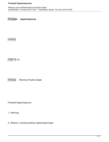 Protokół Dyplomatyczny Wpisany przez Elżbieta Woźnica Paulina Zajda poniedziałek, 15 marca 2010 19:47 - Poprawiony wtorek, 16 marca 2010 00:30 Protokół dyplomatyczny Analiza 2009-12-16 Elżbieta Woźnica Paulina Zajda Protokół Dyplomatyczny 1. Definicja 2. Historia i rozwój protokołu dyplomatycznego 1 / 21 Protokół Dyplomatyczny Wpisany przez Elżbieta Woźnica Paulina Zajda poniedziałek, 15 marca 2010 19:47 - Poprawiony wtorek, 16 marca 2010 00:30 3. Zakres protokołu dyplomatycznego 3.1 Zasada pierwszeństwa 3.2 Ceremoniał 3.3 Misje dyplomatyczne 3.3.1 Personel misji dyplomatycznych 4. Protokół dyplomatyczny w Polsce 4.1 Historia protokołu dyplomatycznego w Polsce 4.2 Współczesny polski protokół 4.3 Komórki organizacyjne polskiego Protokołu Dyplomatycznego 5. Wpadki protokołu dyplomatycznego „Niegdyś bywało tak, że do sali obrad wykuwano tyleż drzwi, ilu było dyplomatów, by zapobiec sporom, kto wejdzie pierwszy. Dziś te zawiłe kwestie rozstrzyga protokół dyplomatyczny” [1] . Choć droga do wypracowania i przyjęcia norm, które regulowałby kwestie związane z dyplomacją i stosunkami międzypaństwowymi, a właściwie między uczestnikami tych stosunków, była długa i niejednoznaczna, jako punkt wyjścia rozważań w niniejszej pracy przyjmiemy próbę zdefiniowania samego pojęcia protokół dyplomatyczny. W dalszej części 2 / 21 Protokół Dyplomatyczny Wpisany przez Elżbieta Woźnica Paulina Zajda poniedziałek, 15 marca 2010 19:47 - Poprawiony wtorek, 16 marca 2010 00:30 zajmiemy się z natomiast jego historia, zakresem oraz statusem w Polsce. A na koniec poruszymy błędy mogące wyniknąć przy stosowaniu protokołu dyplomatycznego. 1. Definicja Zakres pojęciowy protokołu dyplomatycznego obejmuje takie zagadnienia jak: ceremoniał państwowy i dyplomatyczny, zasady savoir-vivre’u, zasady organizacji życia dyplomatycznego (wyjazdy, przyjęcia, przyjmowanie gości , pierwszeństwo, stroje, czy też w ymianę korespondencji ) [2] . Na tej podbudowie możemy doszukać się definicji mówiących, że protokół dyplomatyczny to: „ ogół prawideł i zasad postępowania i zachowania się, przyjęty w stosunkach międzynarodowych; ceremoniał dyplomatyczny” [3] lub też: „fr. protocole diplomatique; ang. diplomatic protocole - ogólnie oznacza zbiór reguł normujących porządek w oficjalnym obrocie dyplomatycznym będący zarazem całością technik pracy służb zagranicznych, których zadaniem jest stworzenie w stosunkach międzypaństwowych klimatu szacunku oraz wzajemnego poszanowania. Jest on narzędziem polityki zagranicznej państwa i służy do przenoszenia istotnych politycznie treści za pośrednictwem jego wysoce sformalizowanego rytuału i języka” [4] . Jednak najszerszą i najpełniejszą wydaje się być definicja przedstawiona przez panów Ikanowicza i Piekarskiego mówiąca, że: „ Protokół dyplomatyczny określa reguły postępowania i zachowania dyplomaty, normy obowiązujące w kontaktach urzędowych z władzami państwa jak również we wzajemnych stosunkach między placówkami dyplomatycznymi innych państw w danej stolicy. Protokół dyplomatyczny reguluje wzajemne kontakty szefów państw jak i osób reprezentujących dane państwo, a także instytucji i urzędów. Rozwiązuje wiele na pozór formalnych kwestii proceduralnych, które w przeszłości niejednokrotnie doprowadzały do powstania konfliktów międzynarodowych, jak również ułatwia zbliżenie i prowadzenie dialogu. Pozwala także na wyrażenie niezadowolenia czy dezaprobaty bez narażania się na otwarty konflikt” [5] . 3 / 21 Protokół Dyplomatyczny Wpisany przez Elżbieta Woźnica Paulina Zajda poniedziałek, 15 marca 2010 19:47 - Poprawiony wtorek, 16 marca 2010 00:30 2. Historia i rozwój protokołu dyplomatycznego Z protokołem, zwanym w przeszłości ceremoniałem dworskim lub etykietą dworską spotykamy się od zarania dziejów. Historia dyplomacji i protokółu dyplomatycznego wiąże się z powstaniem państw i potrzebą utrzymywania stosunków oraz rozwiązywania konfliktów między nimi. Instytucja posłów była znana już w starożytnej Grecji, podzielonej na wiele małych państw-miast wzajemnie wojujących i negocjujących zawarcie pokoju. Posłami byli kapłani lub wybitni obywatele, filozofowie, poeci, a także kupcy. Oznaką posła była różdżka oliwna lub laurowa, zwieńczona dwoma wężami, co było symbolem roztropności i chytrości. Posłom w ich misji towarzyszyli heroldowie, a rokowania obok kwestii związanych z pokoje i odszkodowaniem za zniszczenia wojenne obejmowały także kwestię wymiany jeńców i pochówku zabitych. Poseł posiadał listy uwierzytelniające, które składał w urzędzie zajmującym się sprawami zagranicznymi; miał także instrukcje postępowania, spisane na zwojach z papirusu lub złączonych tabliczkach, zwanych diploma ,z czego wywodzą się wyrazy dyplom i dyplomacja [6] . Z kolei w starożytnym Rzymie istniało 20-osobowe kolegium fecjałów, powołane za czasów mitycznego władcy Numy Pompiliusza, następcy założyciela Rzymu Romulusa. Fecjałowie byli kapłanami nadzorującymi ceremoniał związany z przyjmowaniem i wysyłaniem posłów, niezwykle bogaty i pełen ściśle przestrzeganych form. Poselstwa państw zaprzyjaźnionych witano już na granicy, zapewniając im eskortę aż do miasta, gdzie gości umieszczano w reprezentacyjnych kwaterach. Podejmowano ich niezwykle uroczyście, wyprawiano uczty oraz igrzyska. Podczas uczty stojący na czele poselstwa zajmował miejsce honorowe, tuż obok gospodarza. Posłowie brali udział w specjalnej sesji senatu. Następowała również wymiana hojnych darów [7] . 4 / 21 Protokół Dyplomatyczny Wpisany przez Elżbieta Woźnica Paulina Zajda poniedziałek, 15 marca 2010 19:47 - Poprawiony wtorek, 16 marca 2010 00:30 Szczególnie rozwinięta była dyplomacja i towarzyszący jej protokół w okresie Cesarstwa Bizancjum (395-1453