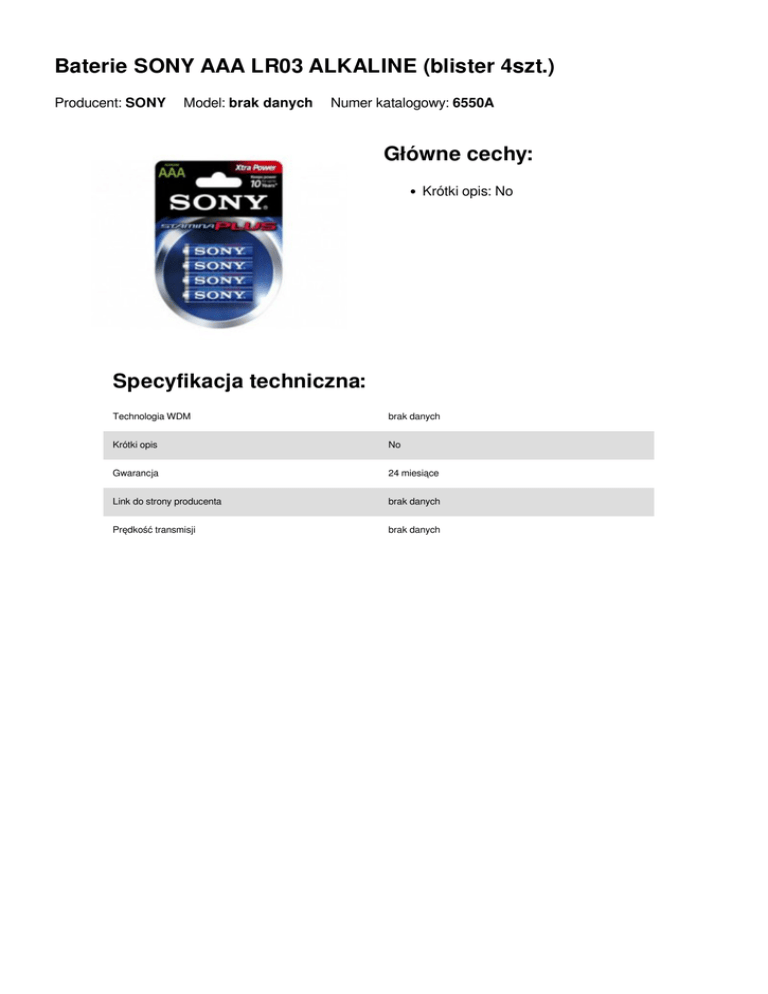 Baterie SONY AAA LR03 ALKALINE (blister 4szt.) Producent: SONY Model: brak danych Numer katalogowy: 6550A Główne cechy: Krótki opis: No Specyfikacja techniczna: Technologia WDM brak danych Krótki opis No Gwarancja 24 miesiące Link do strony producenta brak danych Prędkość transmisji brak danych